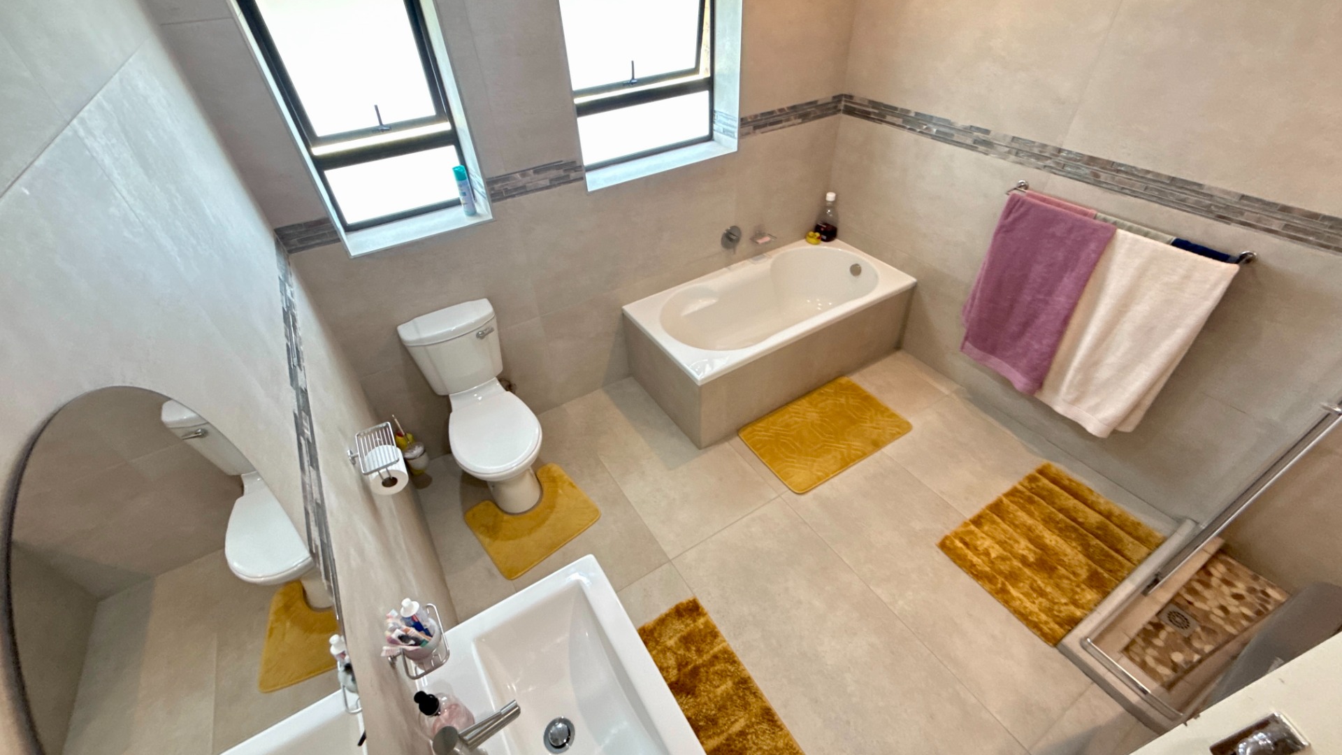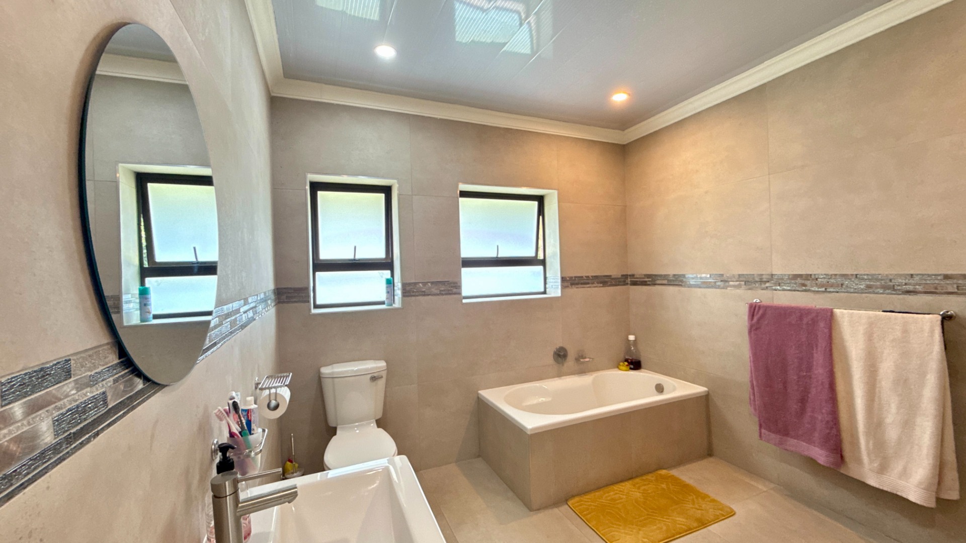 - Modern common bathroom with both bath and shower