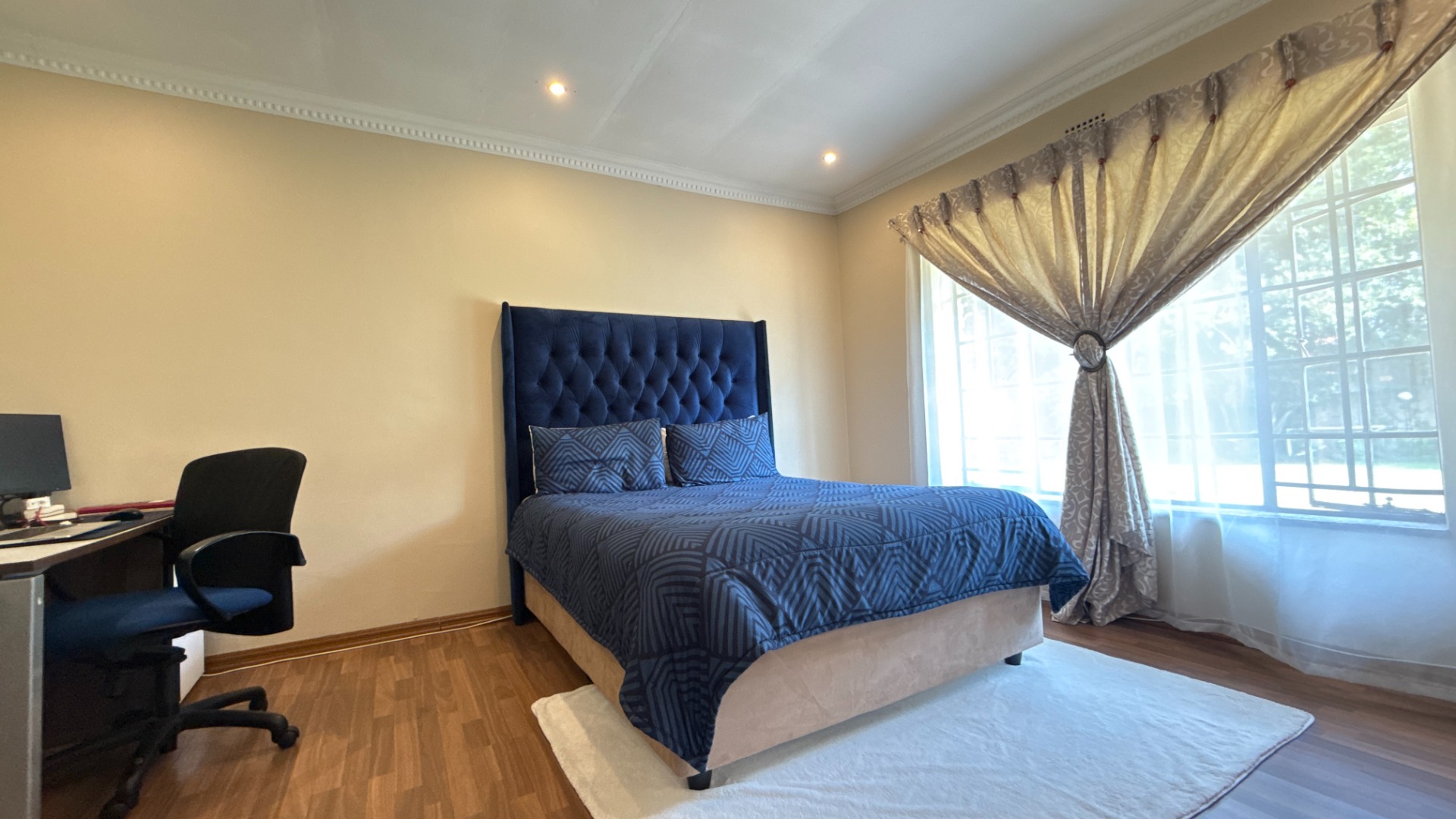 - Four spacious bedrooms with laminate wood flooring