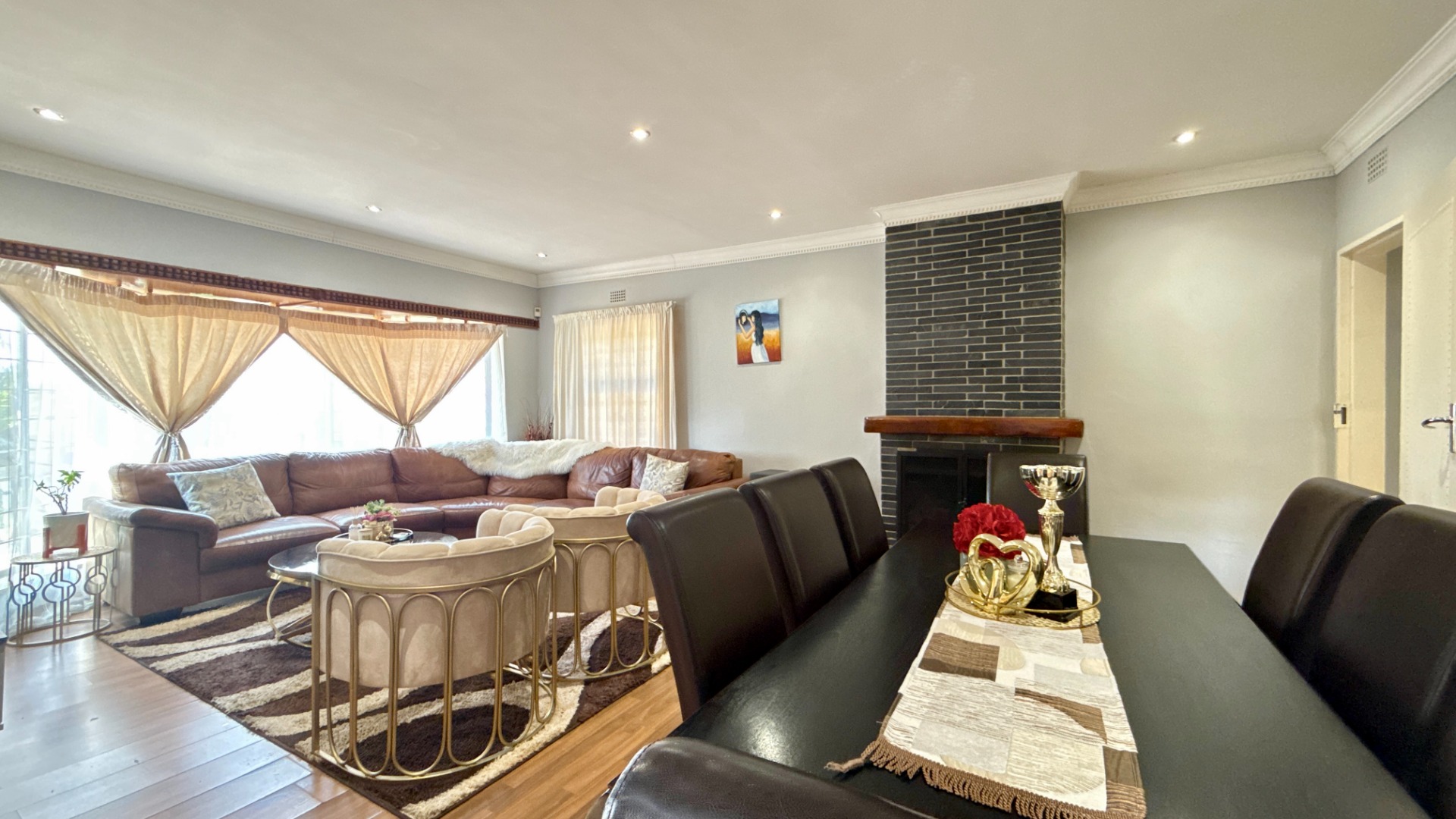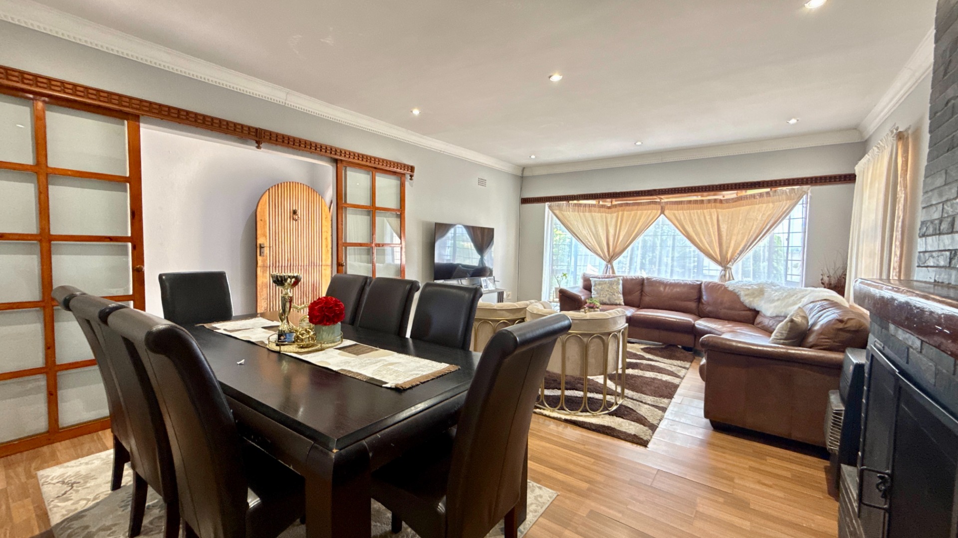 As showcased in the images, this well-maintained and generously proportioned family home offers a warm, inviting layout with excellent natural light throughout. The open-plan lounge and dining area forms the heart of the home, enhanced by a cozy fireplace and elegant bay windows that overlook the garden, creating a comfortable space for everyday living and entertaining.