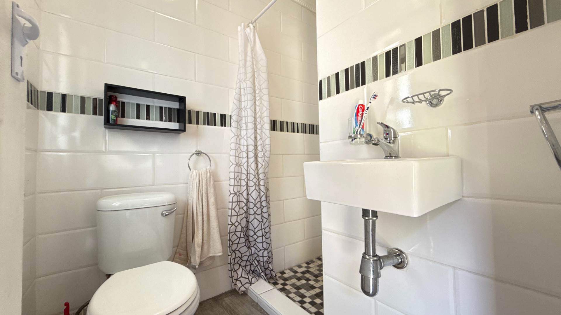 - Modern common bathroom with both bath and shower