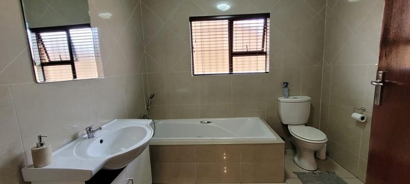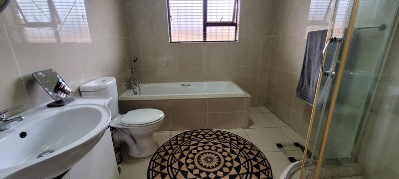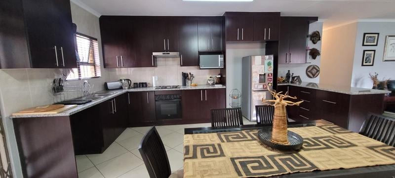 Includes 2 modern bathrooms with both bath and shower options. The kitchen features dark wood cabinetry, granite countertops, under-counter oven, 4-plate hob, extractor fan, and space for a double-door fridge. Spacious lounge and separate dining area with large tiles and blinds.