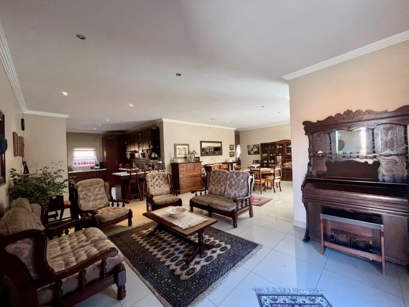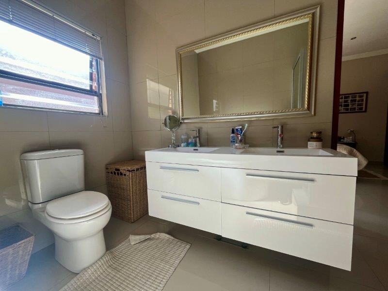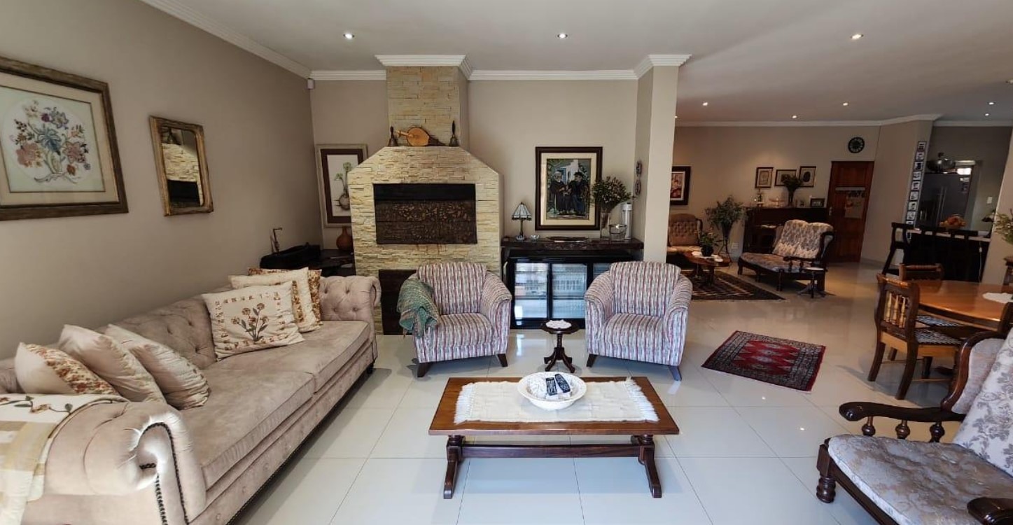The modern caesar stone counter kitchen with gas hob is a culinary playground for the avid chef with ample cupboard and appliance room and separate scullery to keep it organized; a breakfast nook for your morning coffee and flowing seamlessly to the living areas. The two lounges and dinning spaces, one with a cozy fireplace and bathed in natural light filtering through the large sliding doors and windows offer an harmonious blend of an open plan layout and the perfect setting to relax and entertain guests.