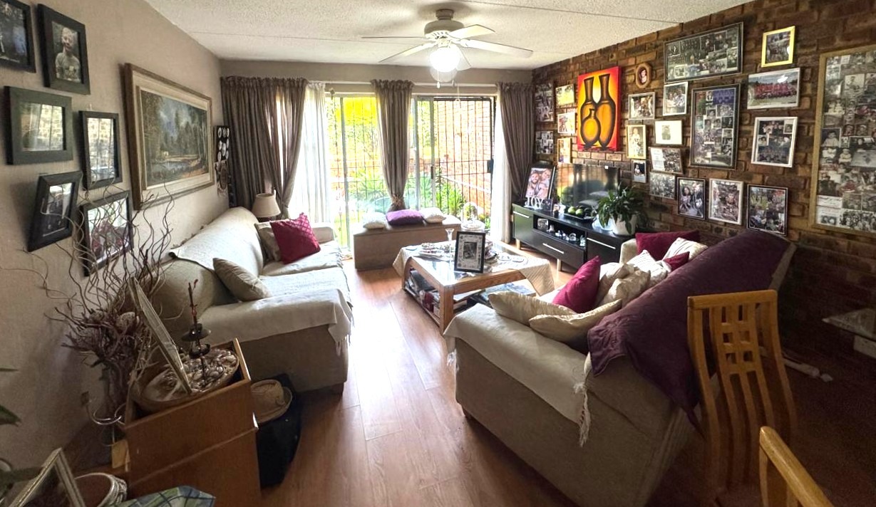 Discover comfortable living in this 82 sqm apartment located within a secure complex in Eastleigh, Edenvale. The interior features an inviting open-plan living and dining area, enhanced by durable wood-look laminate flooring and a distinctive exposed brick accent wall, adding character to the space. Large sliding glass doors provide abundant natural light and lead directly to a private patio, perfect for outdoor relaxation. The functional kitchen is equipped with ample cream cabinetry, wood-look countertops, a double sink, and an integrated washing machine, all benefiting from natural light and an architectural arched brick opening. This apartment offers two well-proportioned bedrooms, both featuring wood-look laminate flooring and ceiling fans for comfort. The main bedroom includes an en-suite bathroom, while a second bathroom serves the additional bedroom and guests, providing practical living arrangements. Built-in wardrobes offer convenient storage solutions. Residents can enjoy a range of communal amenities designed for a relaxed lifestyle. The complex boasts a lush, well-maintained garden area, a refreshing swimming pool, and a communal braai area, ideal for entertaining. One dedicated parking bay is allocated to the unit. Security is a priority within this complex, featuring 24-hour security, a security post, access gates, and a totally walled perimeter, ensuring peace of mind for all residents. The brick exterior and attractive landscaping contribute to the property's kerb appeal. Situated in the suburban area of Eastleigh, Edenvale, this property offers convenient metropolitan living with easy access to local amenities and transport routes. Key Features: * 2 Bedrooms, 2 Bathrooms (1 en-suite) * 82 sqm Floor Size * Open-plan living and dining area * Private patio * Communal swimming pool * Communal garden and braai area * 24-hour security complex * One dedicated parking bay