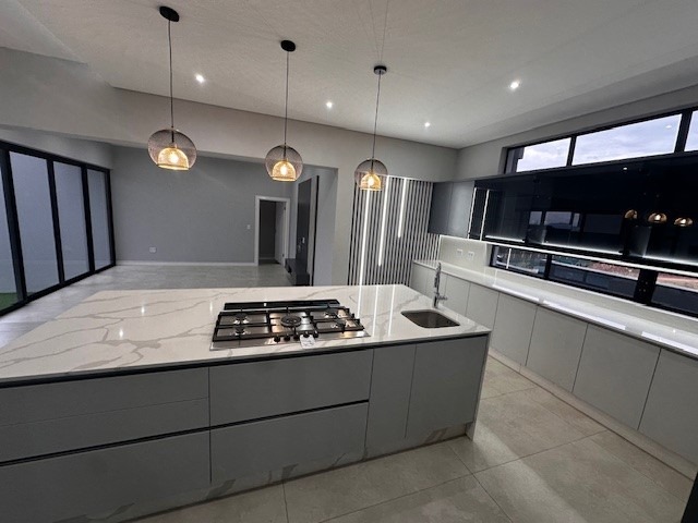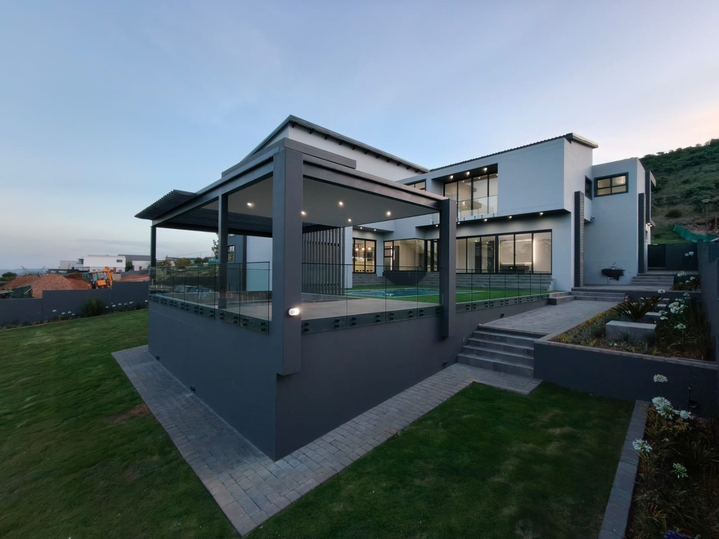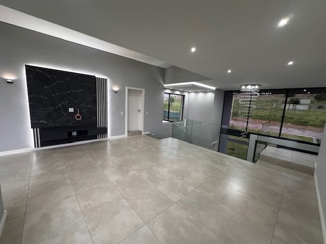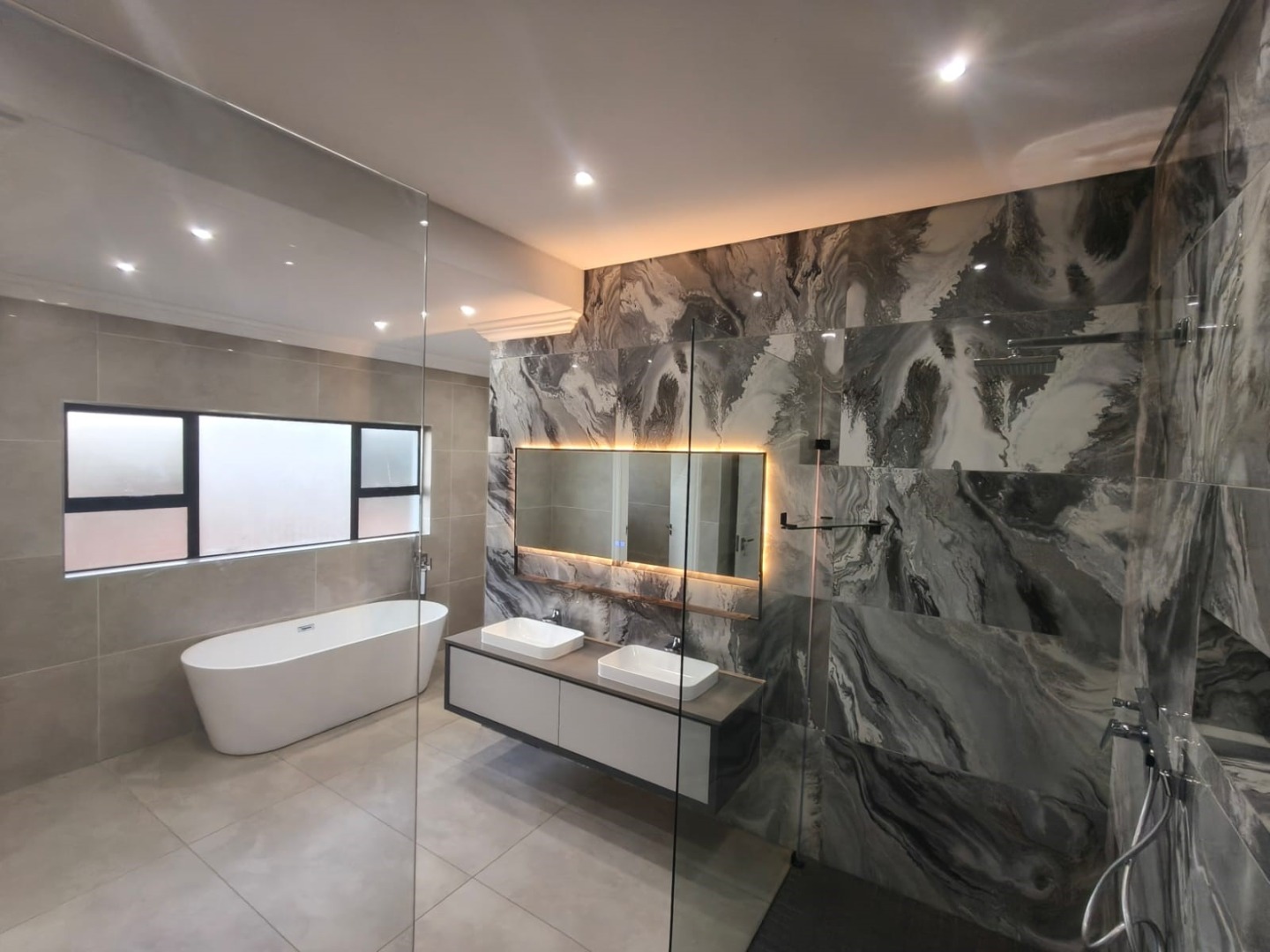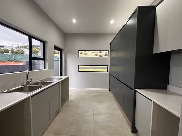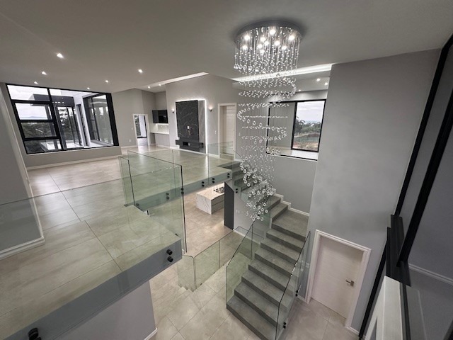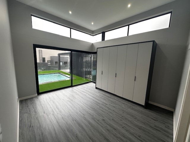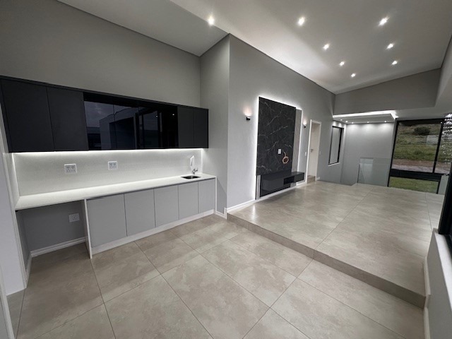 Discover an architectural masterpiece nestled within the prestigious Eye Of Africa Estate, Eikenhof, South Africa. This contemporary residence, spanning an impressive 580 sqm on a 1208 sqm erf, captivates with its sleek lines, expansive glass facades, and sophisticated design, promising an unparalleled living experience from the moment of arrival. The striking exterior, complemented by elegant lighting and minimalist landscaping, sets a tone of refined luxury.