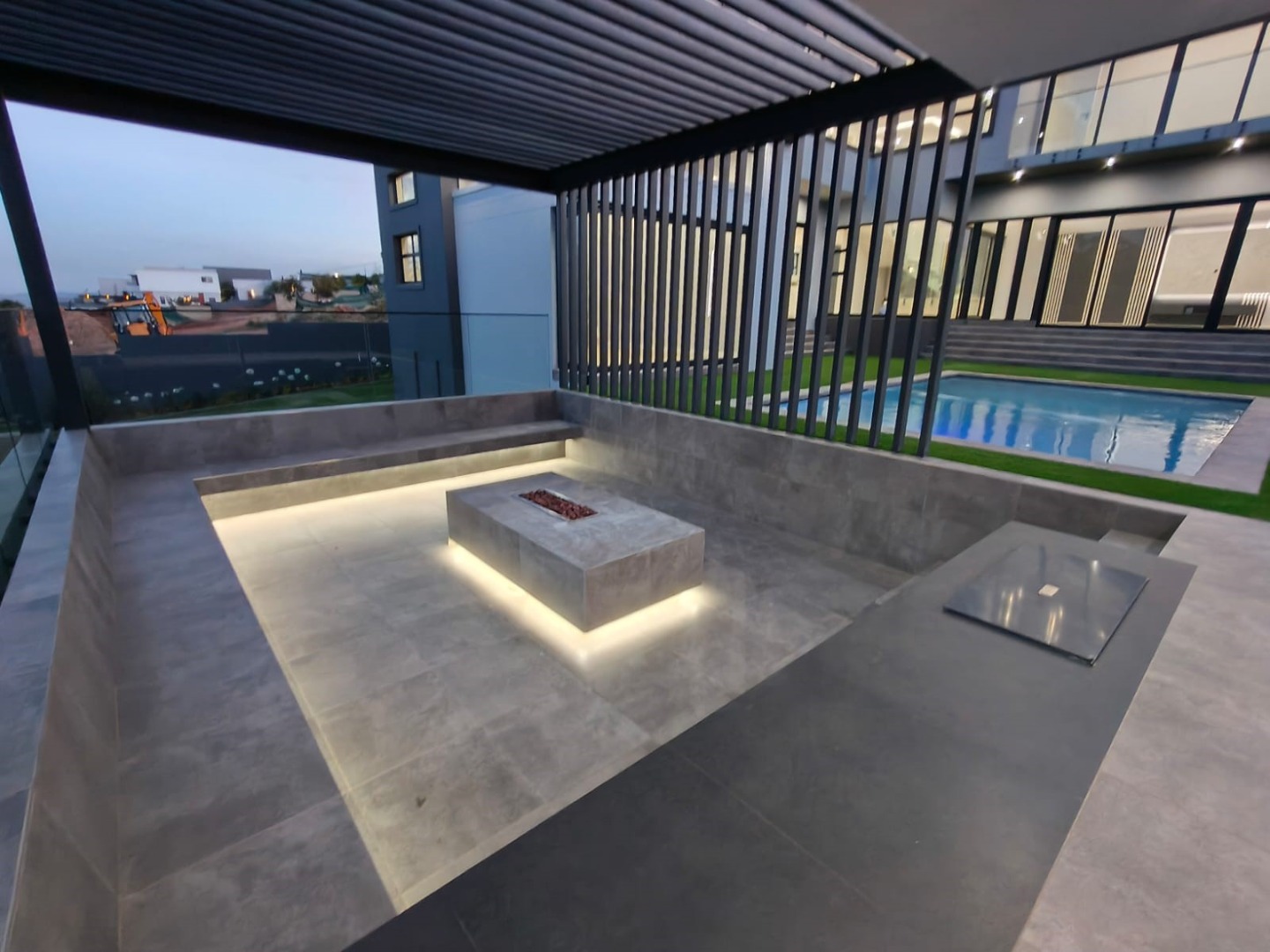 Outdoor living is elevated to an art form with a private swimming pool and spa pool, framed by elegant glass balustrades. Multiple entertainment areas include a generous patio, a private balcony, a built-in braai, and a chic fire pit with integrated seating, perfect for al fresco gatherings. The meticulously maintained garden, featuring an irrigation system and artificial turf, offers scenic views and a tranquil escape. Practicality is assured with three garages and six parking spaces, alongside dedicated domestic rooms.