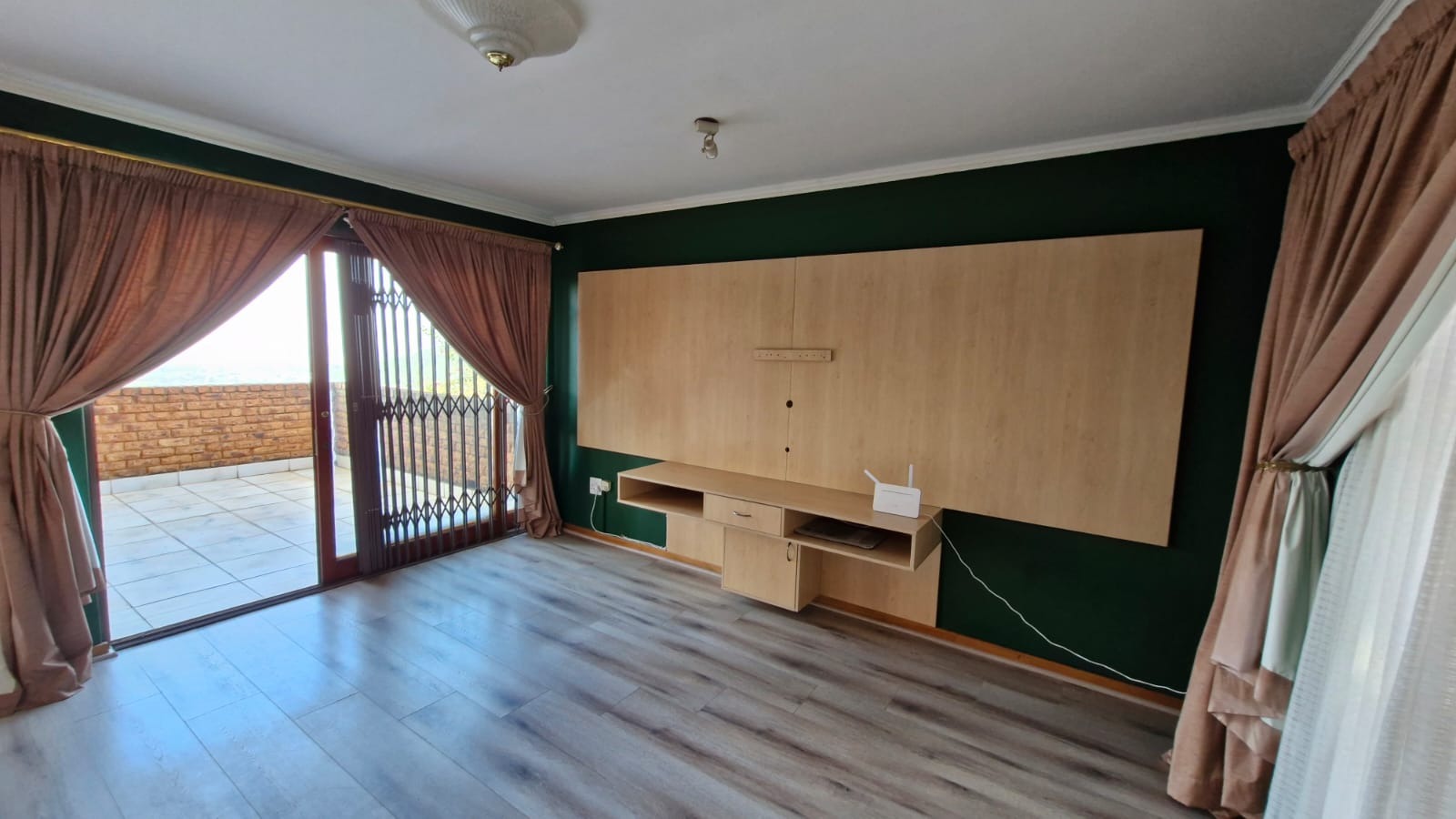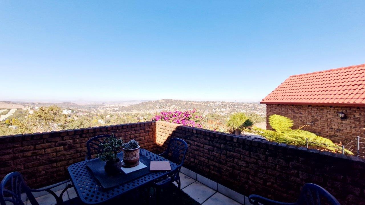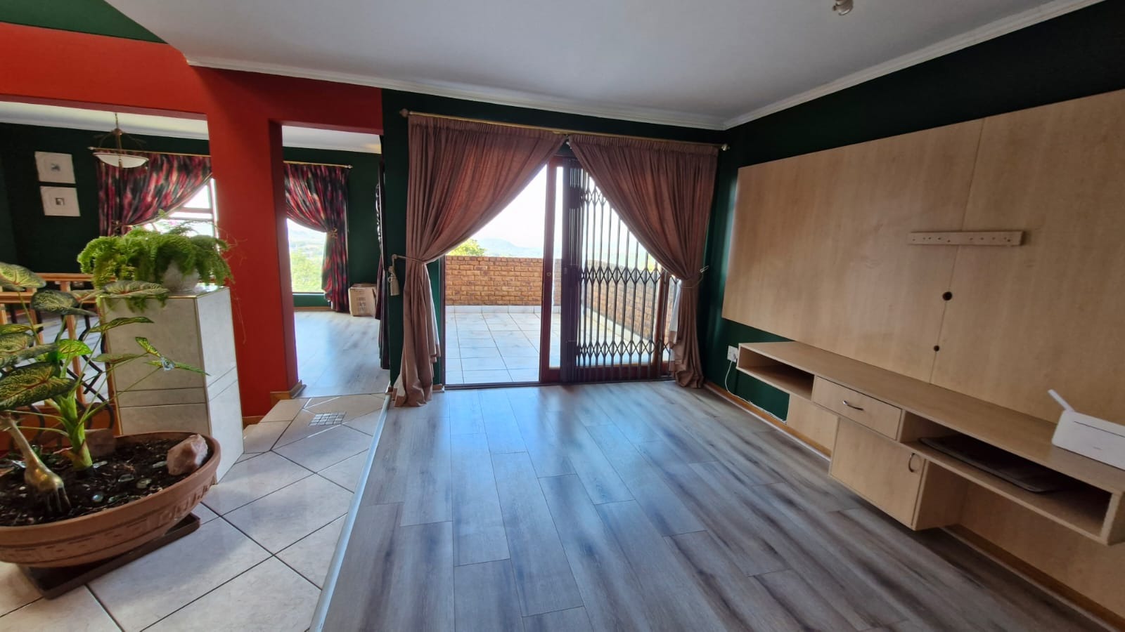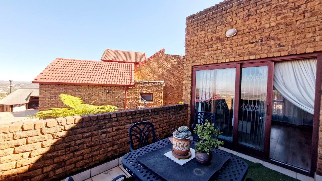 Large sliding doors provide abundant natural light and lead to a private balcony and patio, perfect for relaxation and enjoying the scenic views. Outdoor living is enhanced by a private garden and a built-in braai, ideal for entertaining. Two garages offer secure parking, and pets are allowed. Security is paramount with an access gate, electric fencing, CCTV, and security gates. For efficiency, the home includes a battery inverter and water tanks.