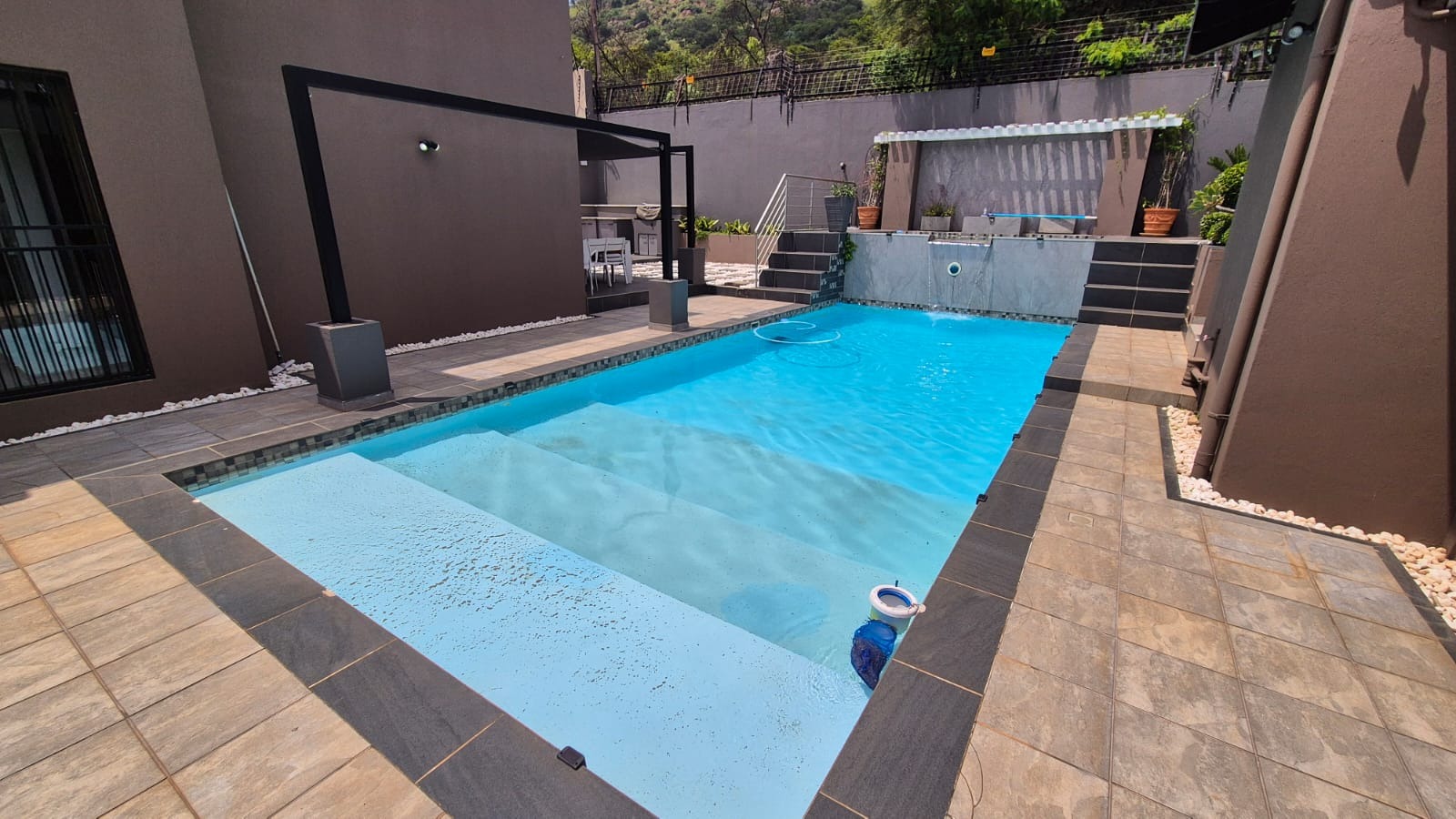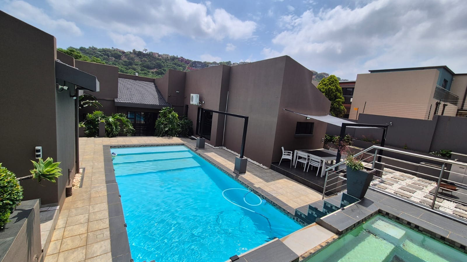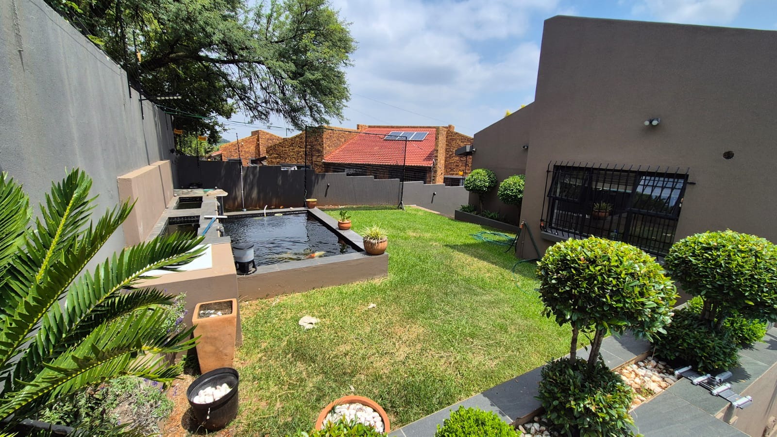 The main house consists of 3.5 bathrooms, with the main en-suite plus having a walk-in closet. 2 lounges, dining room and enormous kitchen with back yard access. There is also a bar area which also leads out to the back gard and pool are and braai/entertainment area. There is a beautiful jacuzzi pool and fabulous Koi pond.