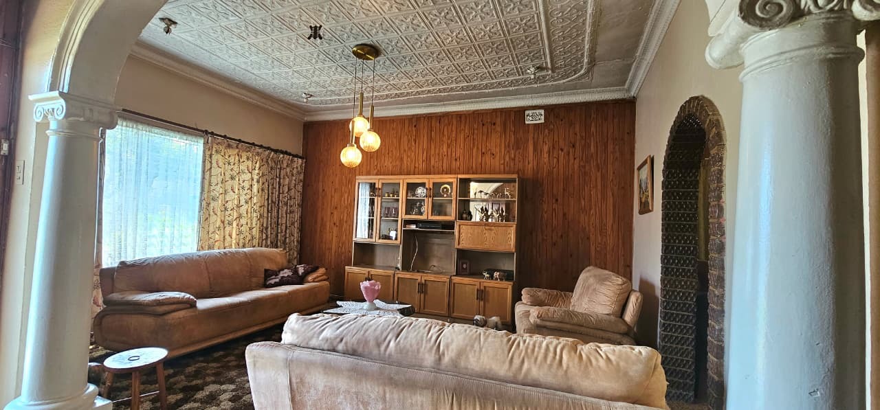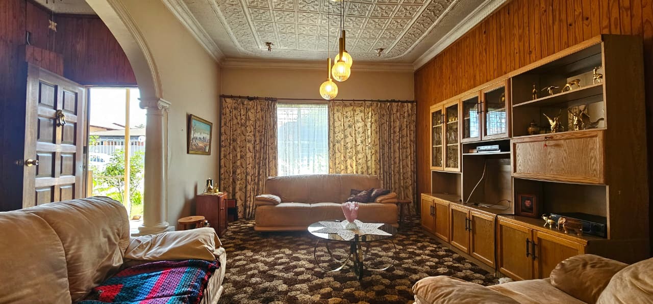 Step inside to discover living and dining areas rich with distinctive architectural details. The spacious lounge features an ornate pressed tin ceiling, elegant arched doorways, and traditional wood paneling, creating a unique vintage aesthetic. A large built-in wooden display unit offers ample storage and character. The adjacent dining room, also benefiting from natural light, provides a comfortable space for family meals and entertaining, complete with its own charming arched entrance.