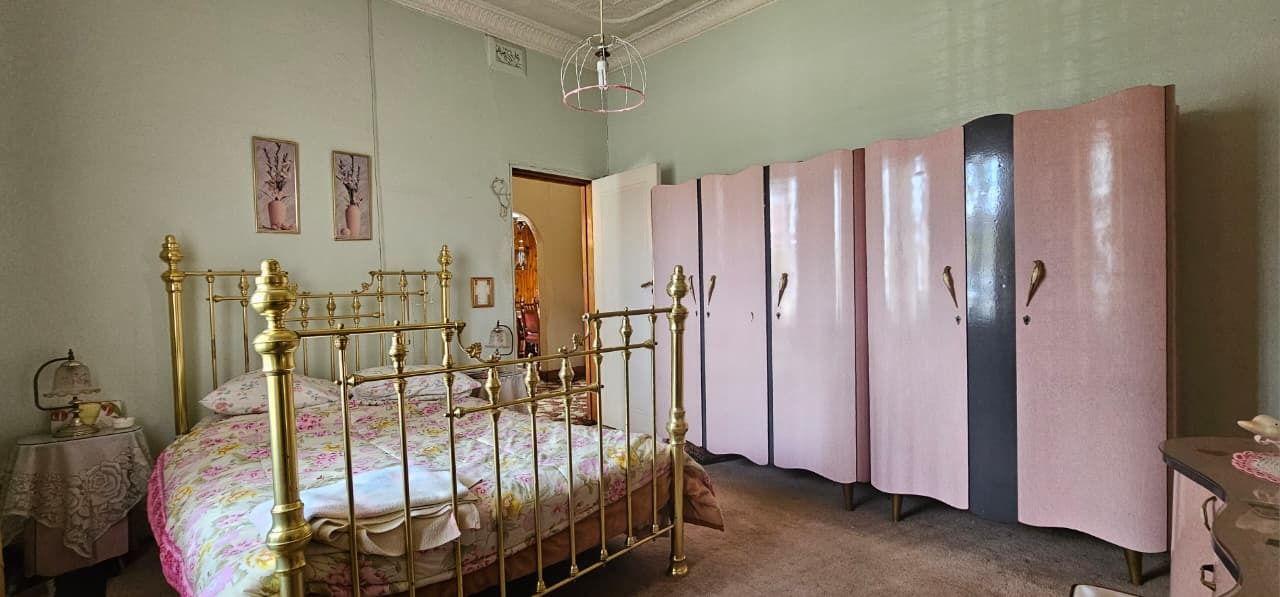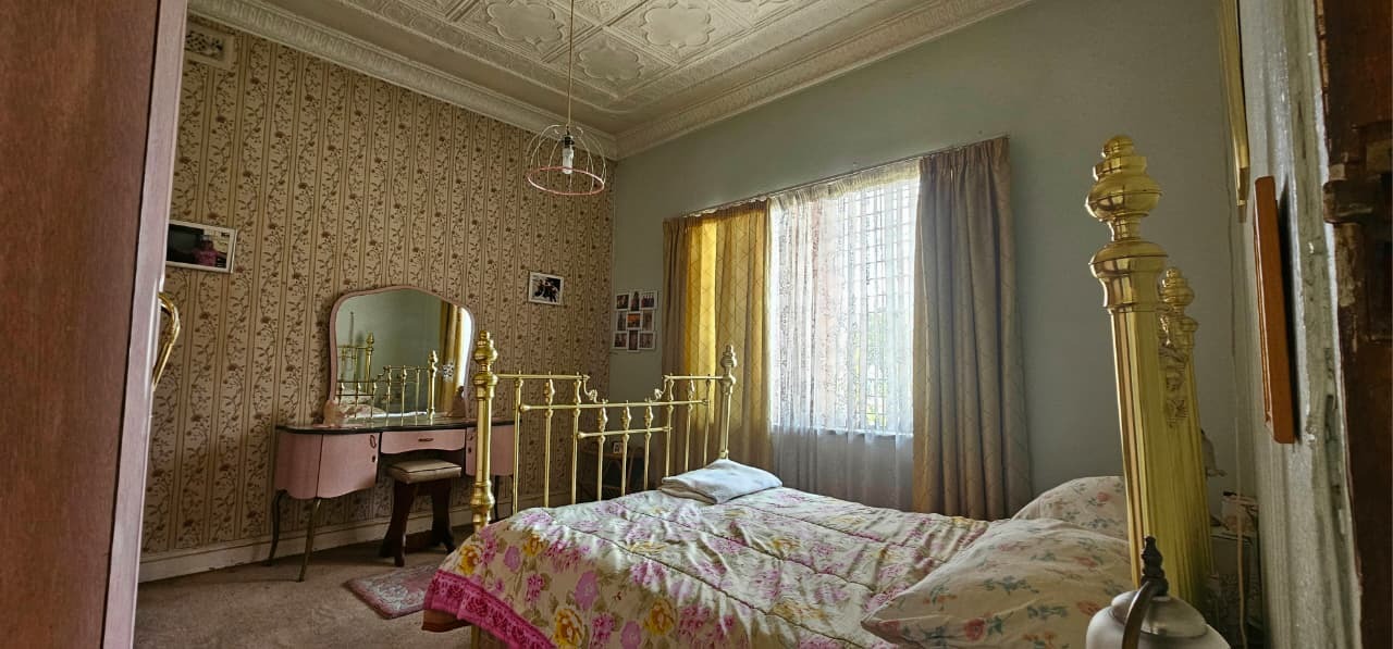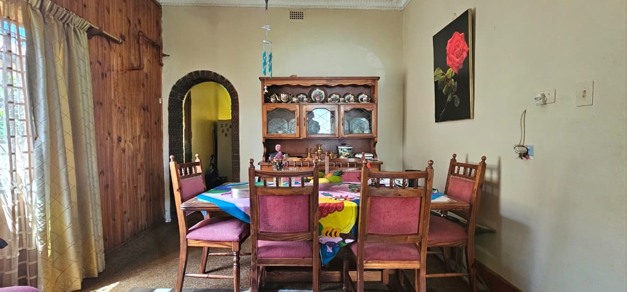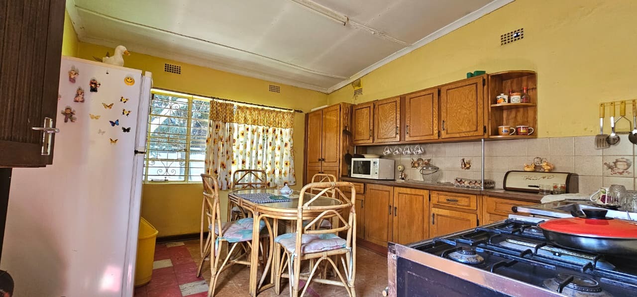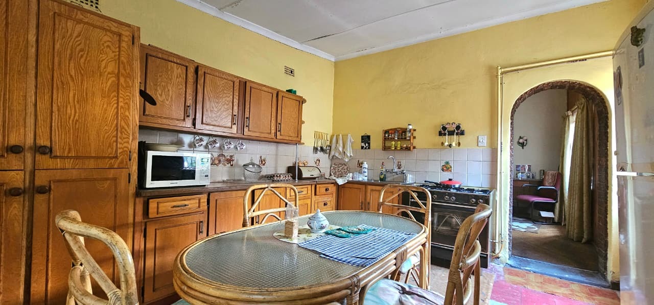 The functional kitchen is equipped with extensive wooden cabinetry and a dedicated eat-in area, presenting an excellent opportunity for modernization to align with contemporary tastes. The residence comprises of three comfortable bedrooms, each designed to receive ample natural light and fitted with security bars for peace of mind. A well-appointed bathroom serves the household.