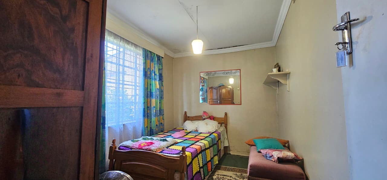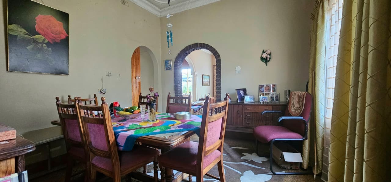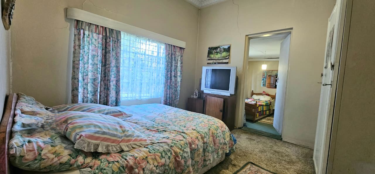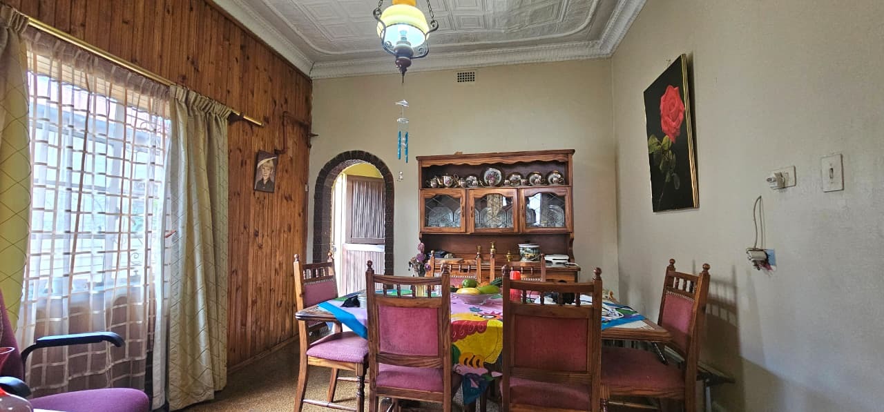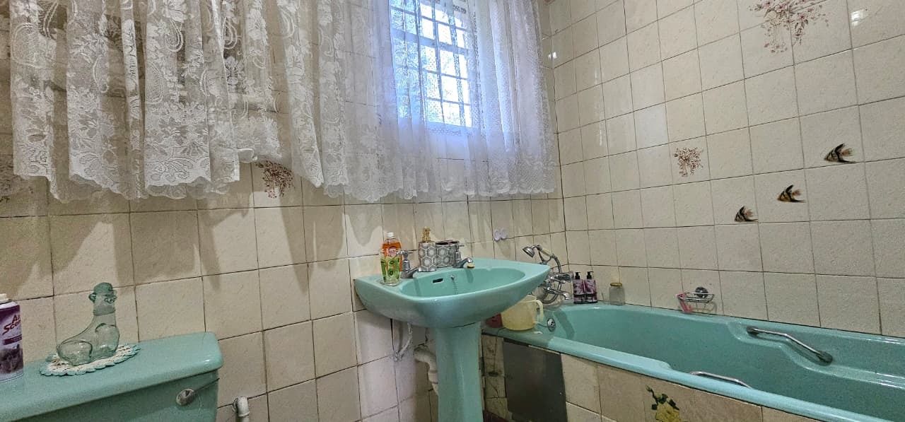 The functional kitchen is equipped with extensive wooden cabinetry and a dedicated eat-in area, presenting an excellent opportunity for modernization to align with contemporary tastes. The residence comprises of three comfortable bedrooms, each designed to receive ample natural light and fitted with security bars for peace of mind. A well-appointed bathroom serves the household.