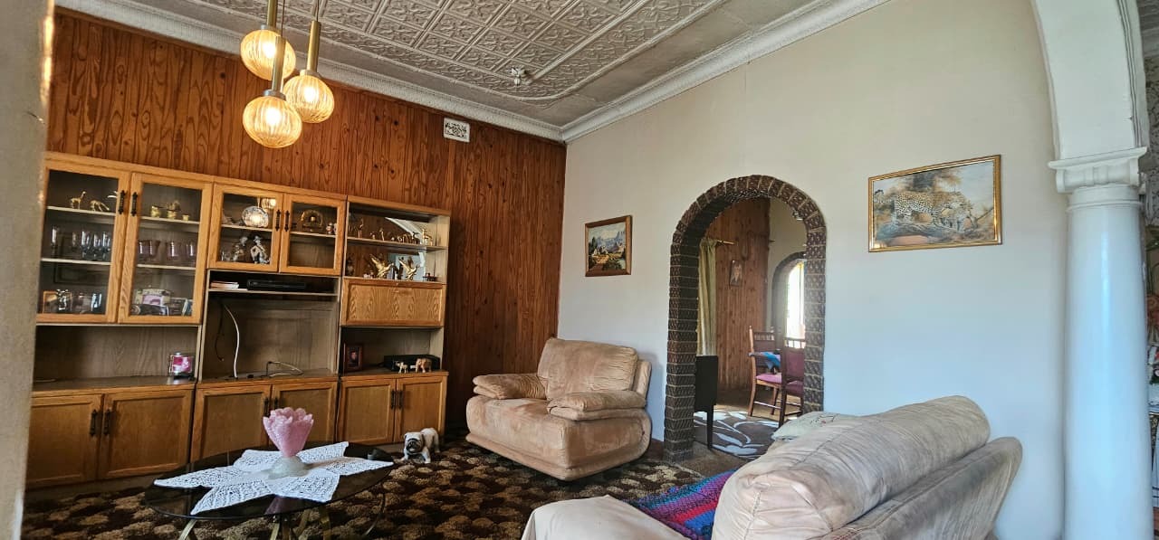 Step inside to discover living and dining areas rich with distinctive architectural details. The spacious lounge features an ornate pressed tin ceiling, elegant arched doorways, and traditional wood paneling, creating a unique vintage aesthetic. A large built-in wooden display unit offers ample storage and character. The adjacent dining room, also benefiting from natural light, provides a comfortable space for family meals and entertaining, complete with its own charming arched entrance.