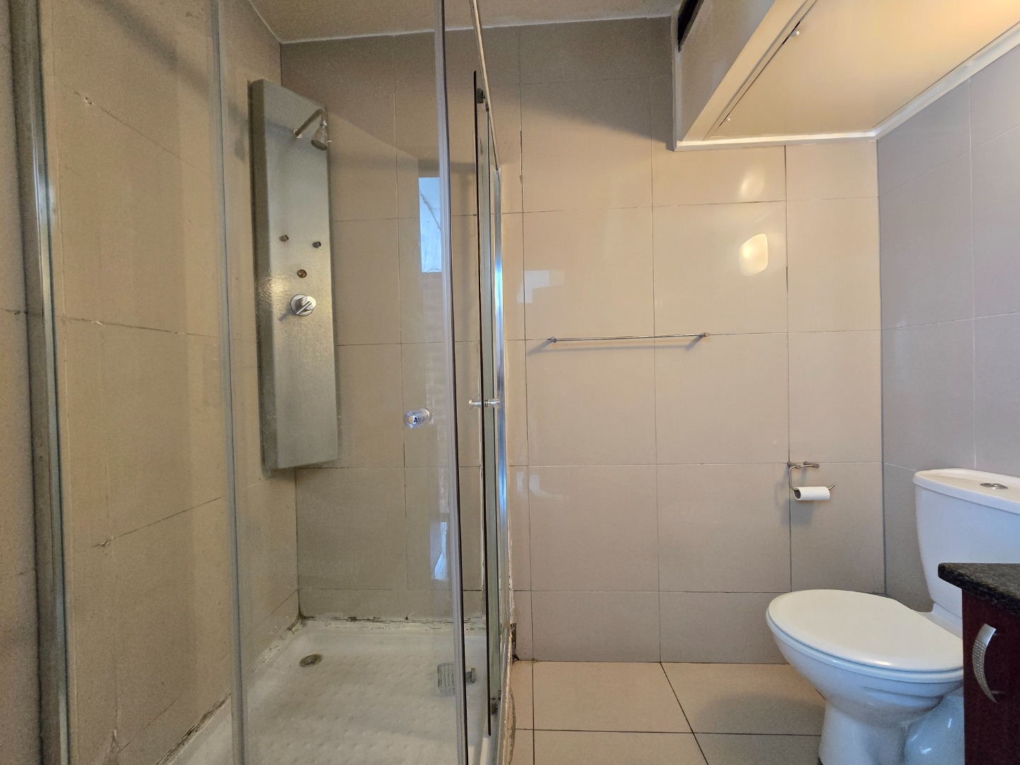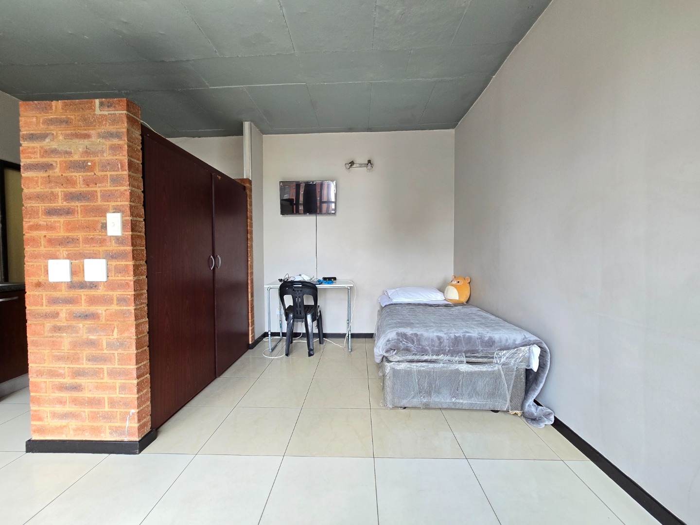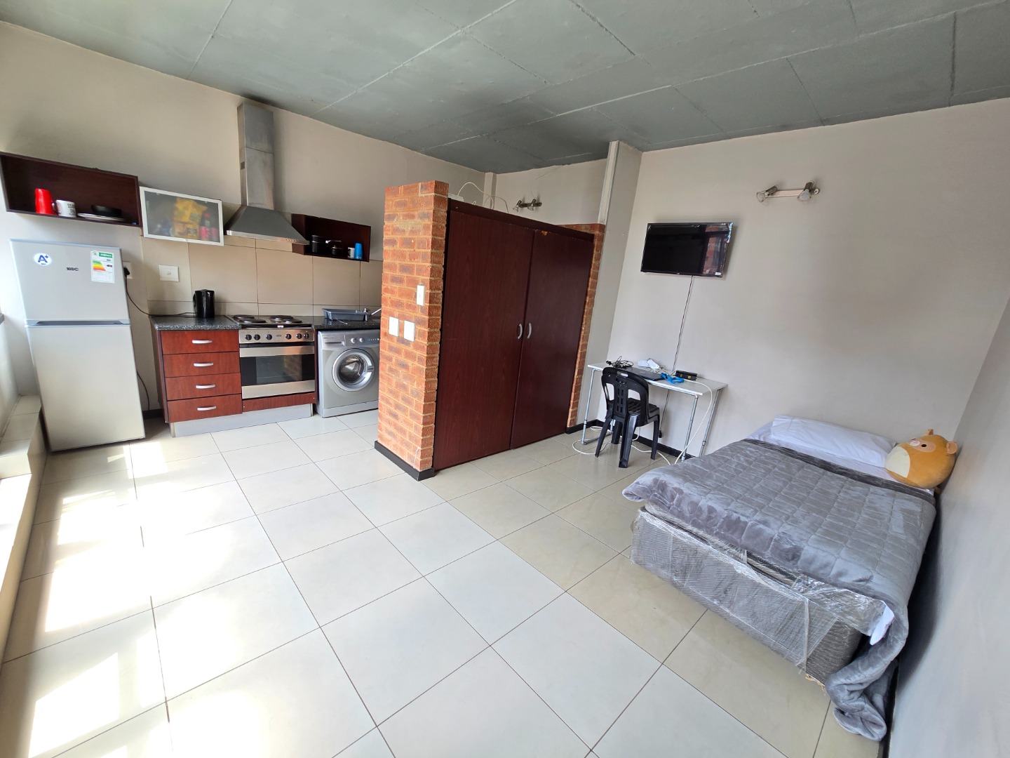 Adjacent to the kitchen is the cozy bedroom, separated by a stylish wall for privacy. The bedroom boasts ample built-in cupboards, providing plenty of storage space. The bathroom is spacious and equipped with a modern shower, toilet, and basin, offering a fresh and functional design.