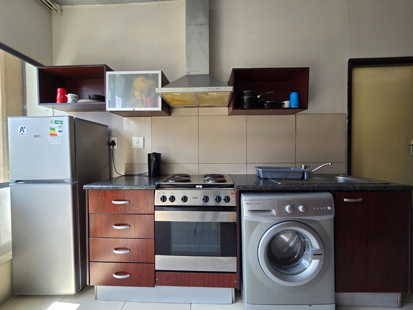 The unit features elegant porcelain tiles throughout and a modern kitchen with high-end finishes, including sleek granite countertops, a 4-plate stove, oven, and a dedicated space for both a washing machine and fridge. An extractor unit adds to the kitchen’s functionality, making it perfect for easy meal prep and cleanup.