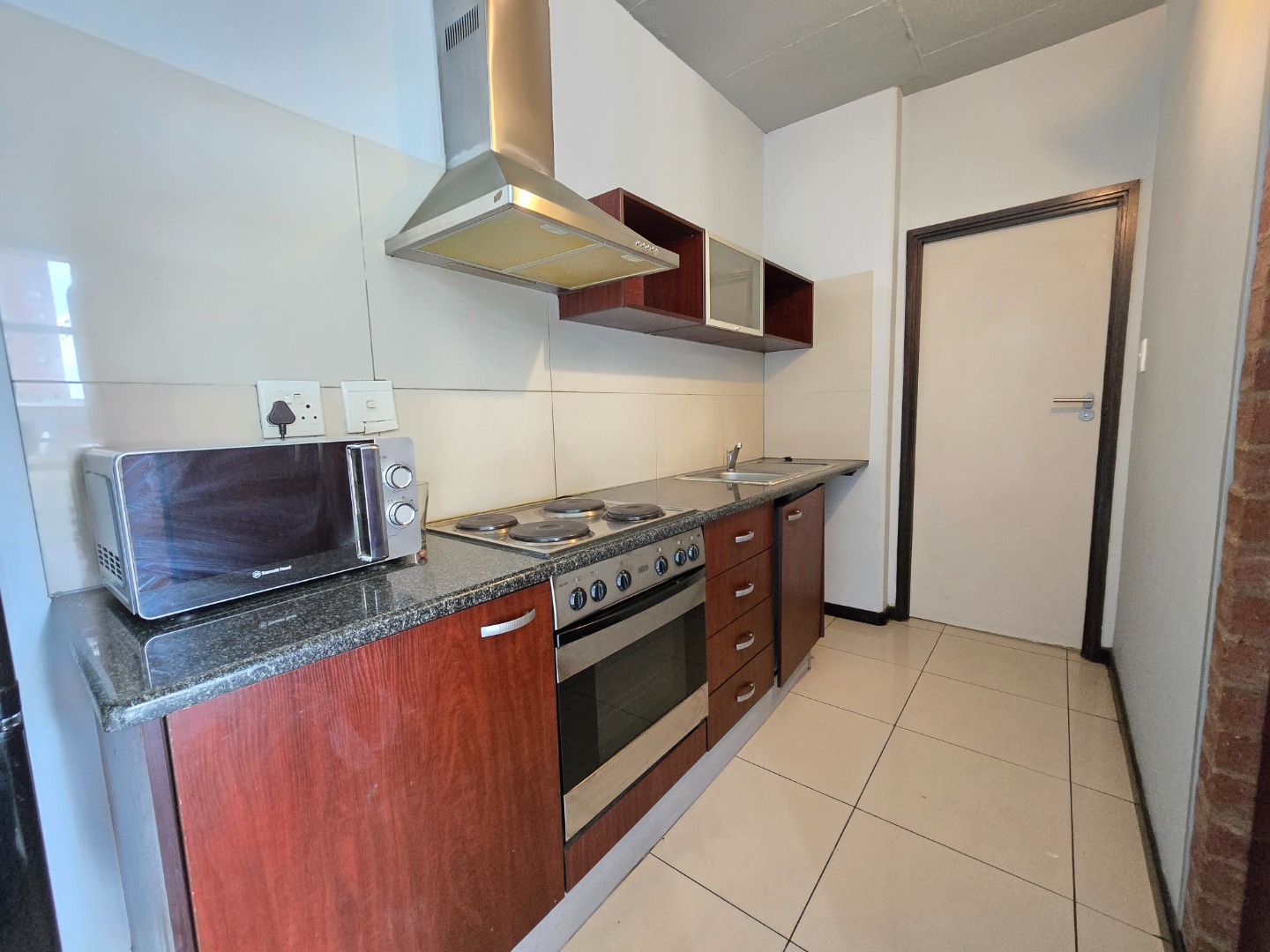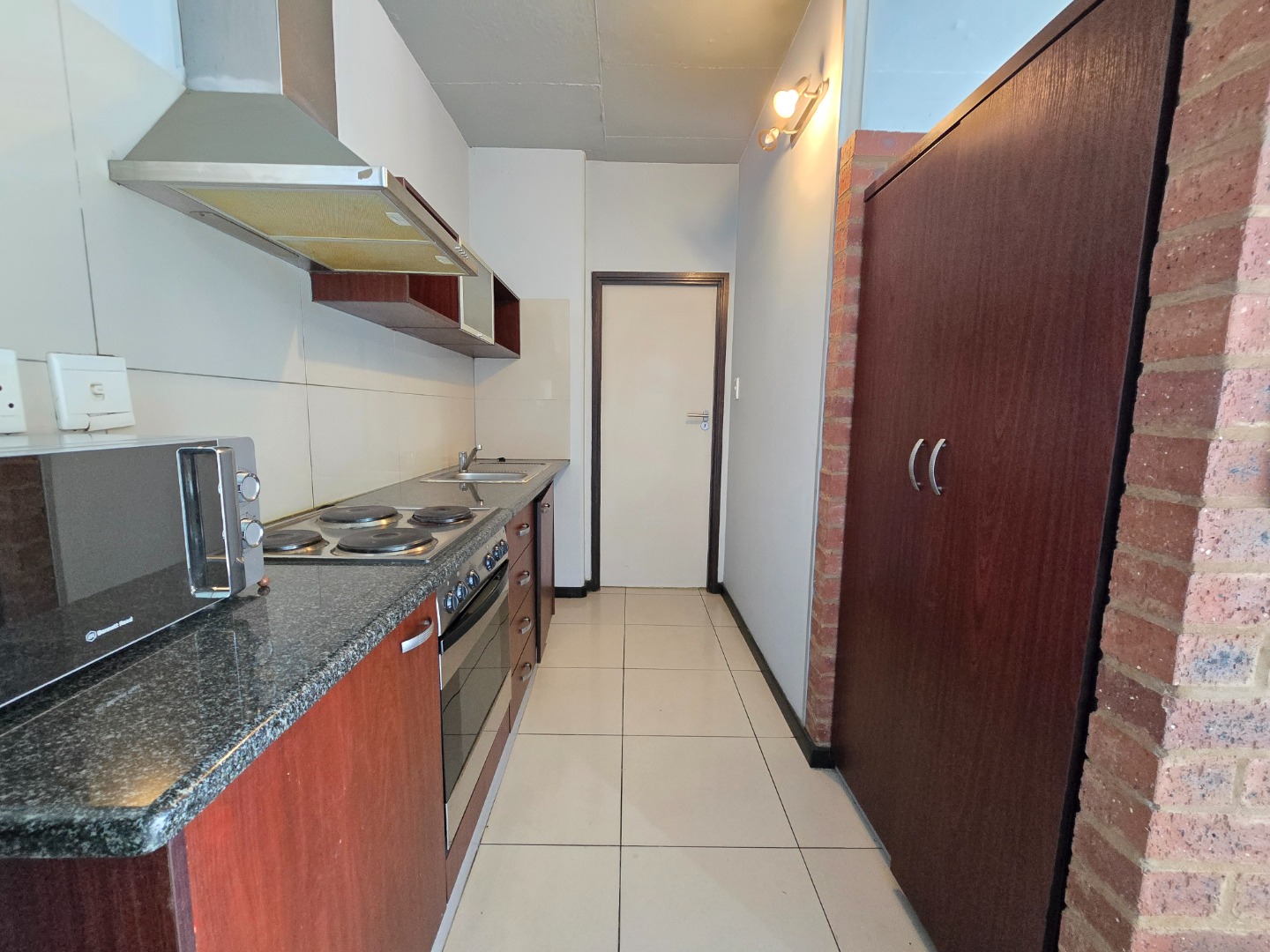 Upon entry, you are welcomed by a spacious kitchen to the left, featuring modern granite countertops and ample cupboard space – perfect for all your culinary needs. The bedroom area is cleverly separated from the kitchen by a built-in cupboard, offering both privacy and practicality.
