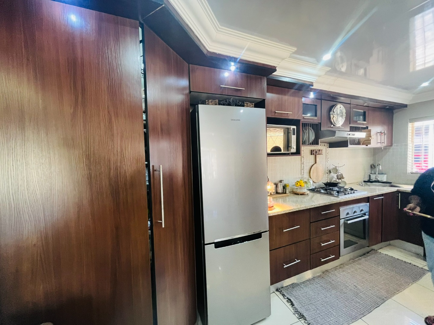 At the heart of the home, the modern kitchen blends style and function beautifully — thoughtfully designed to complement the contemporary aesthetic while remaining practical for everyday living with a gas stove and a large pantry.