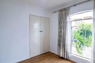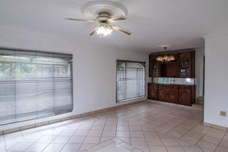 Step inside to discover a spacious and light-filled interior, characterized by durable tiled flooring throughout the main living areas. The layout includes a dedicated lounge and a dining room, both benefiting from large windows that invite abundant natural light. Ceiling fans are installed in several rooms, ensuring comfortable air circulation. A notable feature is the built-in wooden cabinetry, offering practical storage and display solutions.