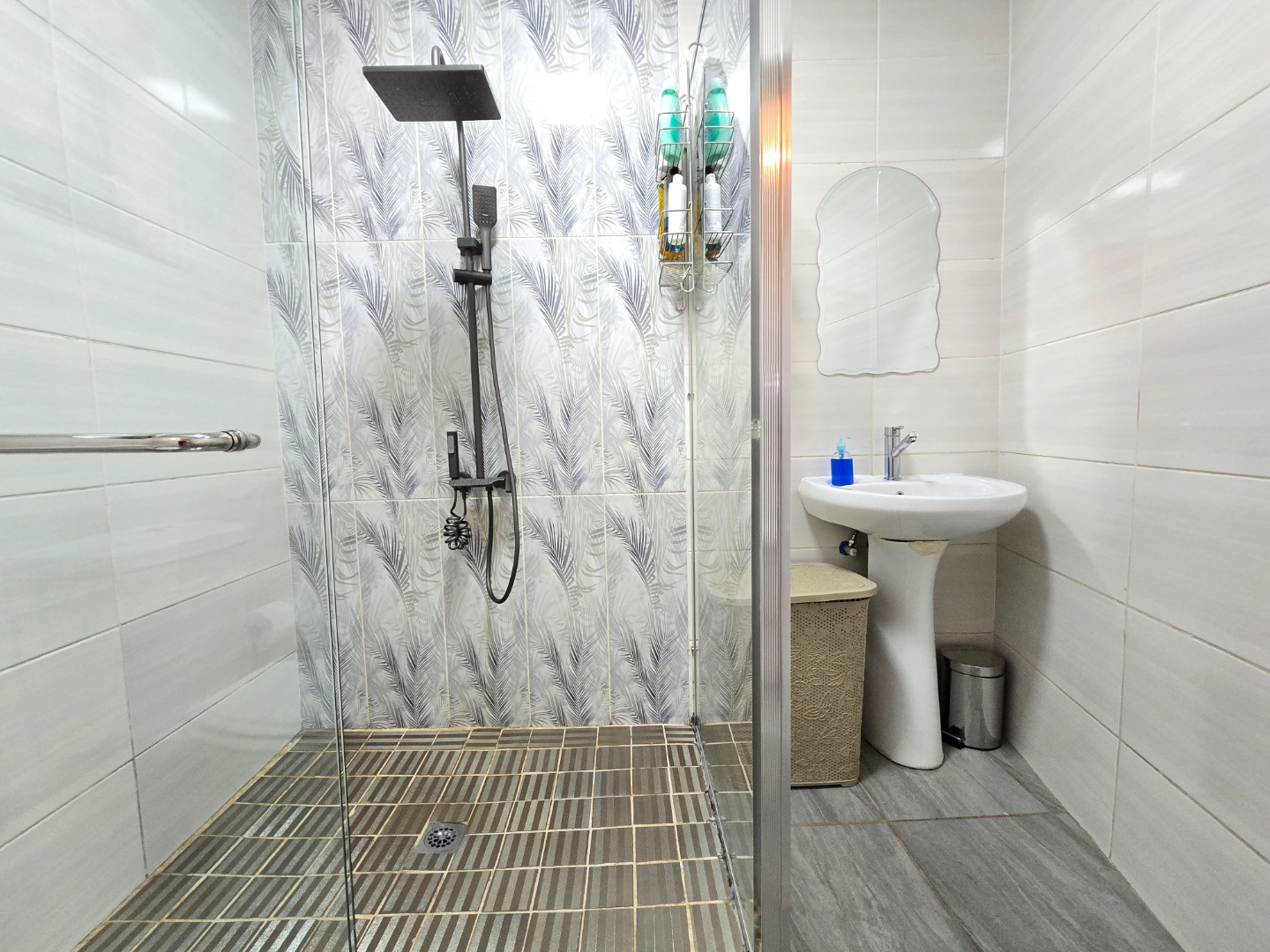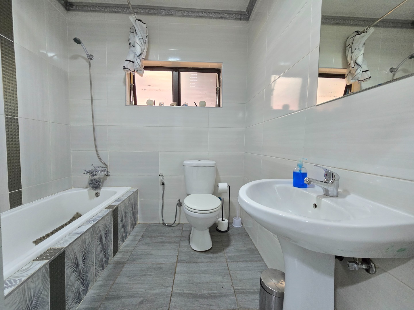 Upon entering, you are welcomed into a spacious lounge area, ideal for hosting family and friends. Thanks to its open-plan layout, the lounge flows seamlessly into the dining room and the modern kitchen. The kitchen is beautifully designed with high-gloss cupboards, quartz countertops, ample storage, as well as dedicated space for both a dishwasher and fridge. It also includes a stove with a 4-plate electric oven.