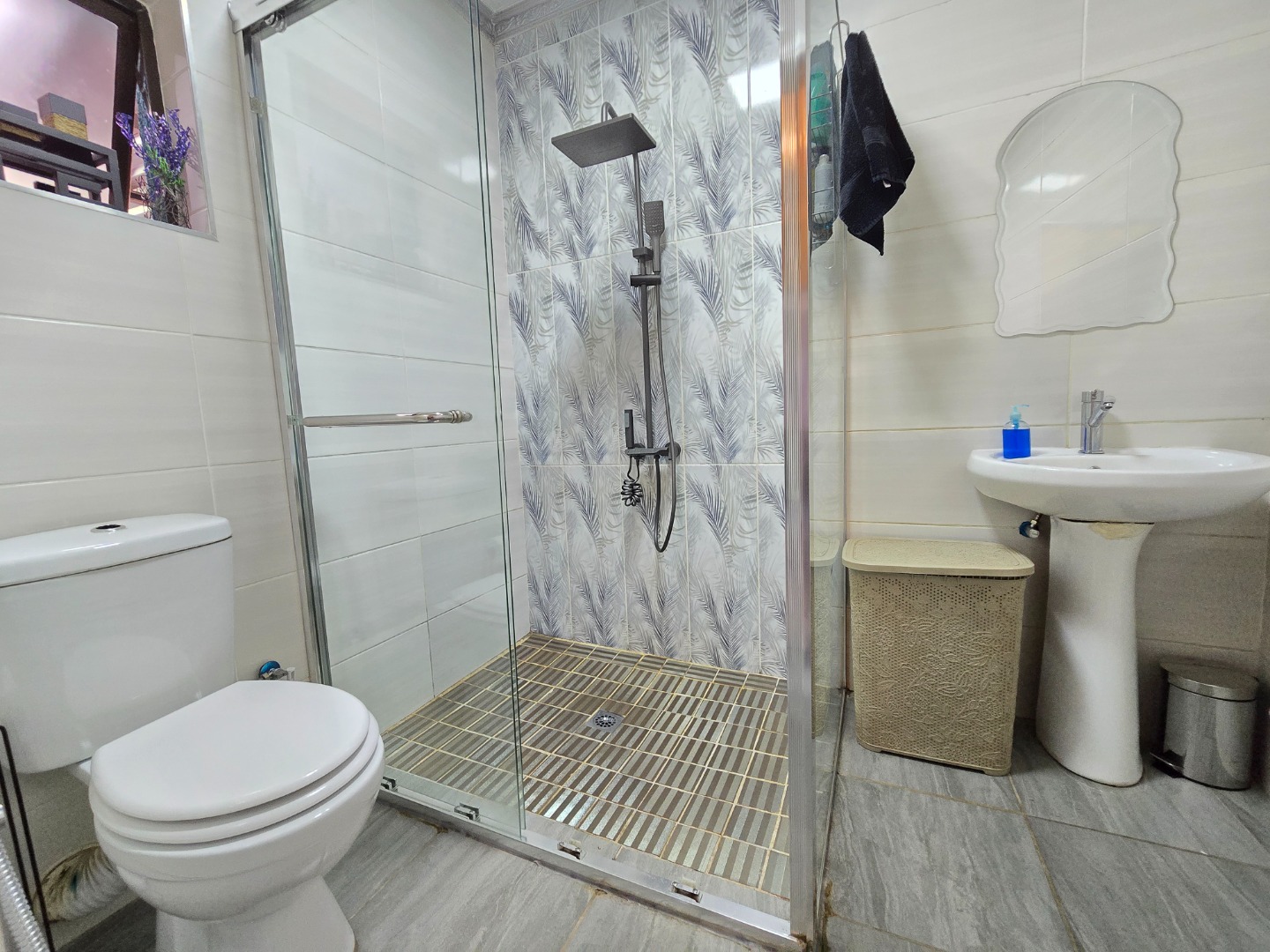 Upon entering, you are welcomed into a spacious lounge area, ideal for hosting family and friends. Thanks to its open-plan layout, the lounge flows seamlessly into the dining room and the modern kitchen. The kitchen is beautifully designed with high-gloss cupboards, quartz countertops, ample storage, as well as dedicated space for both a dishwasher and fridge. It also includes a stove with a 4-plate electric oven.