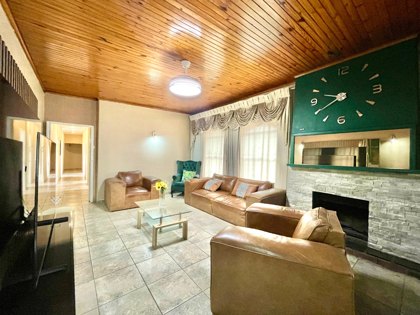 Inside, the layout is both practical and welcoming. Two lounges, a family TV room, and a dedicated dining room create versatile spaces for gatherings big or small. Wooden panel ceilings add character, while tiled floors throughout ensure low-maintenance living.
