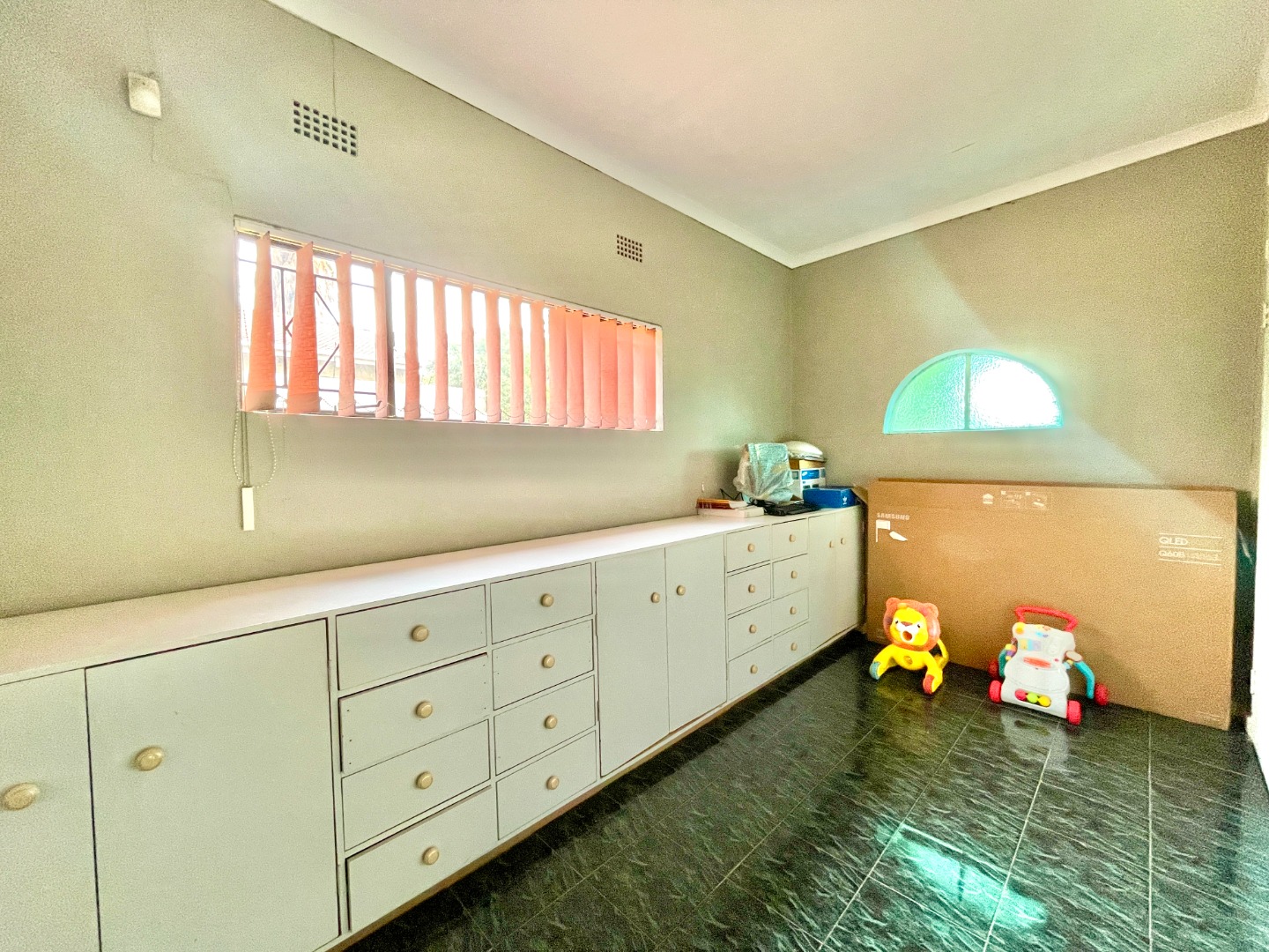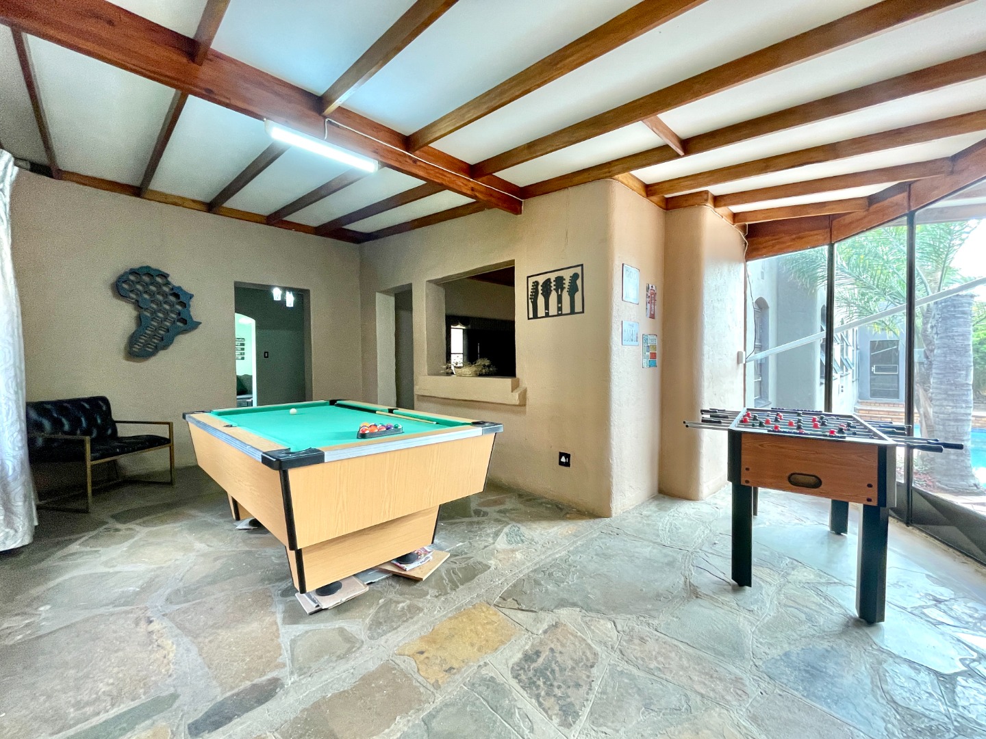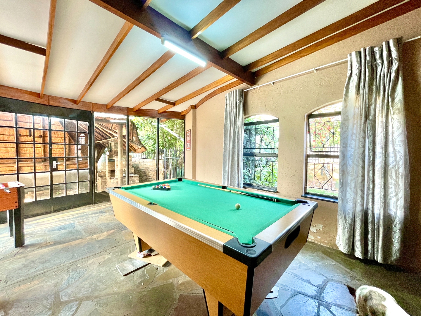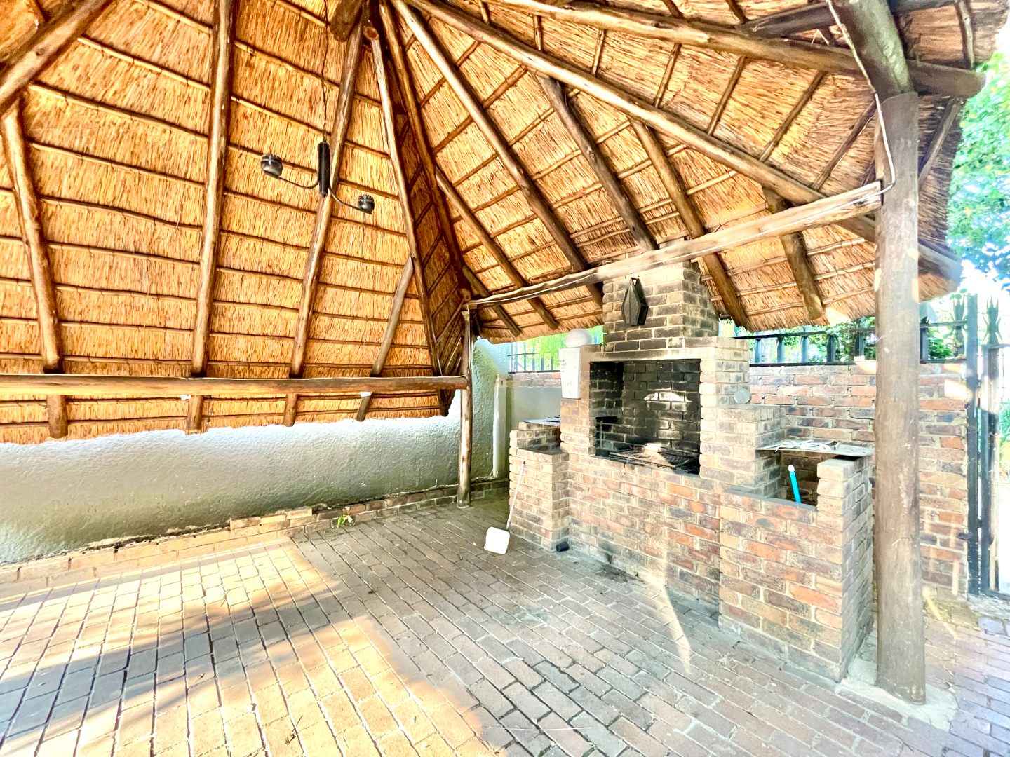 Outdoors, the property truly shines. Dive into the sparkling swimming pool, host weekend braais under the thatched lapa, or enjoy the greenery of the neat, pet-friendly garden. With six garages plus extra parking, there’s space for all your vehicles, trailers, or hobbies.