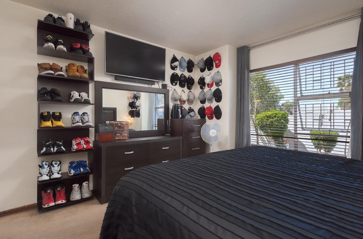One of this home’s most special features is its private, low-maintenance garden. Sliding glass doors open from the living area onto a tiled patio and enclosed green space, creating a seamless indoor-outdoor connection.