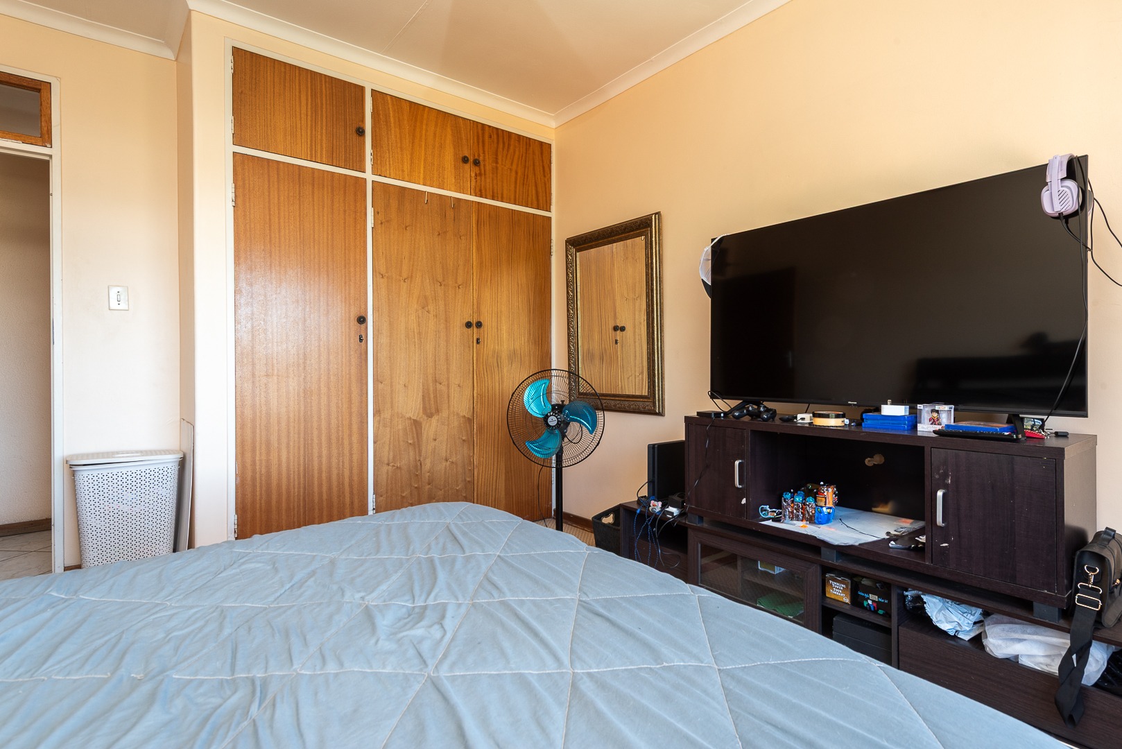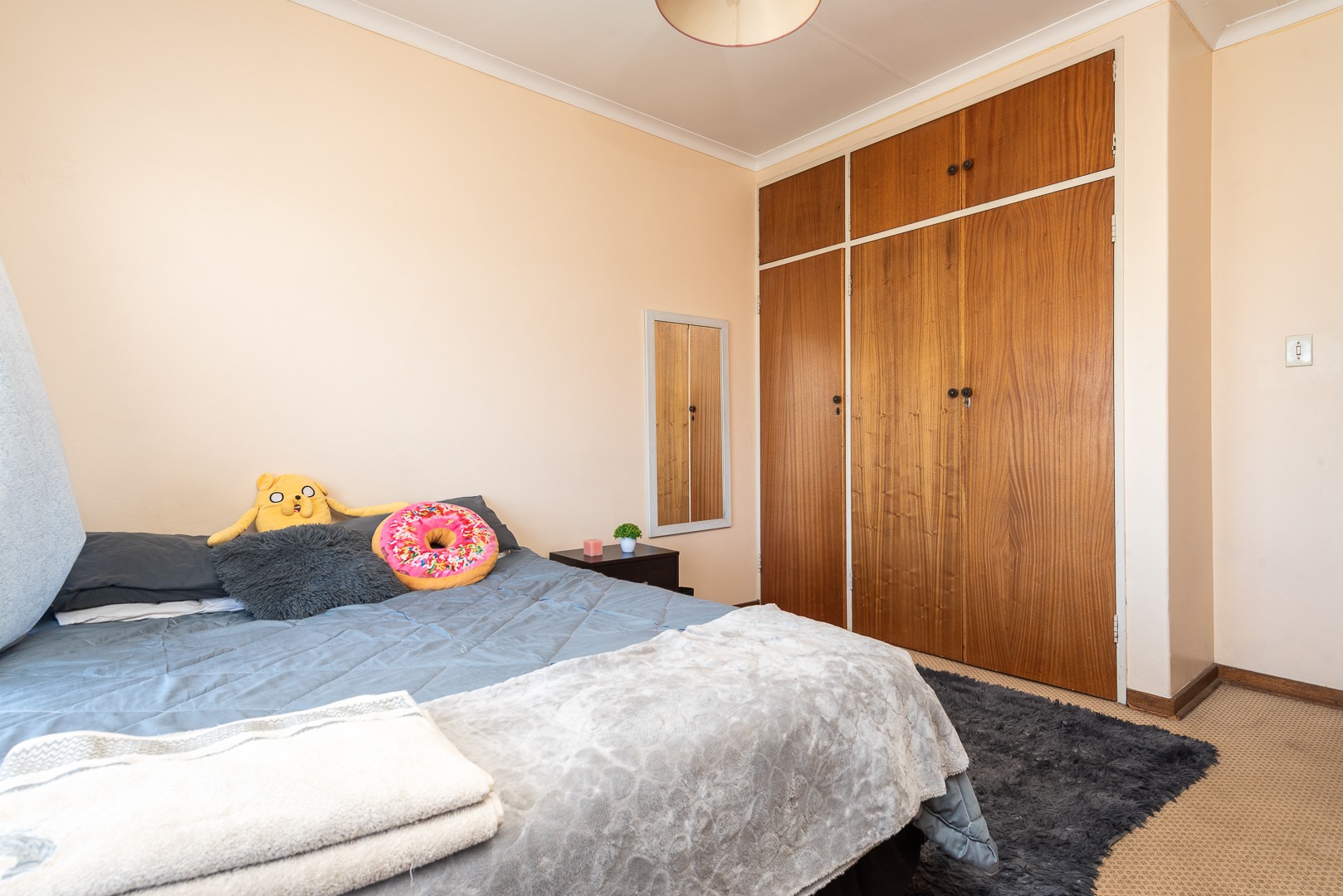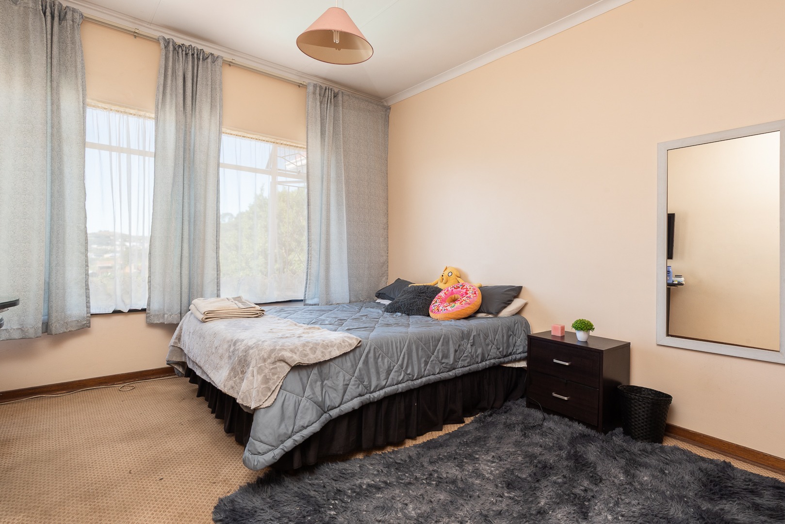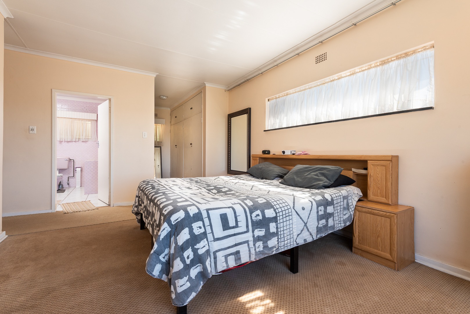 Bedrooms: The property offers three generously sized bedrooms, all with built-in cupboards and carpeted floors, ensuring comfort and ample storage space. Large windows in each room allow natural light to fill the spaces, creating a bright and airy atmosphere.