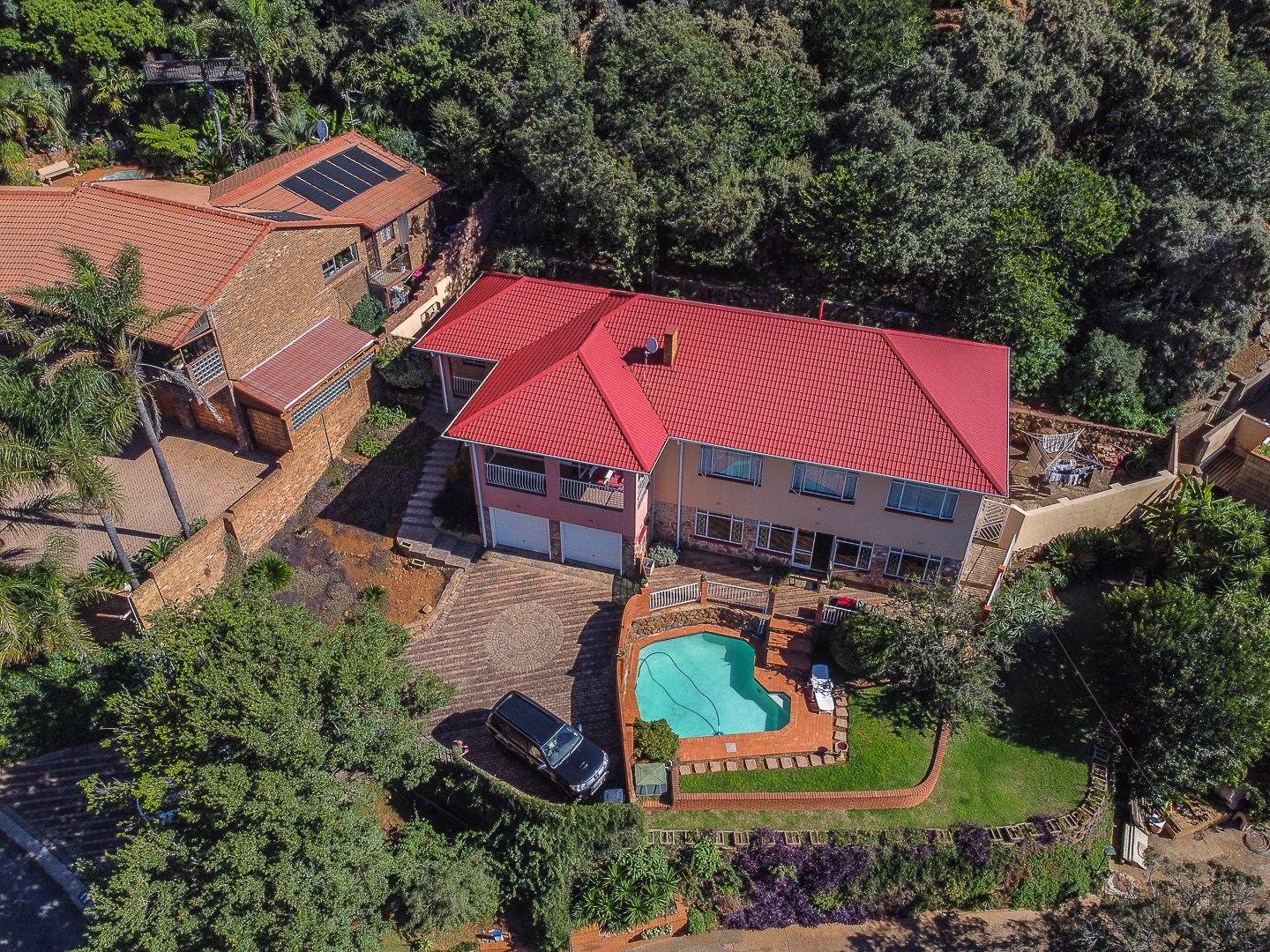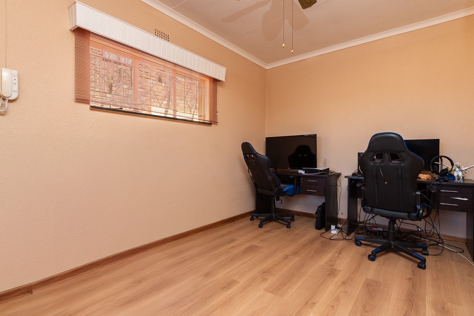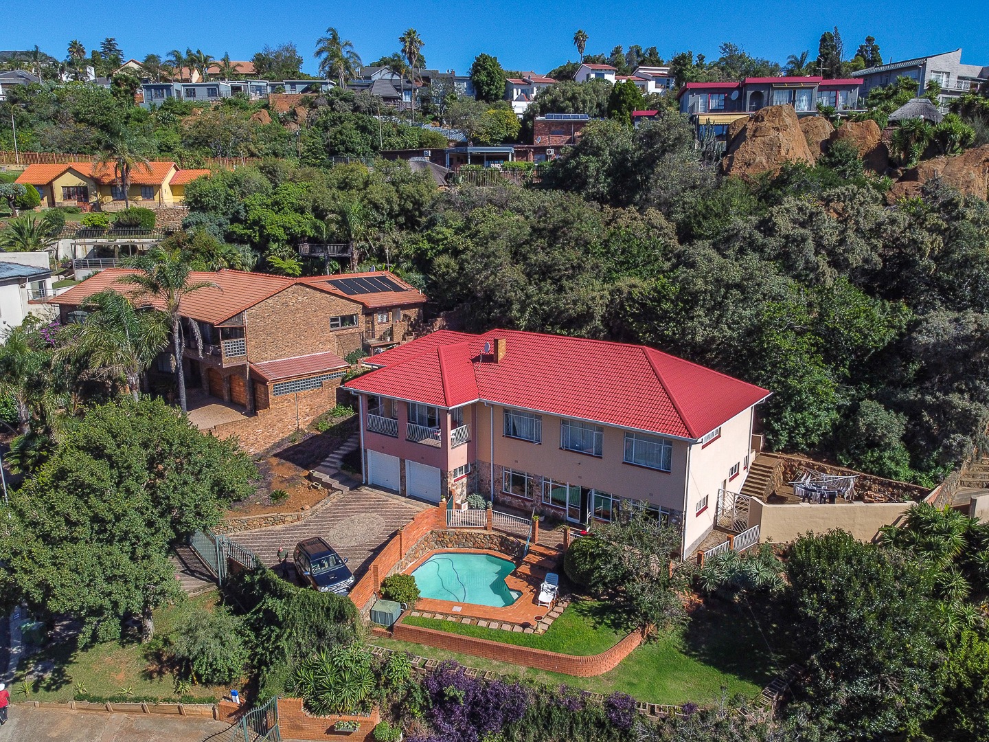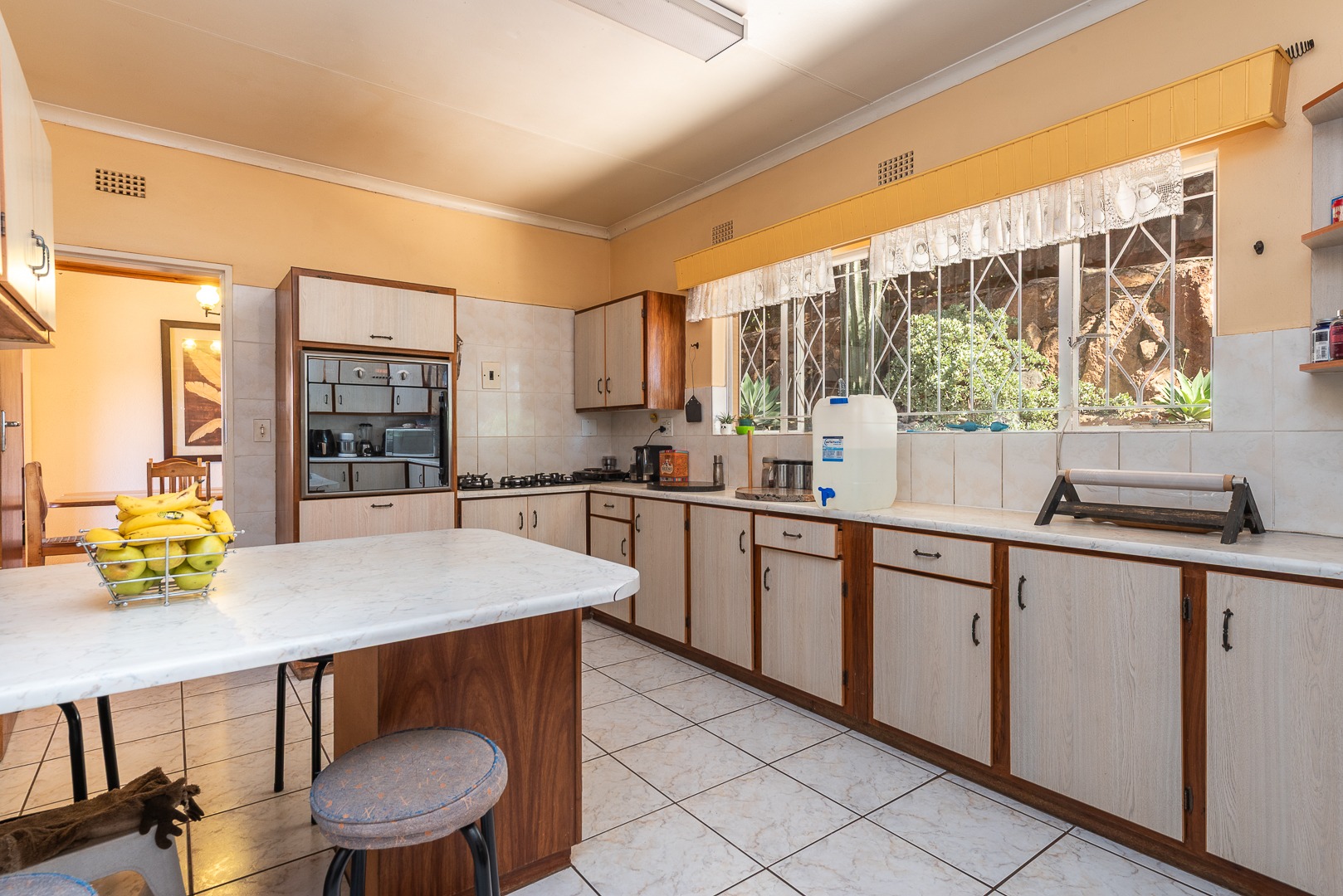 The property is fully secure, with burglar bars, security gates, and an intercom system in place for peace of mind. The entrance is protected by automated gates, offering both convenience and safety. The double garage ensures secure parking, with additional open parking space for up to three cars.