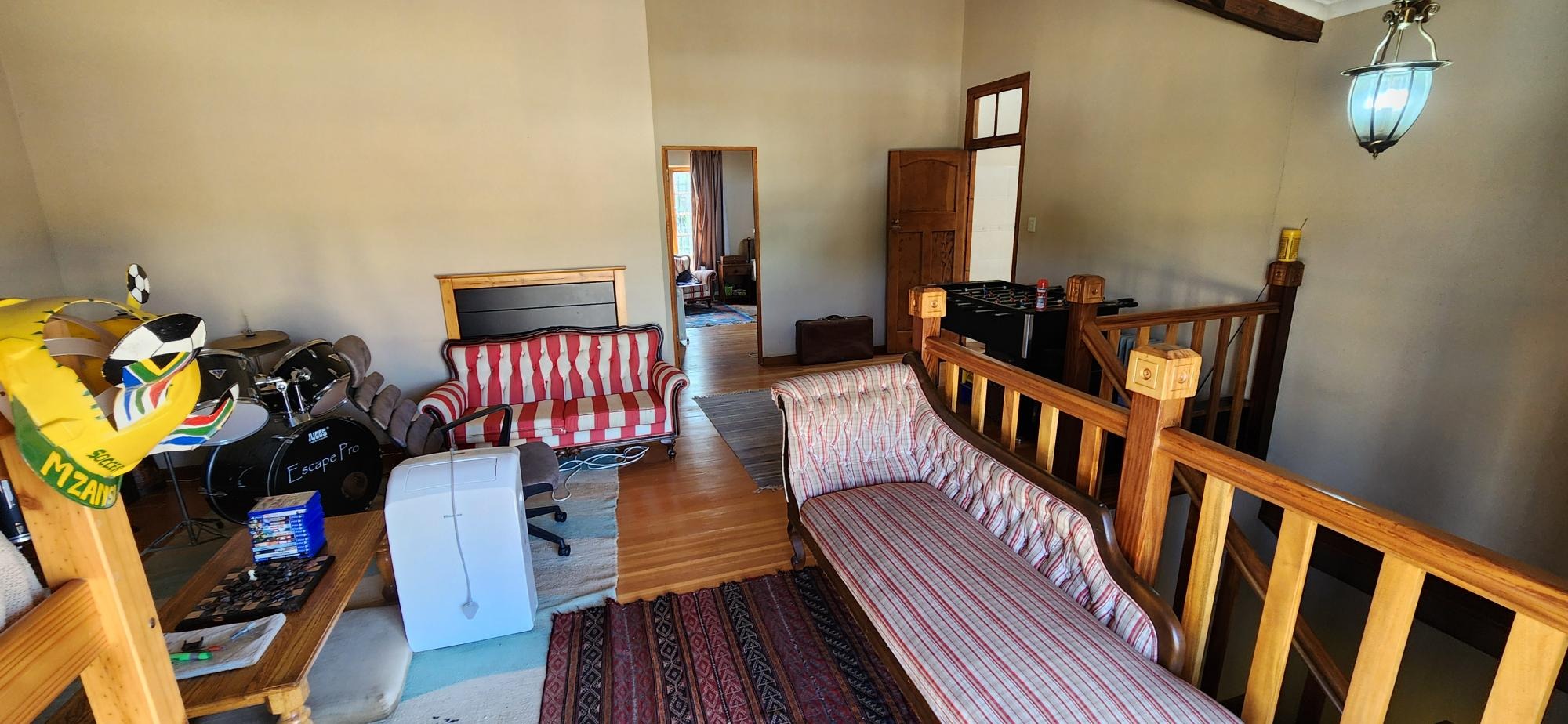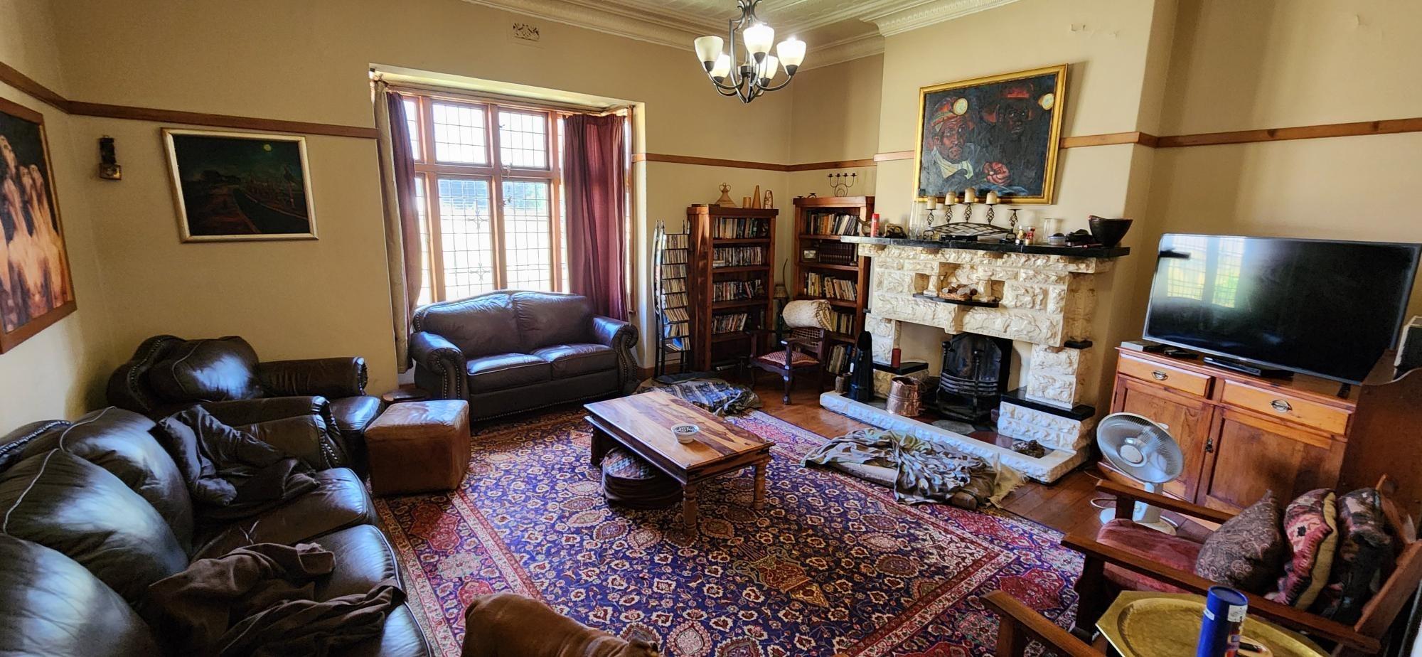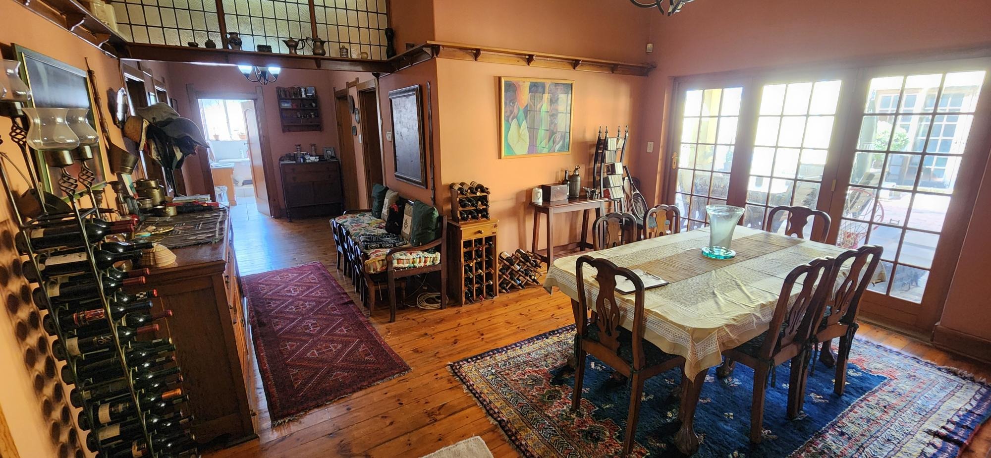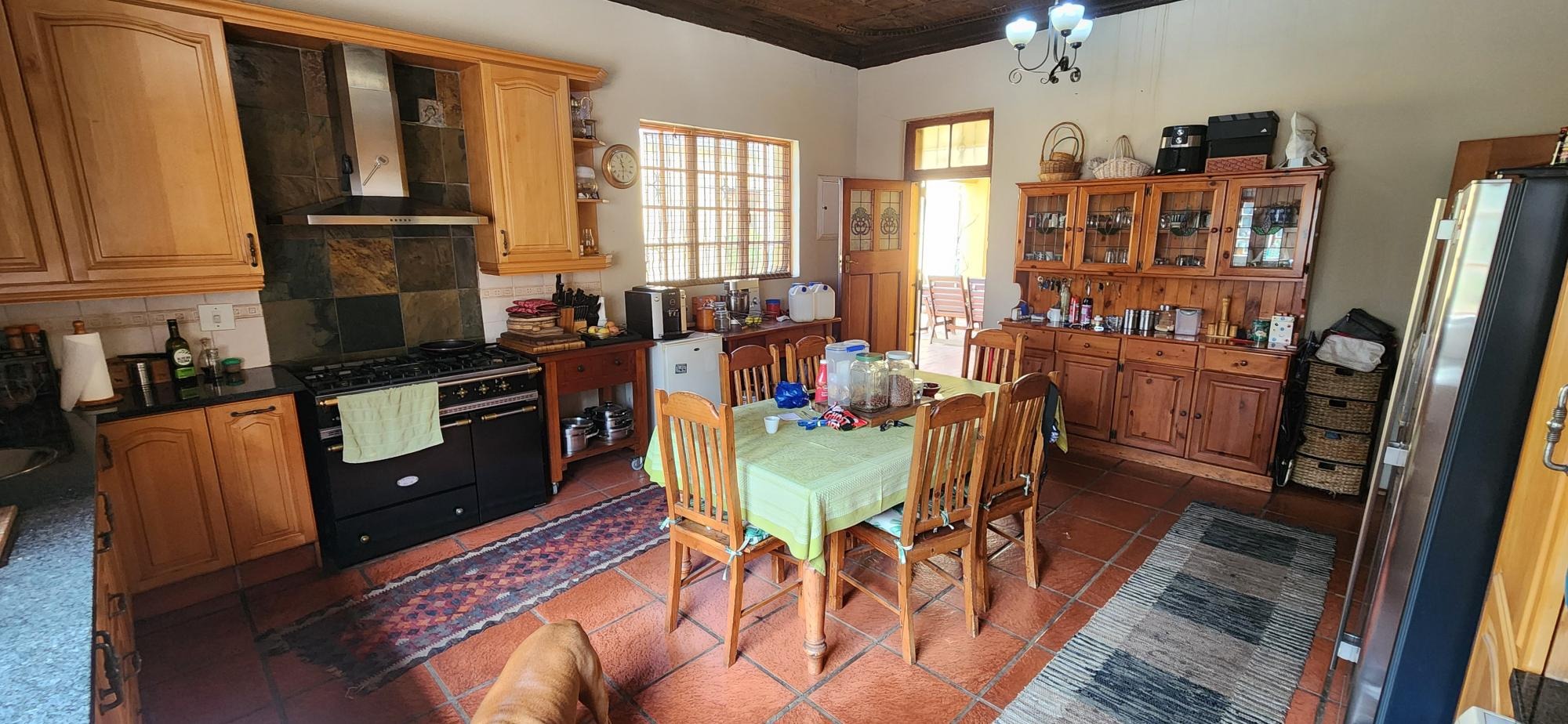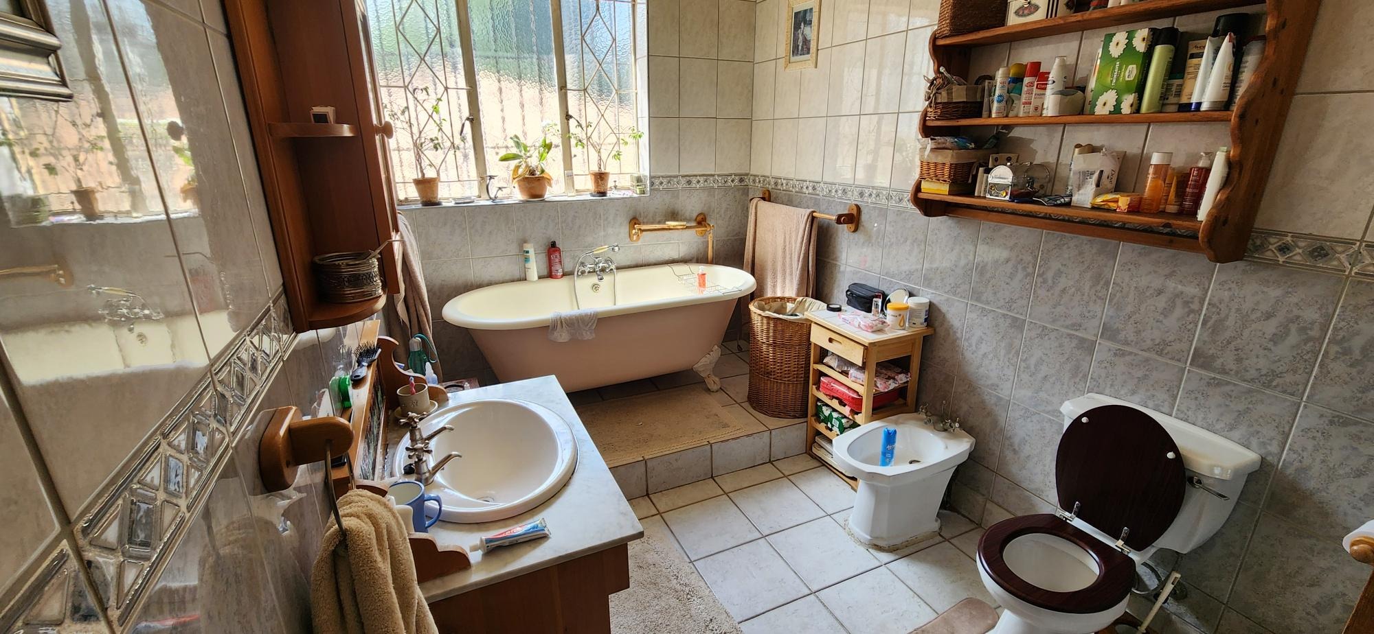 The main house consists of a wrap around covered well secured veranda which leads into the entrance hall area of the home .The large living areas consist of a formal lounge with wood burning fire place , TV lounge with fire place , a study area and a huge dining room all ideally situated near to the spacious fitted kitchen with gas stove . There are 5 spacious bedrooms in total in the main house , 3 of the 5 bedrooms are on the lower level . The main bedroom has an en-suite bathroom and the 2nd and 3rd bedroom share the 2nd bathroom . The upper level of the home consists of a large open plan lounge area which leads out onto a lovely spacious patio overlooking the swimming pool and large garden , 2 spacious bedrooms and a full bathroom . There is also a self contained separate cottage consisting of a lounge , bedroom and a bathroom and space for a kitchenette .