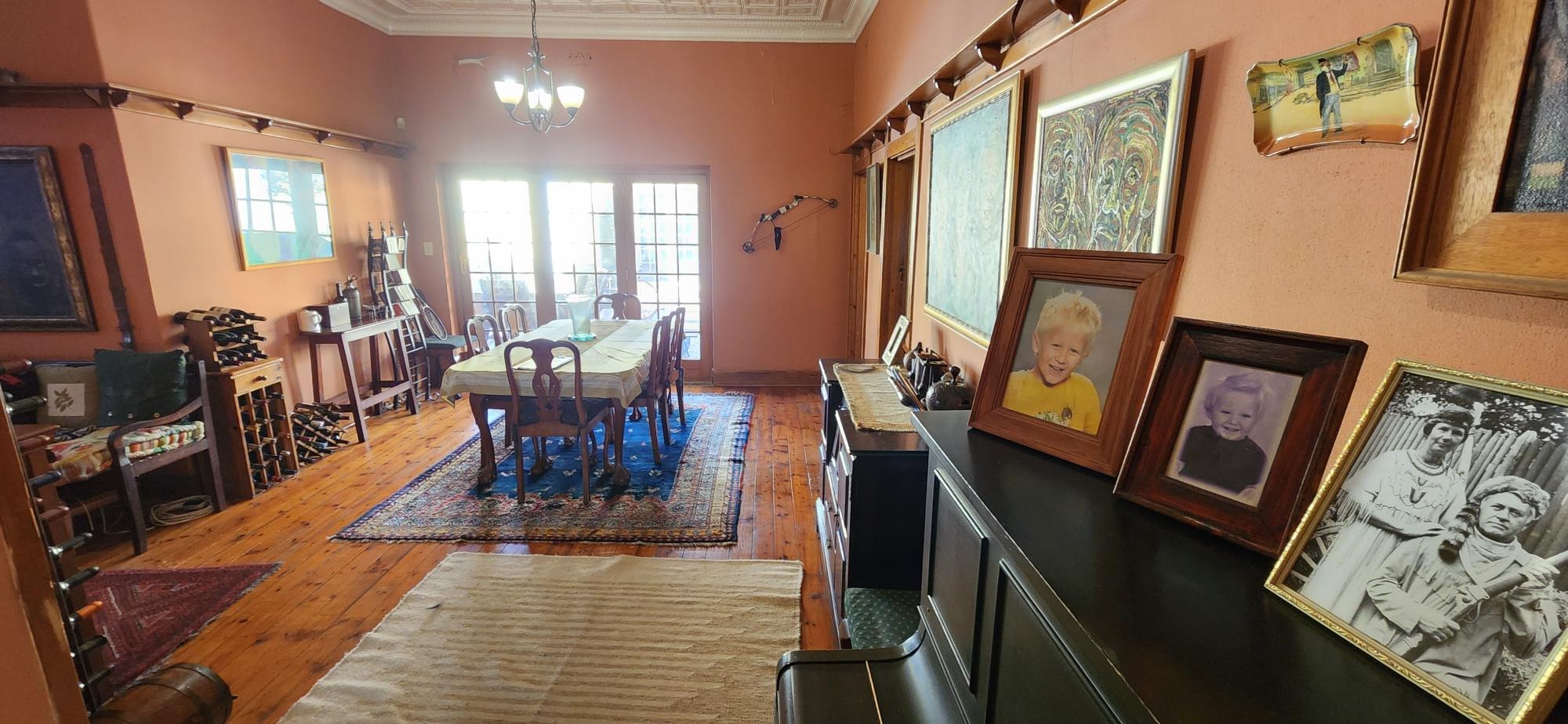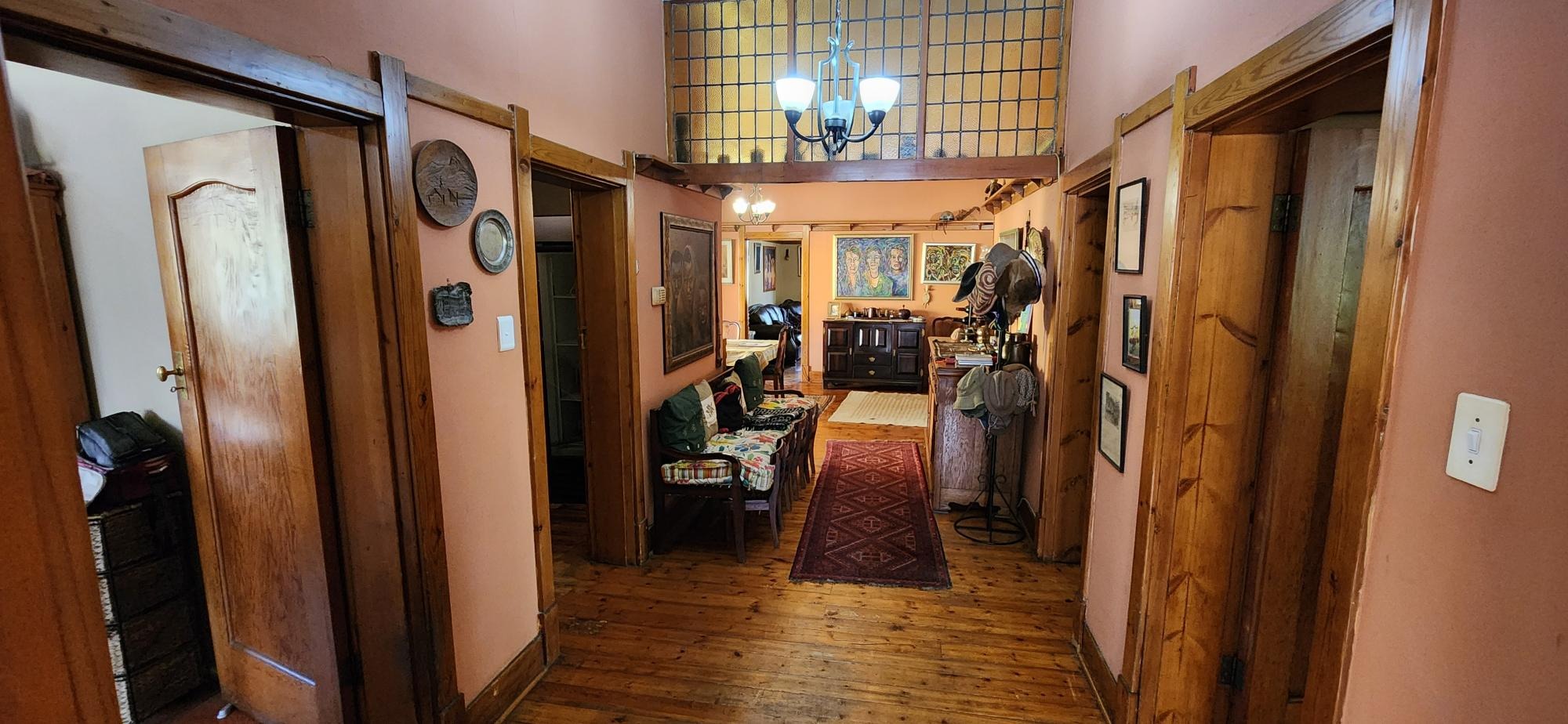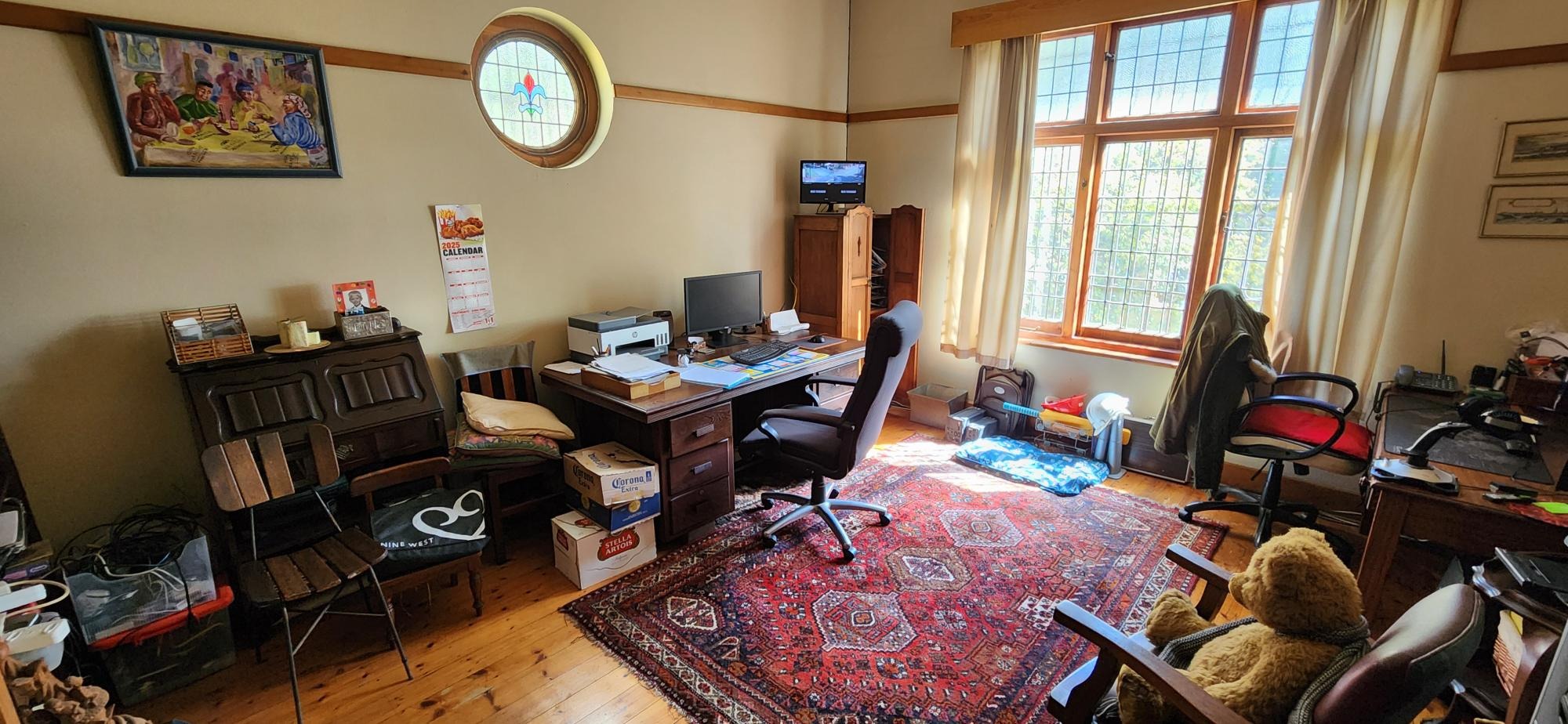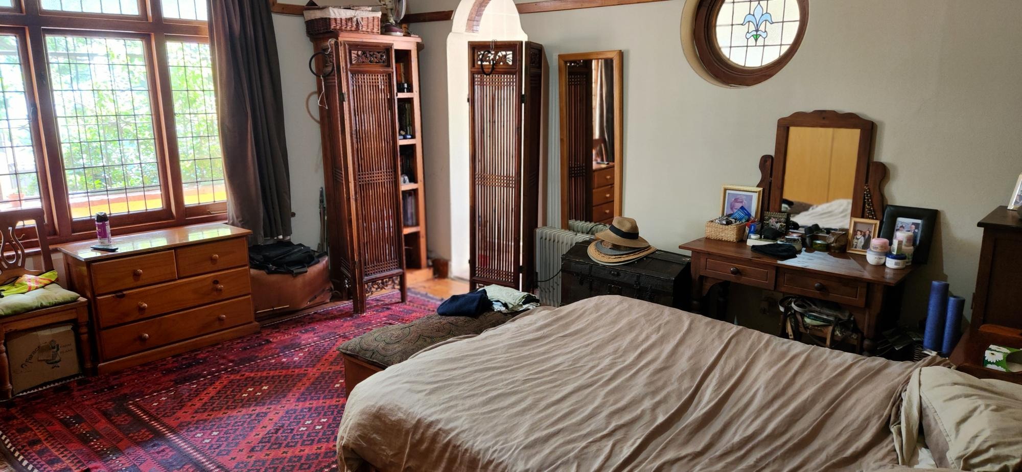 The main house consists of a wrap around covered well secured veranda which leads into the entrance hall area of the home .The large living areas consist of a formal lounge with wood burning fire place , TV lounge with fire place , a study area and a huge dining room all ideally situated near to the spacious fitted kitchen with gas stove . There are 5 spacious bedrooms in total in the main house , 3 of the 5 bedrooms are on the lower level . The main bedroom has an en-suite bathroom and the 2nd and 3rd bedroom share the 2nd bathroom . The upper level of the home consists of a large open plan lounge area which leads out onto a lovely spacious patio overlooking the swimming pool and large garden , 2 spacious bedrooms and a full bathroom . There is also a self contained separate cottage consisting of a lounge , bedroom and a bathroom and space for a kitchenette .