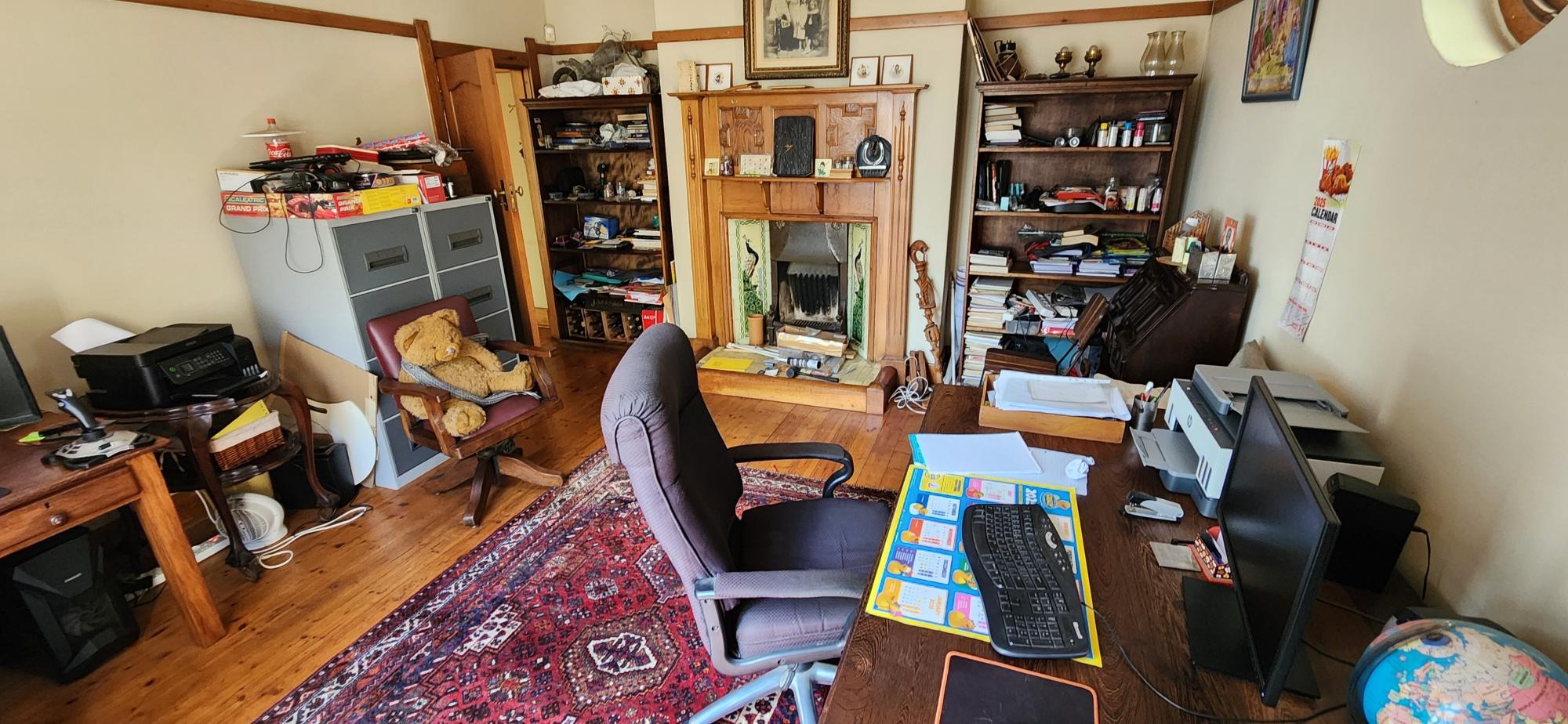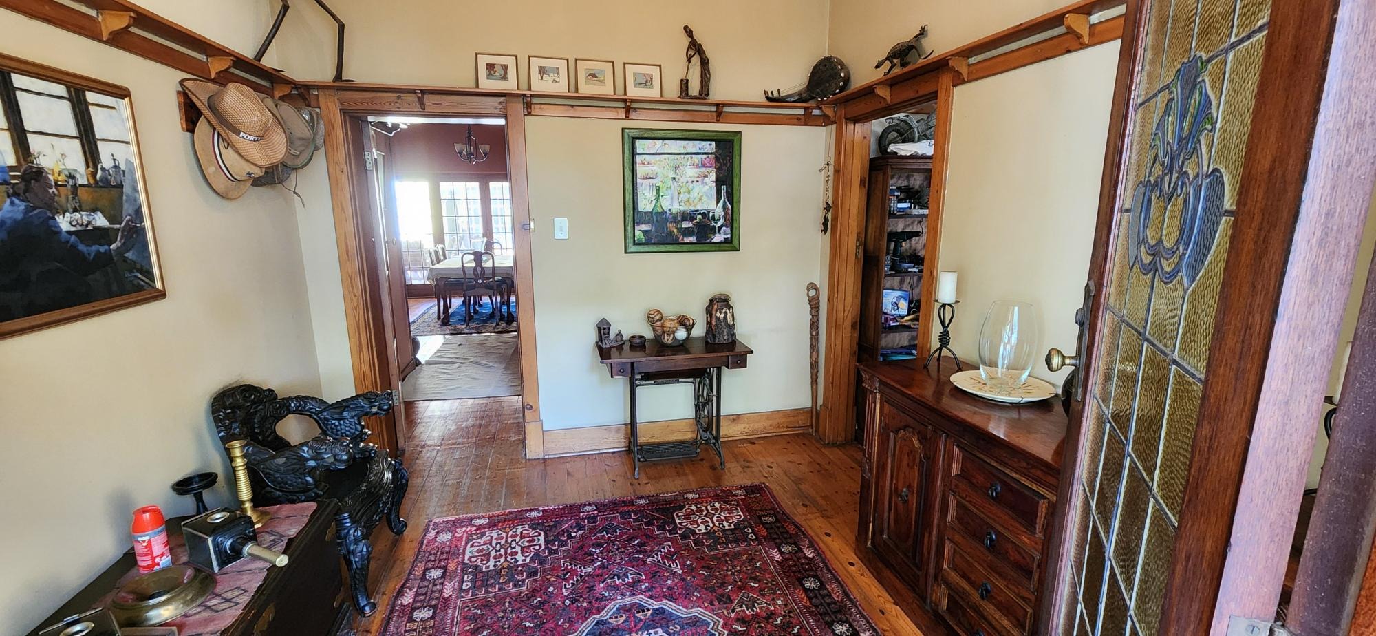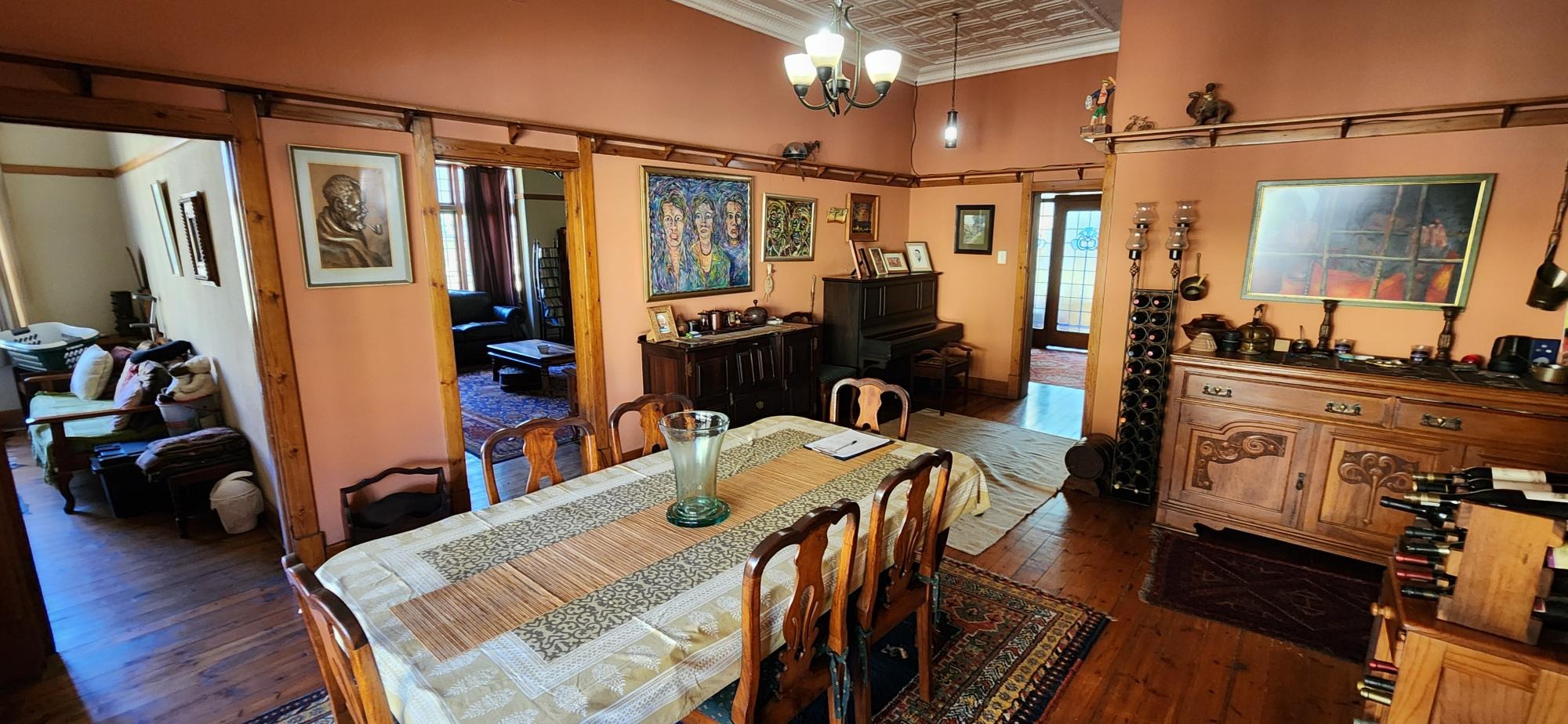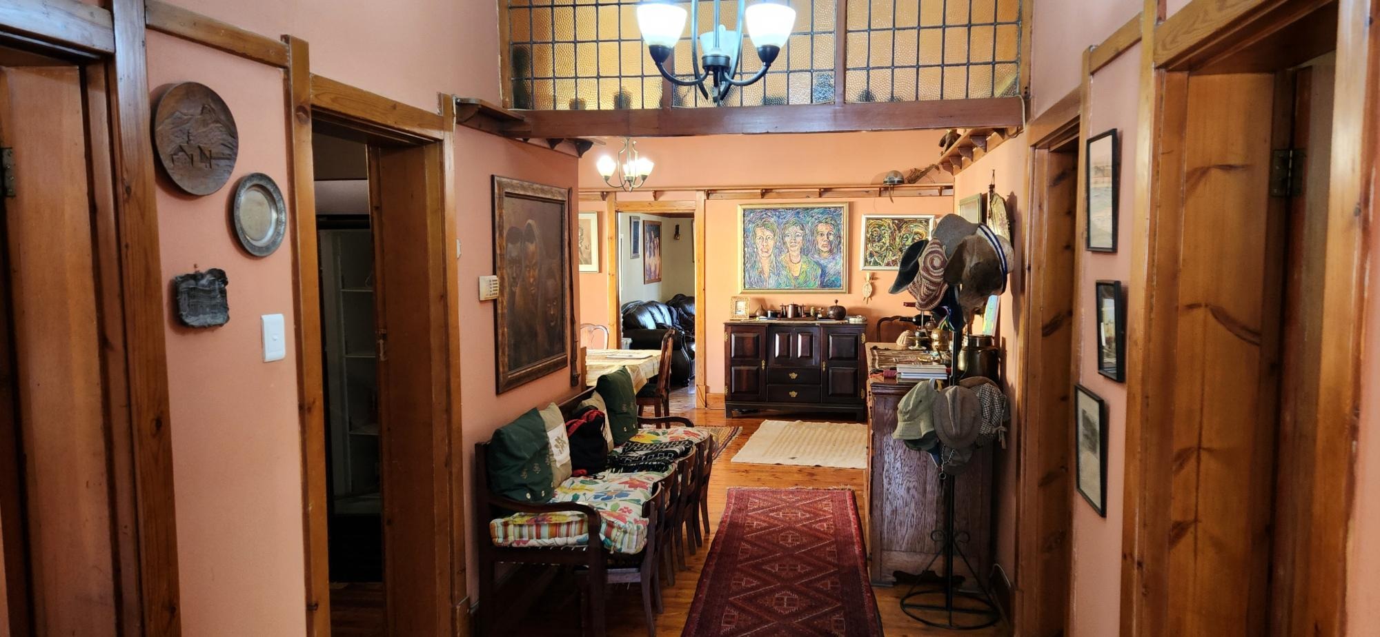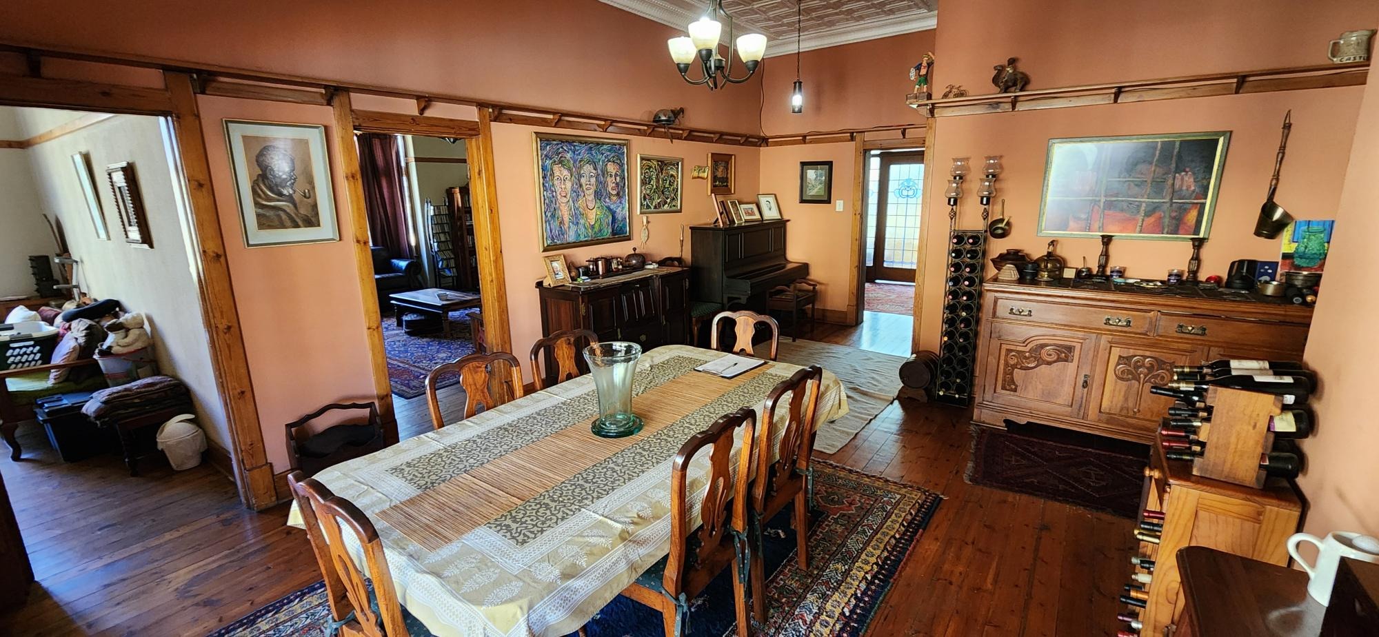 The main house consists of a wrap around covered well secured veranda which leads into the entrance hall area of the home .The large living areas consist of a formal lounge with wood burning fire place , TV lounge with fire place , a study area and a huge dining room all ideally situated near to the spacious fitted kitchen with gas stove . There are 5 spacious bedrooms in total in the main house , 3 of the 5 bedrooms are on the lower level . The main bedroom has an en-suite bathroom and the 2nd and 3rd bedroom share the 2nd bathroom . The upper level of the home consists of a large open plan lounge area which leads out onto a lovely spacious patio overlooking the swimming pool and large garden , 2 spacious bedrooms and a full bathroom . There is also a self contained separate cottage consisting of a lounge , bedroom and a bathroom and space for a kitchenette .
