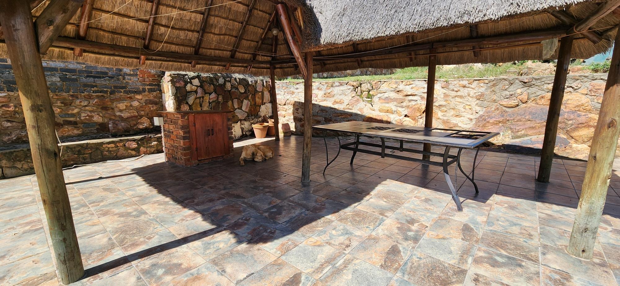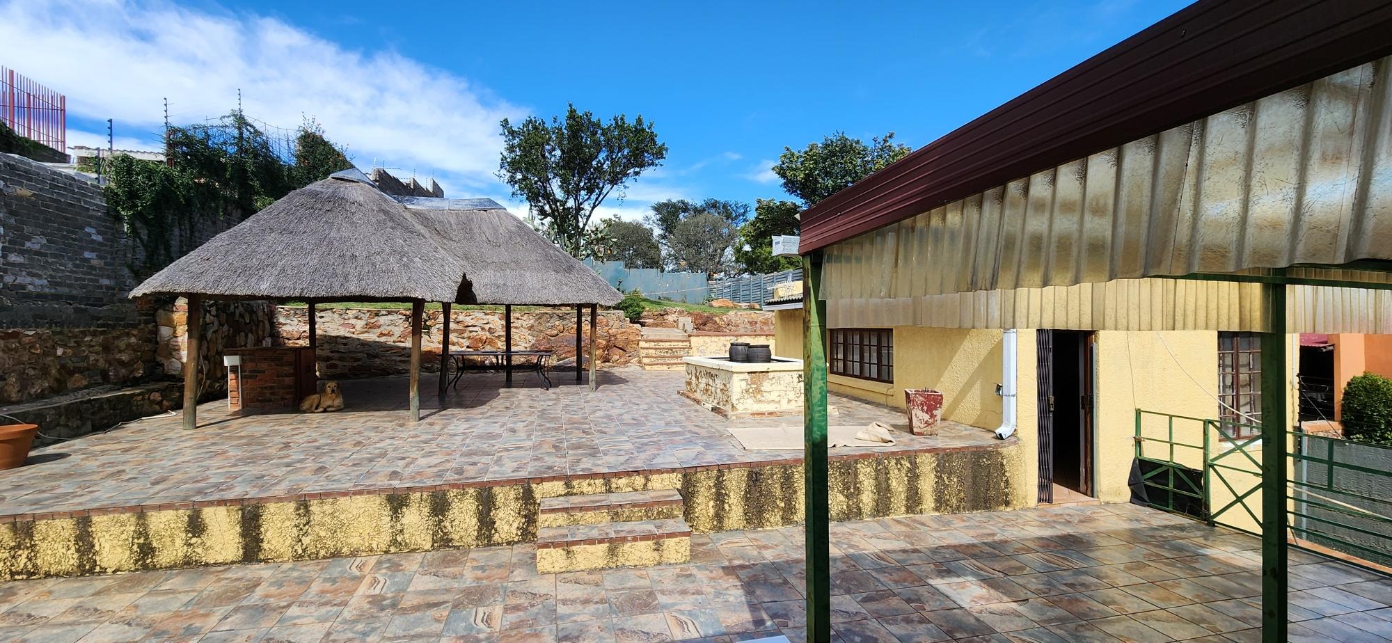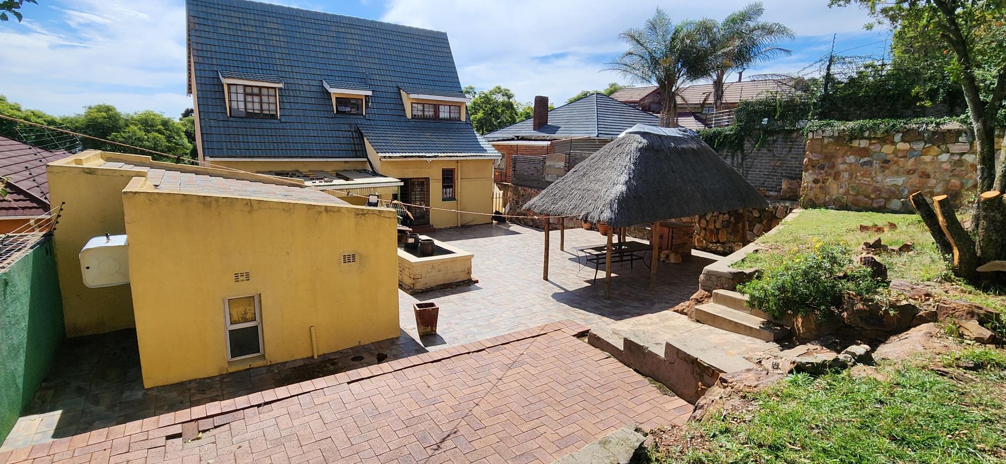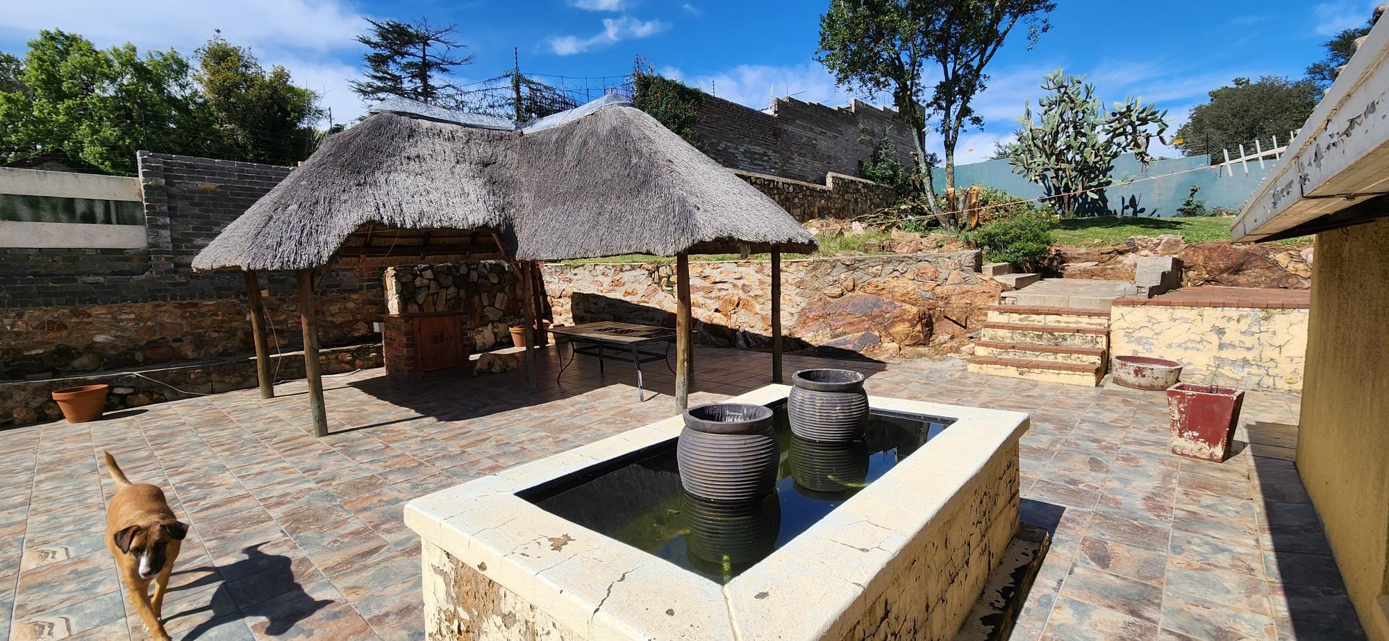 The property consists of a spacious covered patio which leads into the open plan entrance hall and lounge , an open plan dining room and TV lounge which lead out onto a covered patio and a lovely spacious Lapa with built in braai , a fitted kitchen and laundry area plus a guest toilet and basin . Three bedrooms and 2 bathrooms plus a pajama lounge are located on the upper level of the home , The main bedroom has an en-suite full bathroom plus walk in cupboards . The property also has three additional rooms of which one has a toilet , basin and shower . There are 6 rooms in total plus ample space for additional cottages or out buildings to be built on. There are double garages and a workshop or storage area plus ample secure parking for visitors .