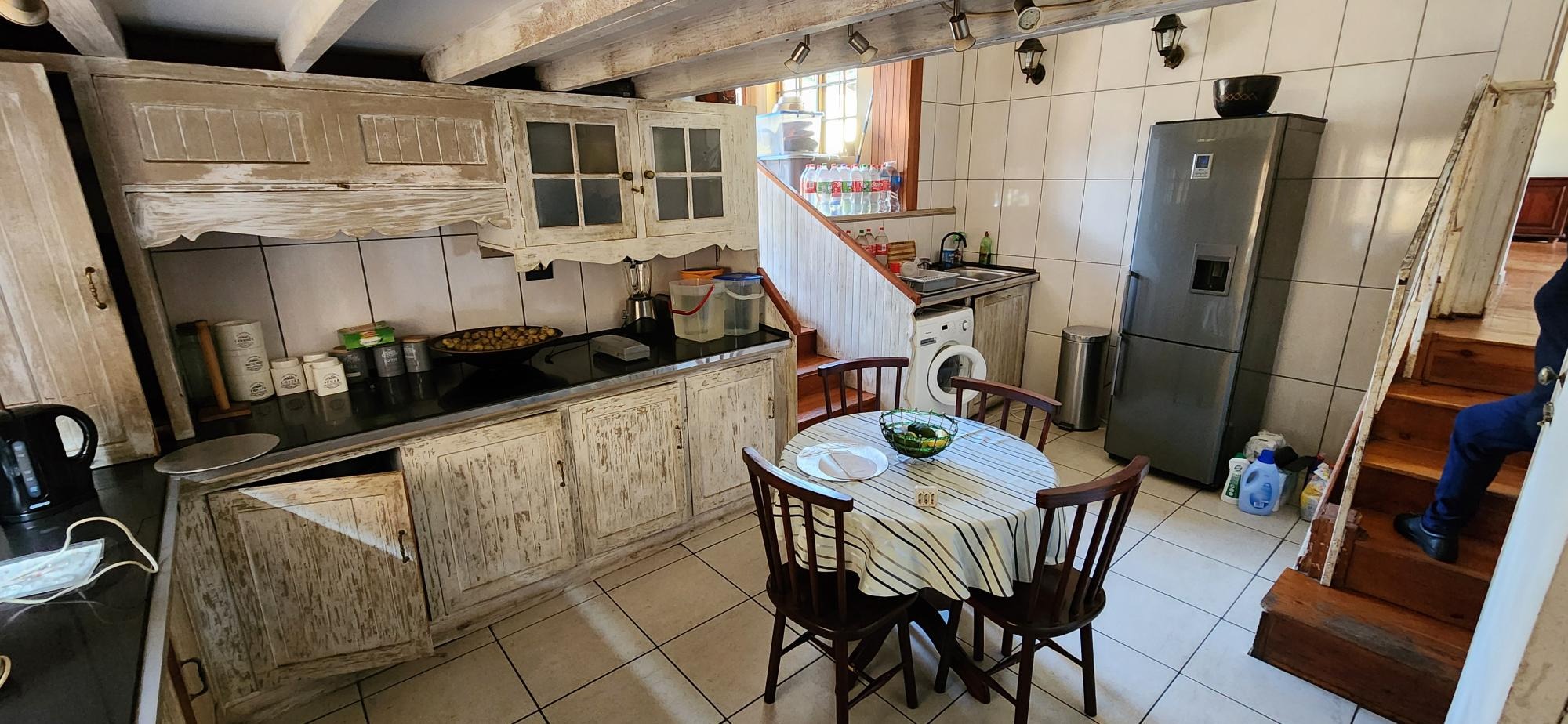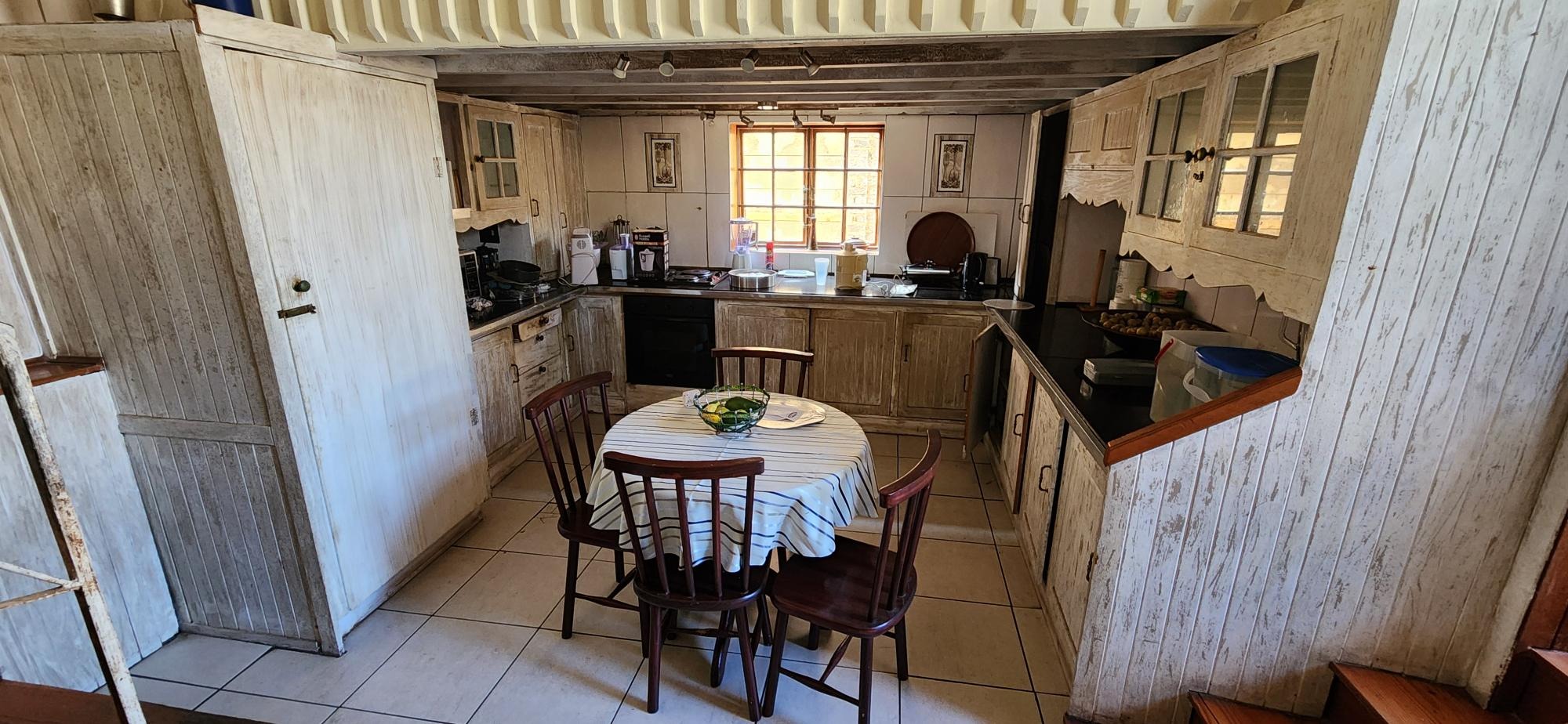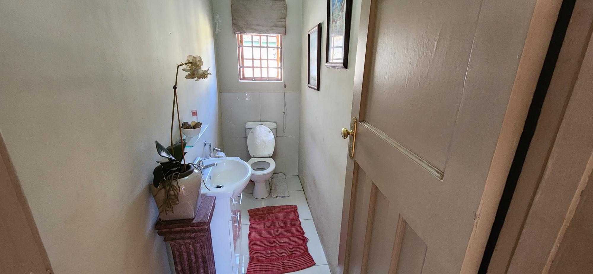 The property consists of a spacious covered patio which leads into the open plan entrance hall and lounge , an open plan dining room and TV lounge which lead out onto a covered patio and a lovely spacious Lapa with built in braai , a fitted kitchen and laundry area plus a guest toilet and basin . Three bedrooms and 2 bathrooms plus a pajama lounge are located on the upper level of the home , The main bedroom has an en-suite full bathroom plus walk in cupboards . The property also has three additional rooms of which one has a toilet , basin and shower . There are 6 rooms in total plus ample space for additional cottages or out buildings to be built on. There are double garages and a workshop or storage area plus ample secure parking for visitors .