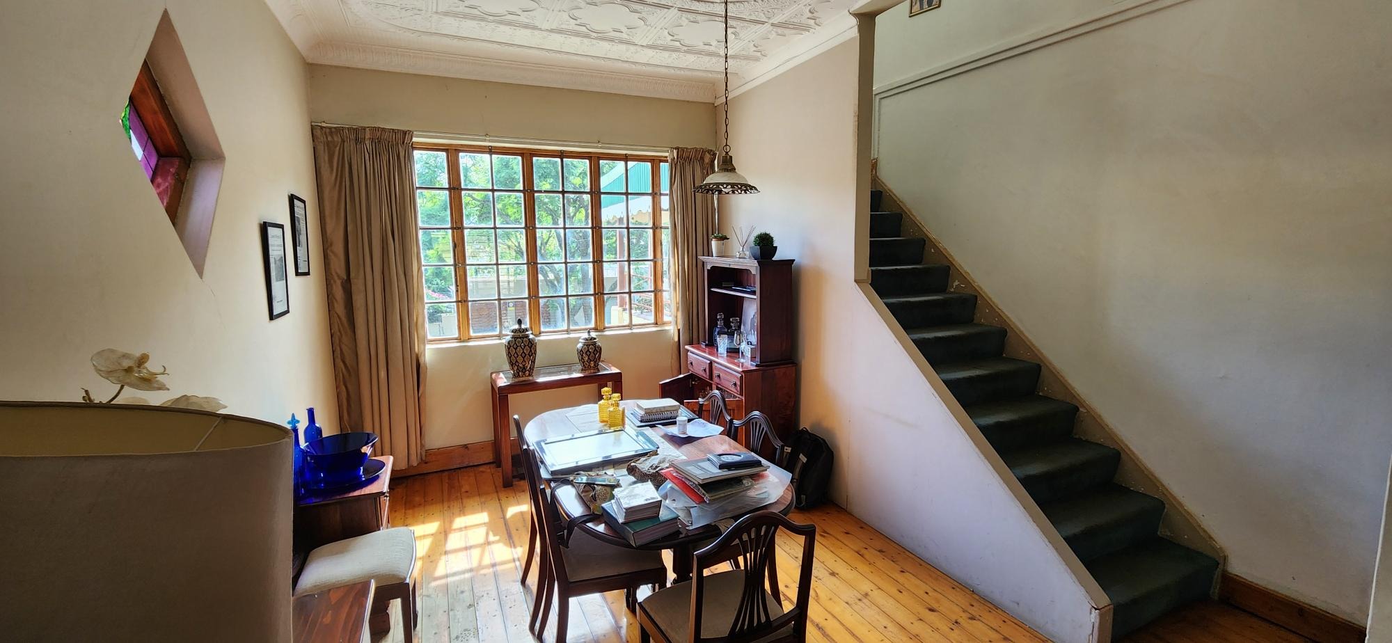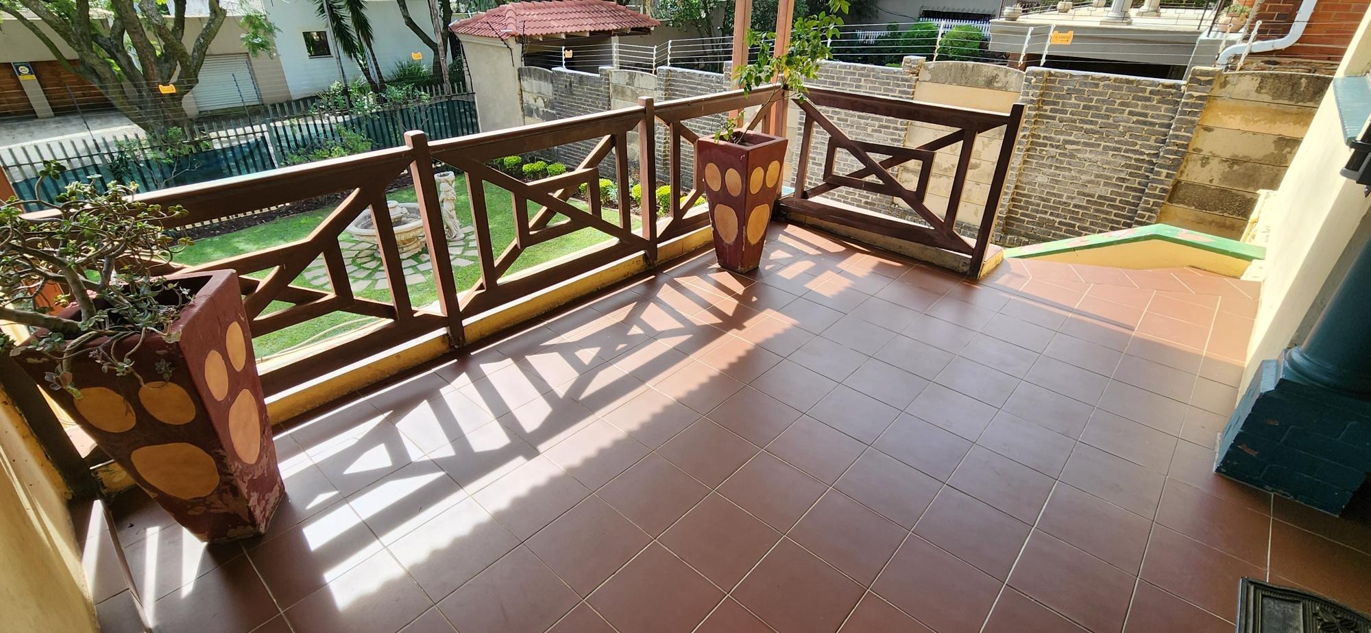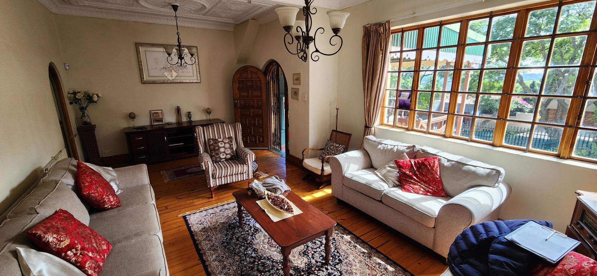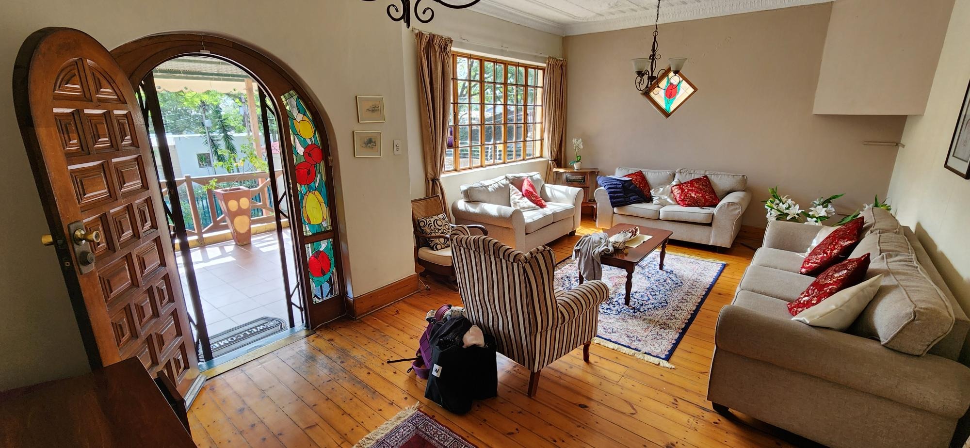 The property consists of a spacious covered patio which leads into the open plan entrance hall and lounge , an open plan dining room and TV lounge which lead out onto a covered patio and a lovely spacious Lapa with built in braai , a fitted kitchen and laundry area plus a guest toilet and basin . Three bedrooms and 2 bathrooms plus a pajama lounge are located on the upper level of the home , The main bedroom has an en-suite full bathroom plus walk in cupboards . The property also has three additional rooms of which one has a toilet , basin and shower . There are 6 rooms in total plus ample space for additional cottages or out buildings to be built on. There are double garages and a workshop or storage area plus ample secure parking for visitors .