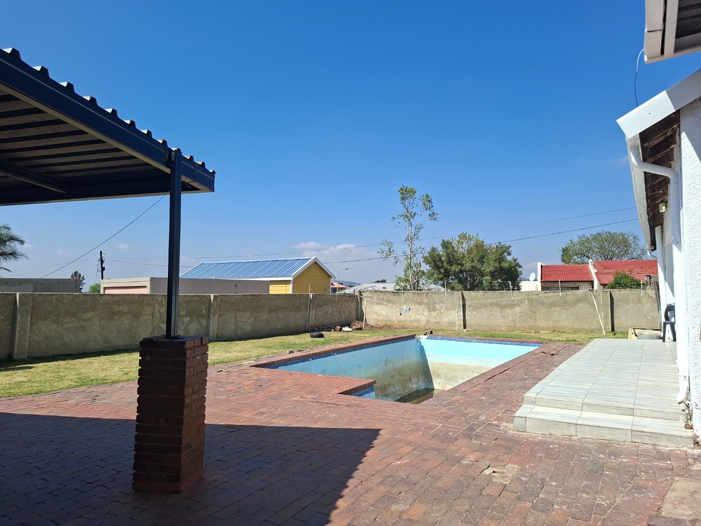 Stepping out to the spacious backyard area is a patio, swimming pool, side entrance to the garage which can park 4 vehicles and a laundry / work area.