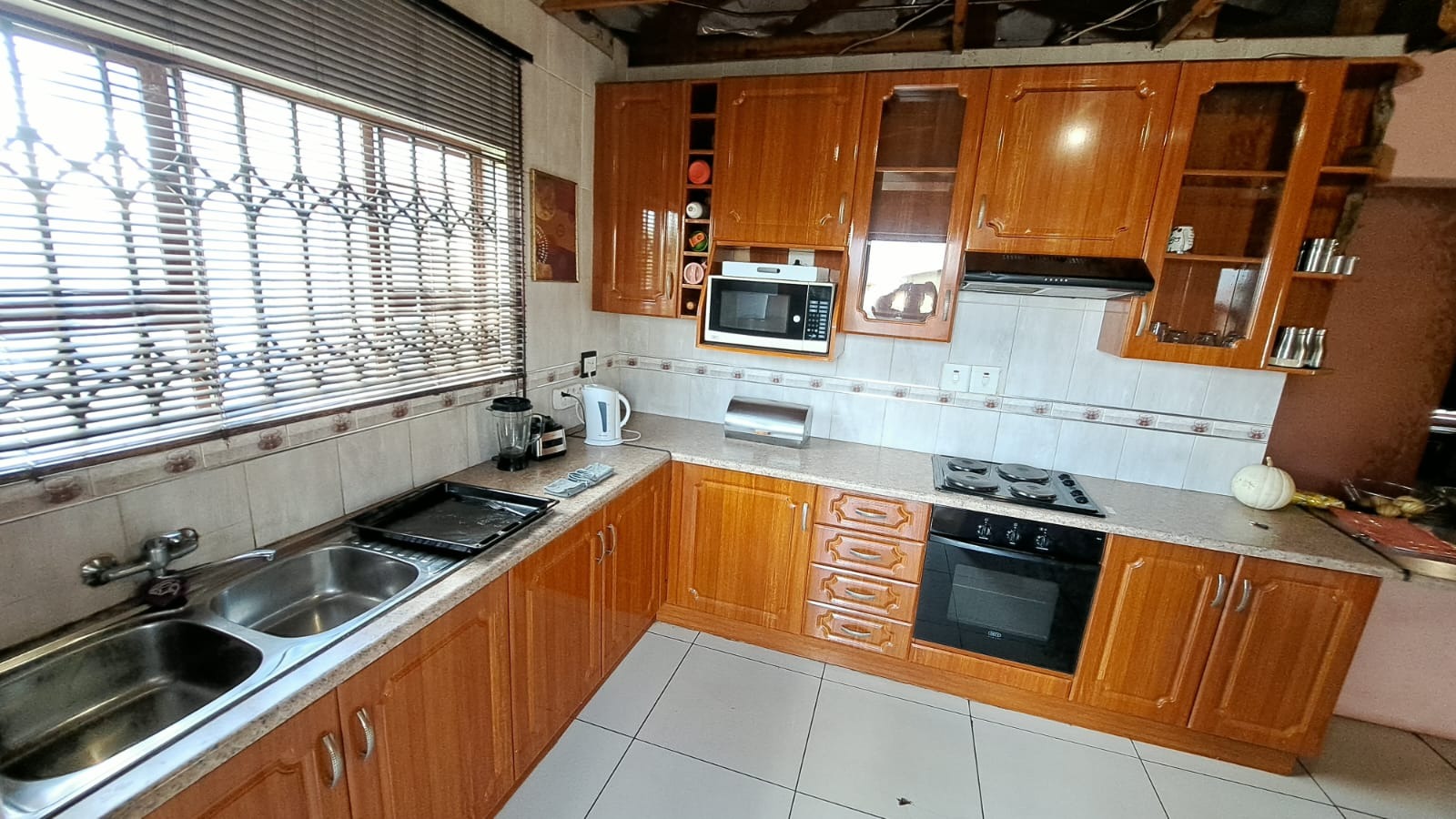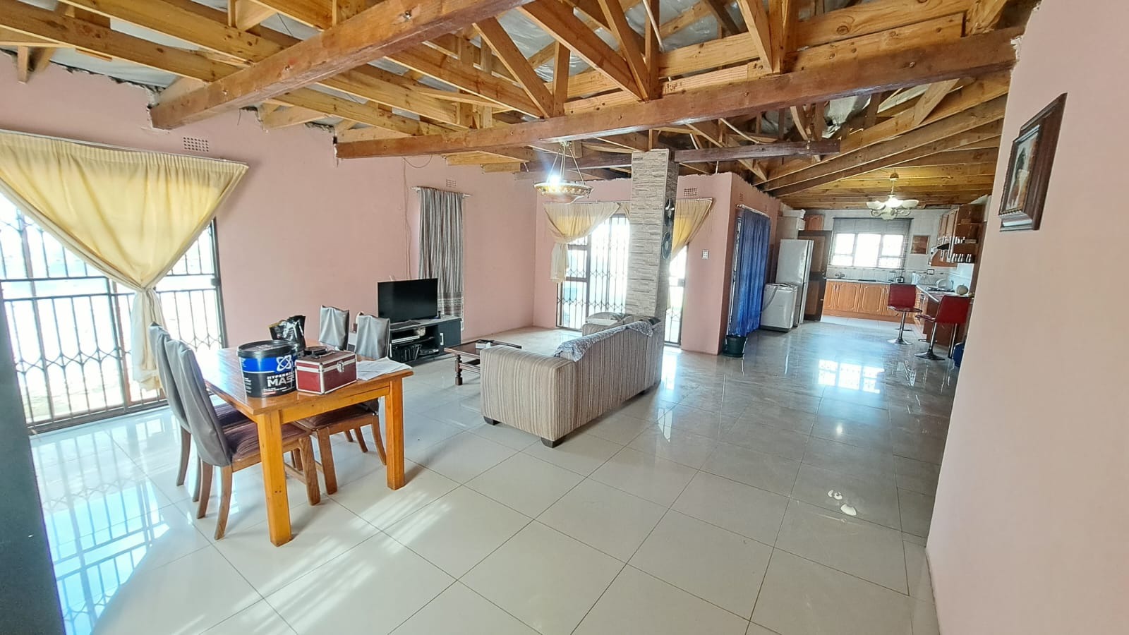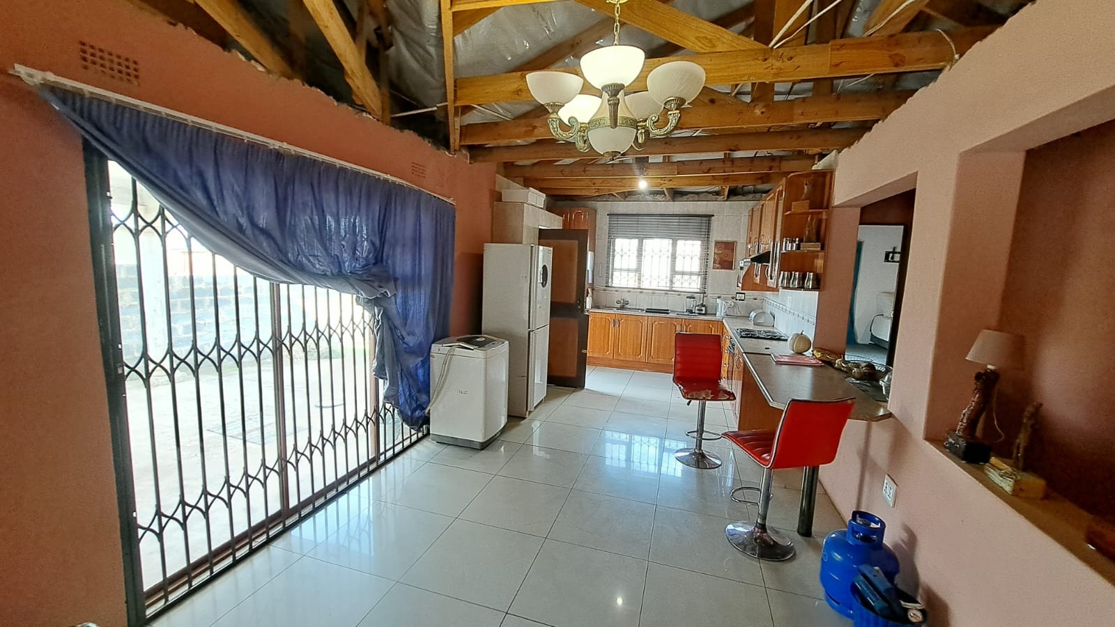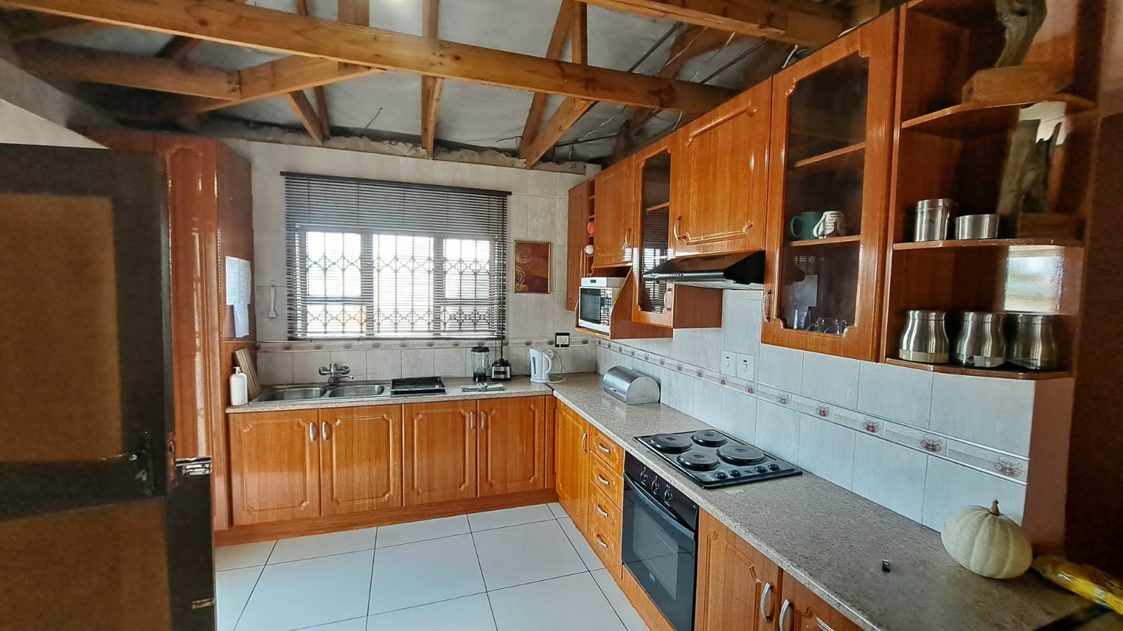 Inside, the home features a large open-plan lounge and dining area with tiled floors and exposed wooden roof beams, creating a warm and open atmosphere with plenty of natural light. The kitchen is fitted with built-in cupboards and offers good counter space, making it practical for everyday cooking and family use.