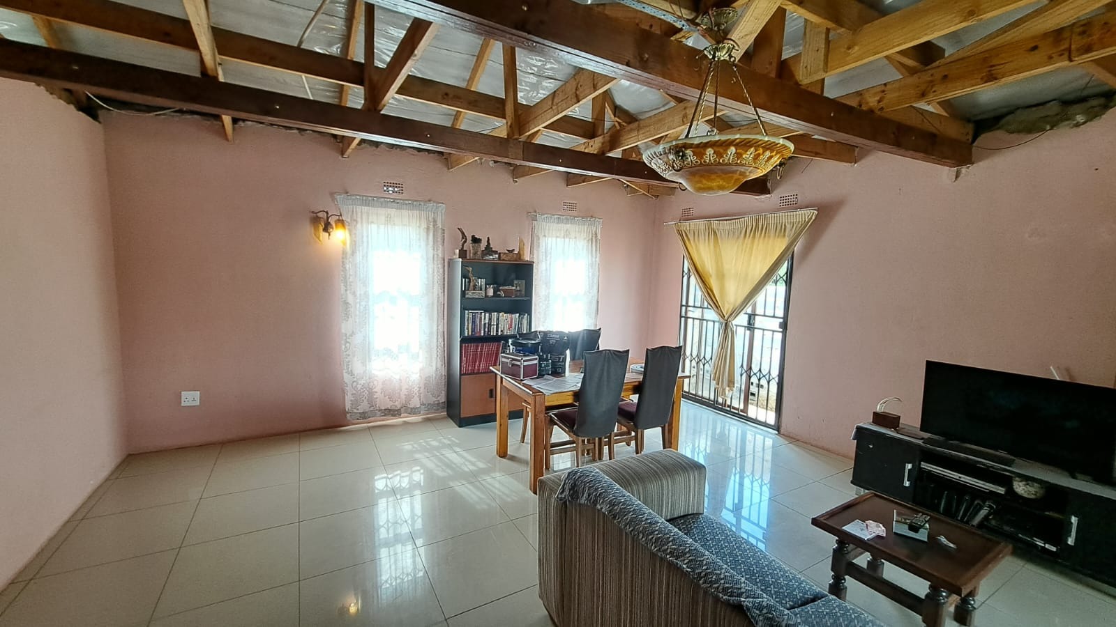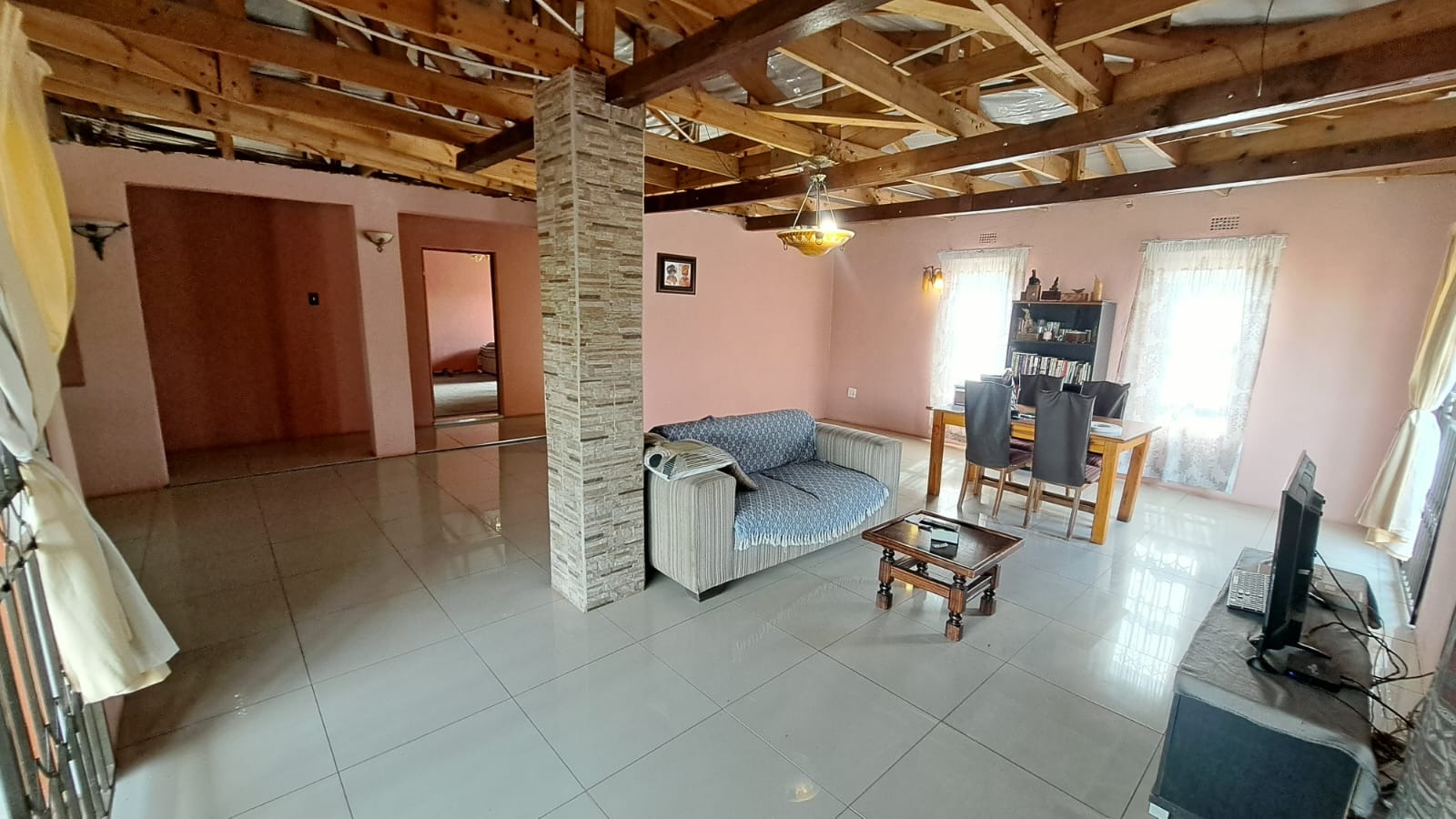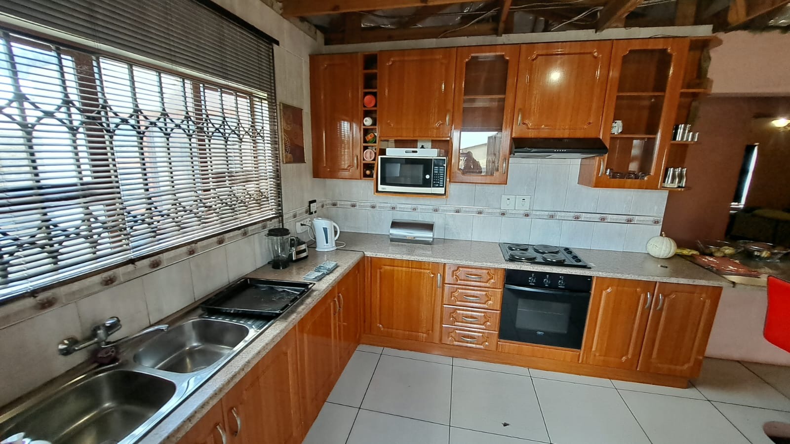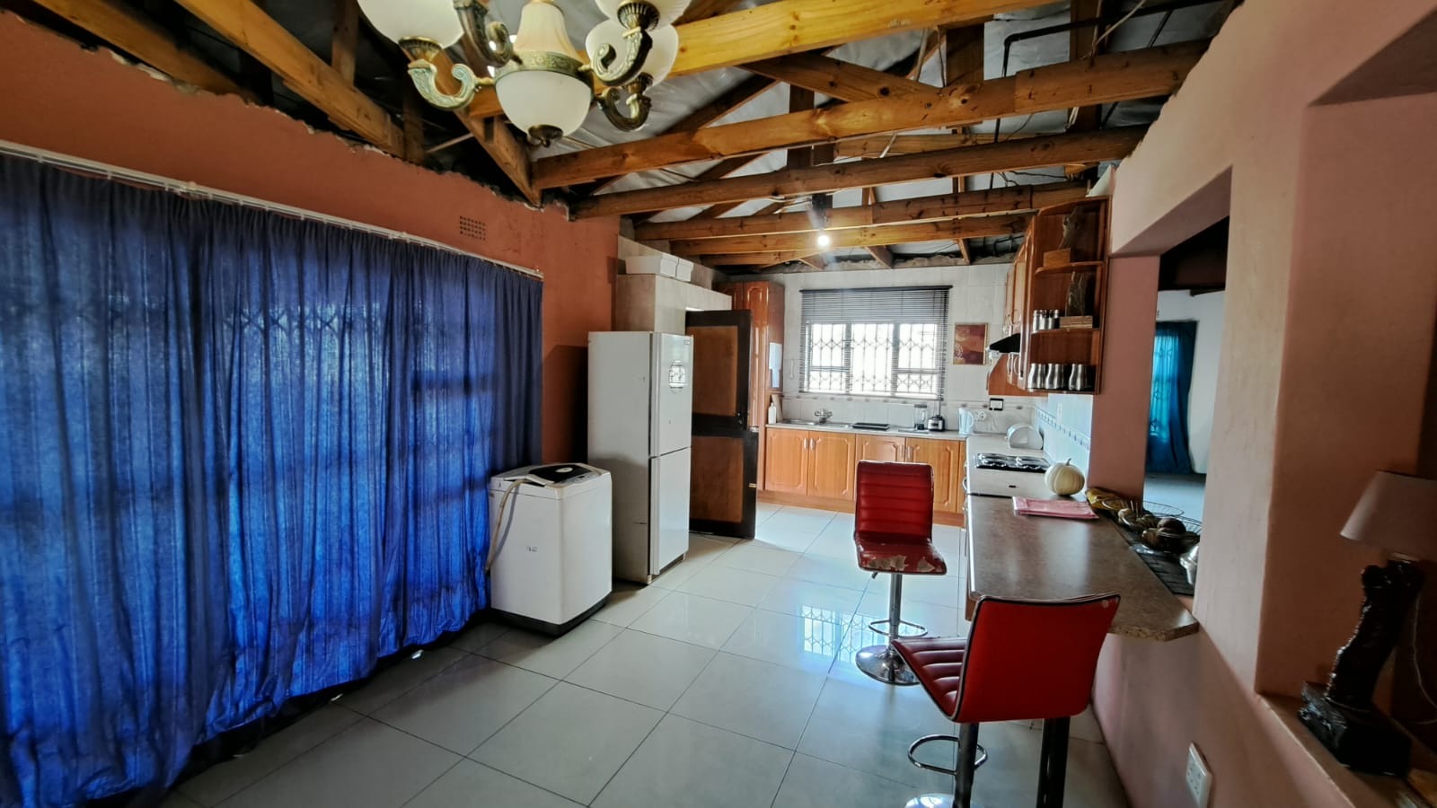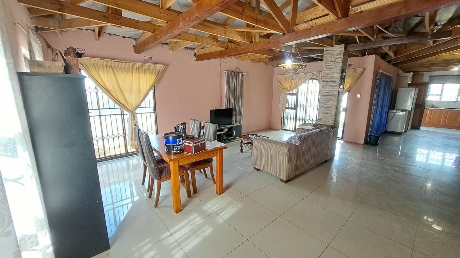 Inside, the home features a large open-plan lounge and dining area with tiled floors and exposed wooden roof beams, creating a warm and open atmosphere with plenty of natural light. The kitchen is fitted with built-in cupboards and offers good counter space, making it practical for everyday cooking and family use.