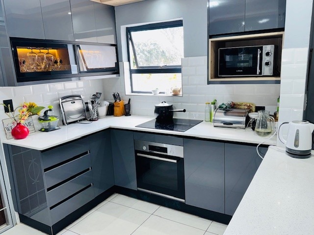 The modern kitchen is beautifully finished with sleek cabinetry, quality countertops and ample storage space. Designed with both style and functionality in mind, the kitchen offers generous preparation space and modern fittings, making it the perfect hub for cooking and entertaining.
