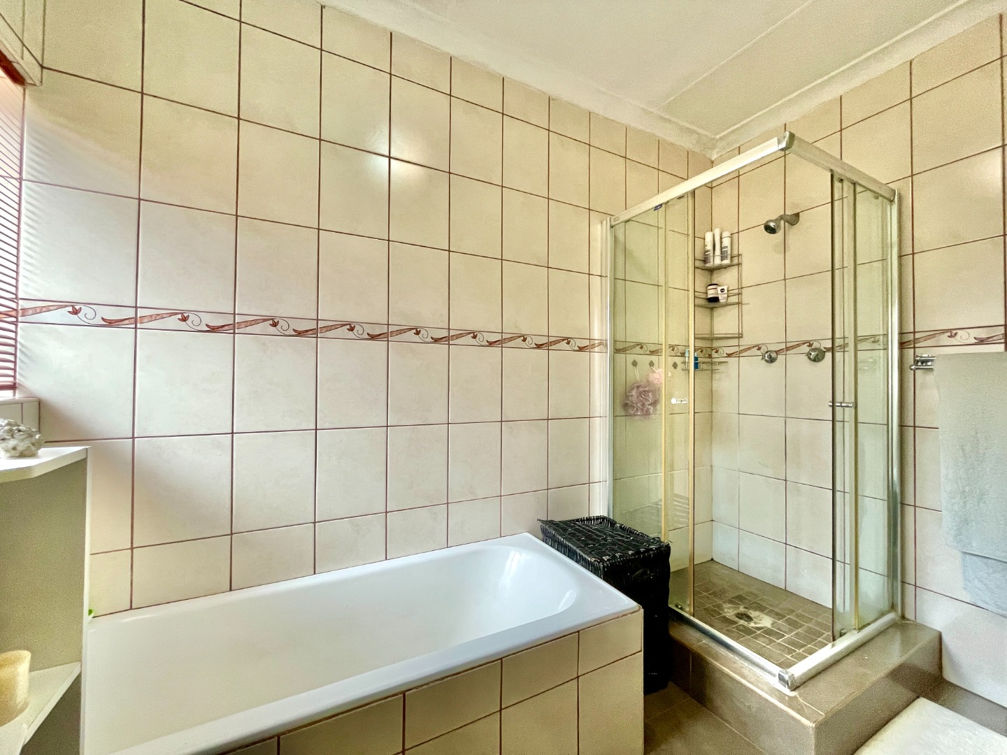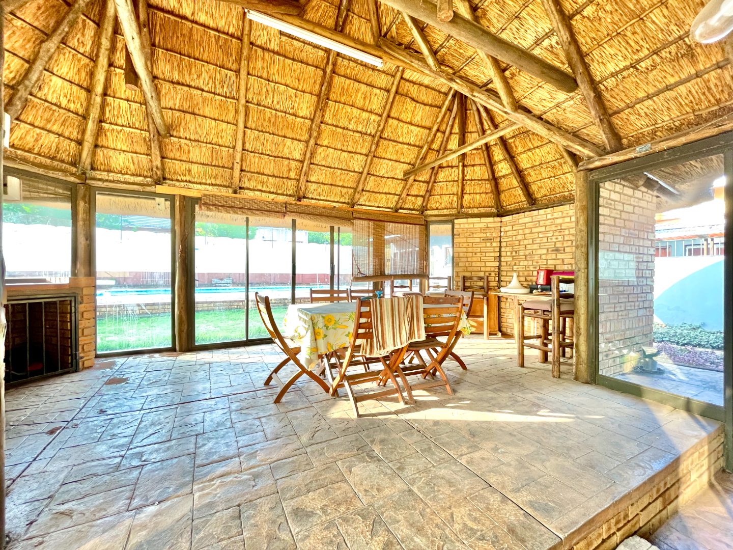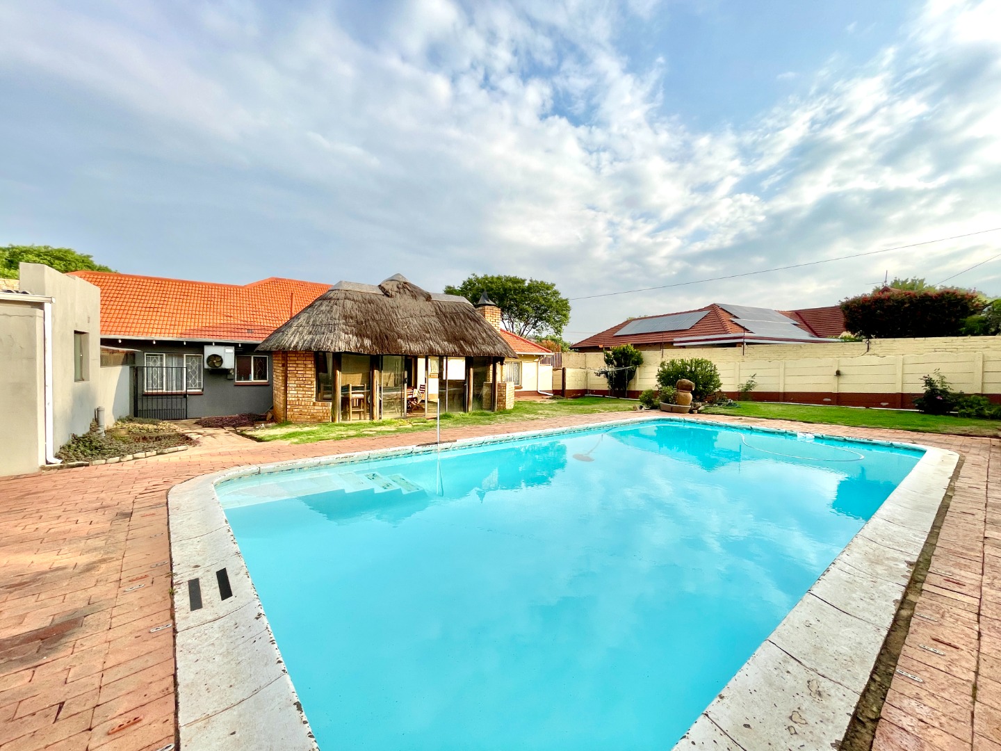 The main house features four spacious bedrooms with built-in cupboards, including a main en-suite. A separate study provides the ideal work-from-home space and can easily be used as an additional bedroom if needed. The kitchen is fitted with granite countertops and ample cupboard space, seamlessly flowing into the large dining room and open-plan lounge. The lounge opens to an inviting entertainment Lapa, overlooking the lush garden and sparkling pool – the ideal setting for family gatherings or relaxed weekends.
