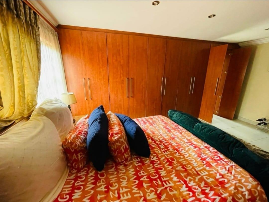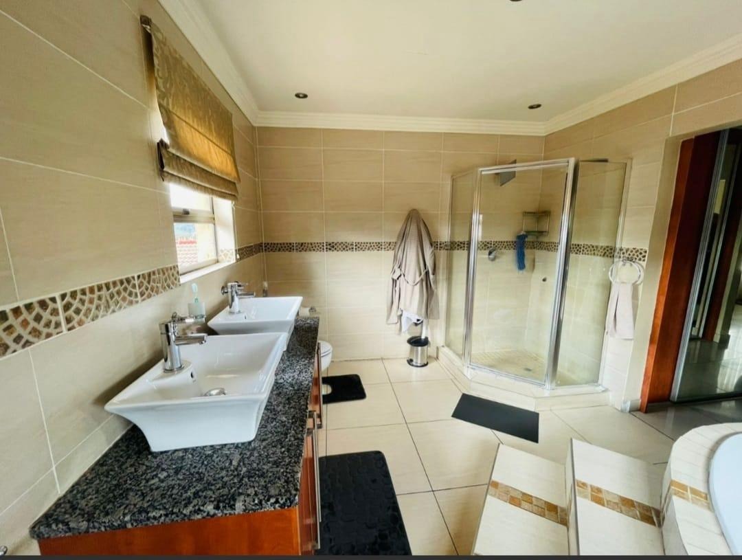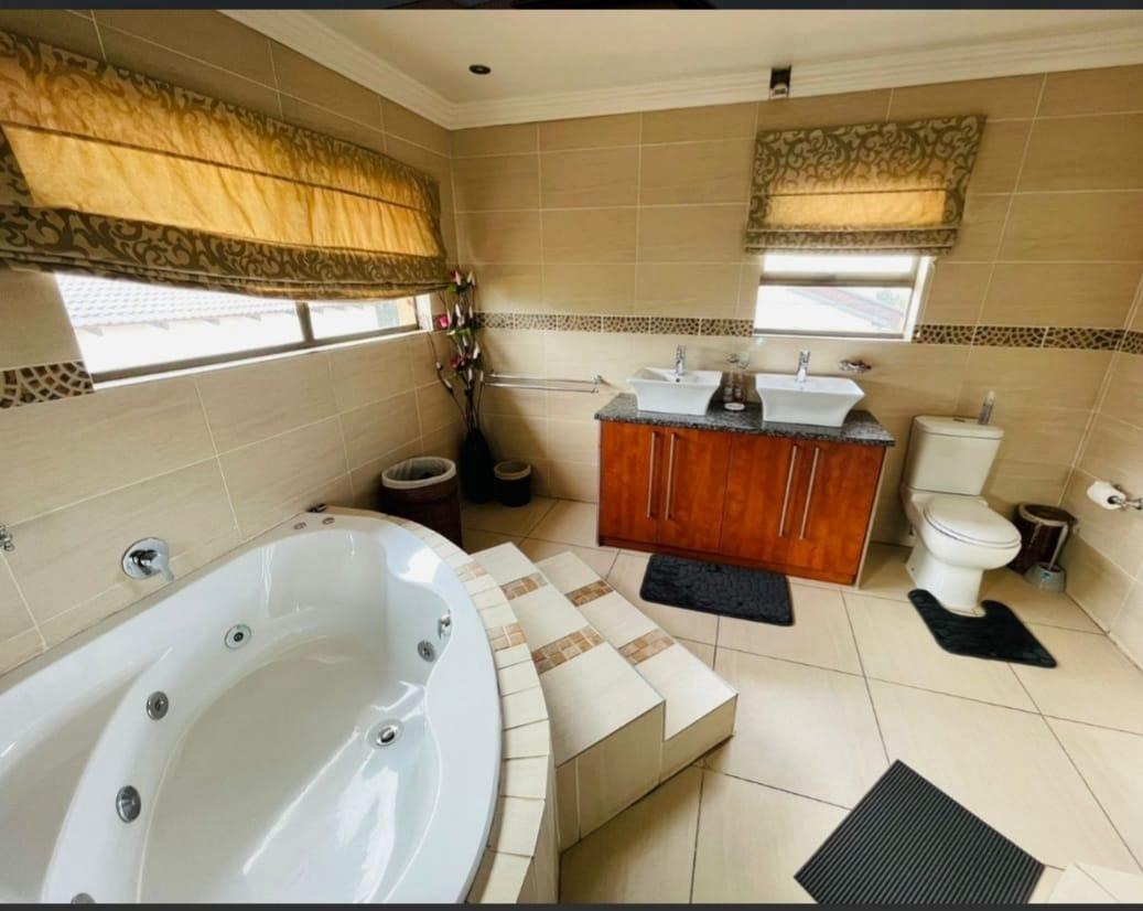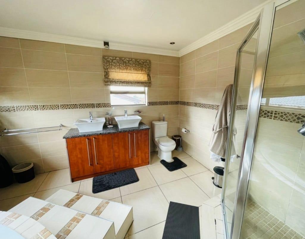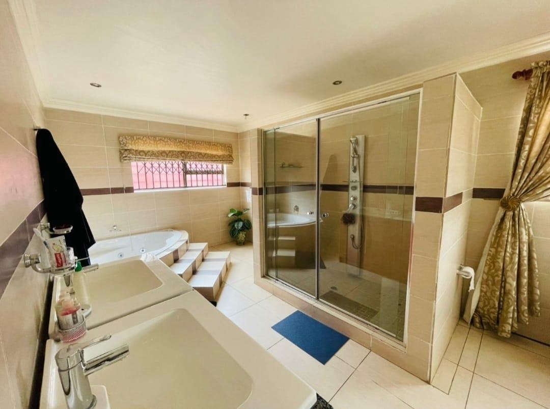 This spectacular property offers the perfect blend of luxury, space, and endless possibilities for a growing family located in Meredale, Johannesburg. The property offers five spacious bedrooms with built in cupboards and tiled flooring. The main bedroom offers his and hers walk-in-closets leading to the on suite bathroom with shower, bath, basin and toilet. The guest bedroom located downstairs has on suite bathroom with bath, shower, basin and toilet. There are two additional stunning full bathrooms one located downstairs and another one upstairs.
