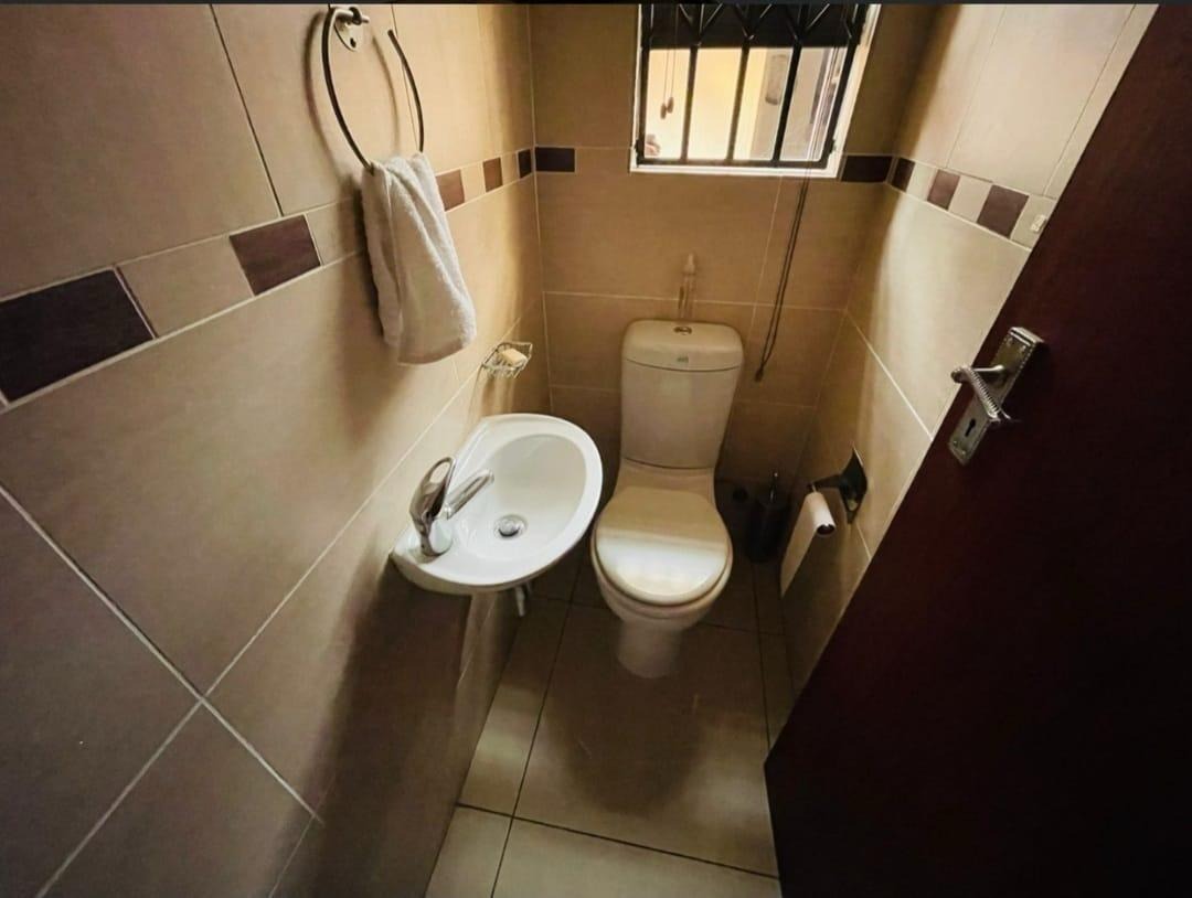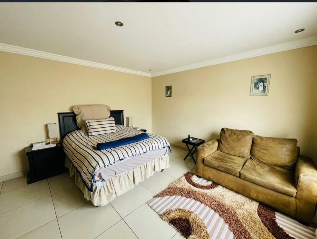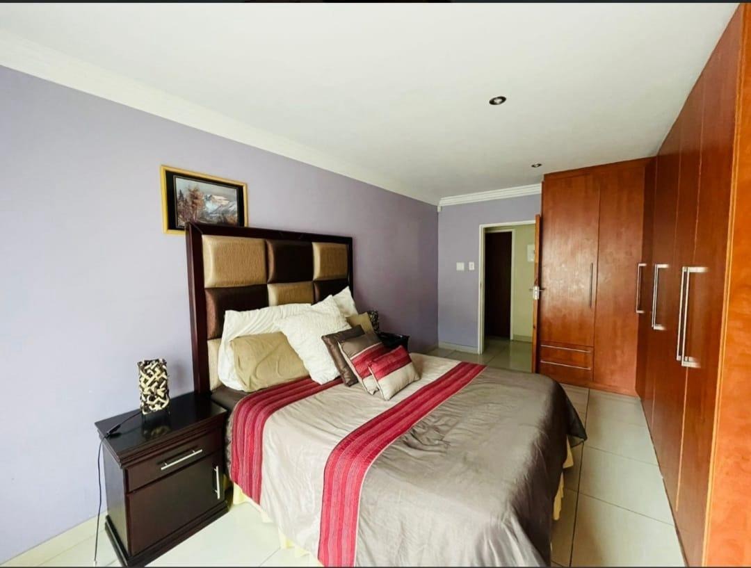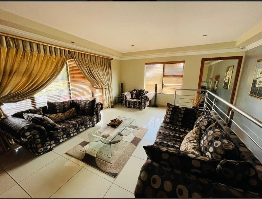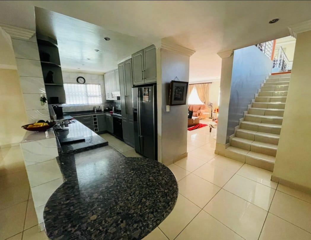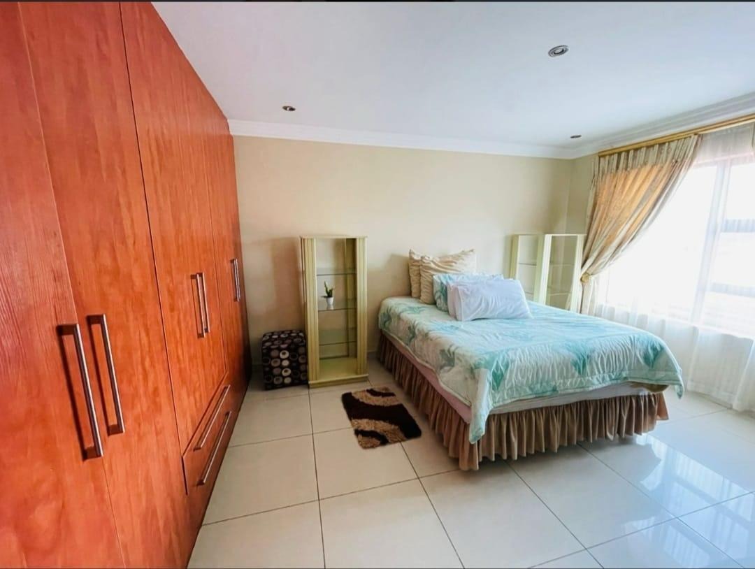 This spectacular property offers the perfect blend of luxury, space, and endless possibilities for a growing family located in Meredale, Johannesburg. The property offers five spacious bedrooms with built in cupboards and tiled flooring. The main bedroom offers his and hers walk-in-closets leading to the on suite bathroom with shower, bath, basin and toilet. The guest bedroom located downstairs has on suite bathroom with bath, shower, basin and toilet. There are two additional stunning full bathrooms one located downstairs and another one upstairs.