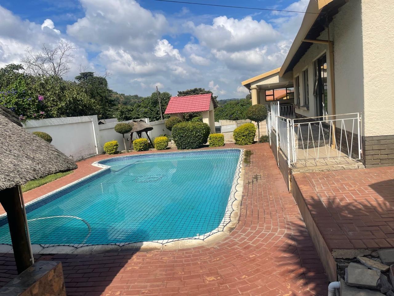 -An entertainment area with a swimming pool and a lapa