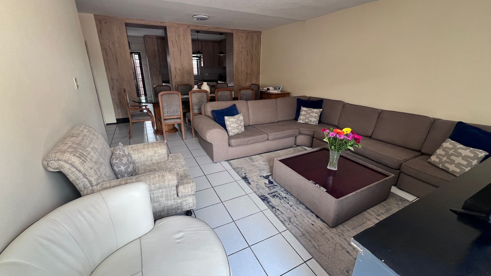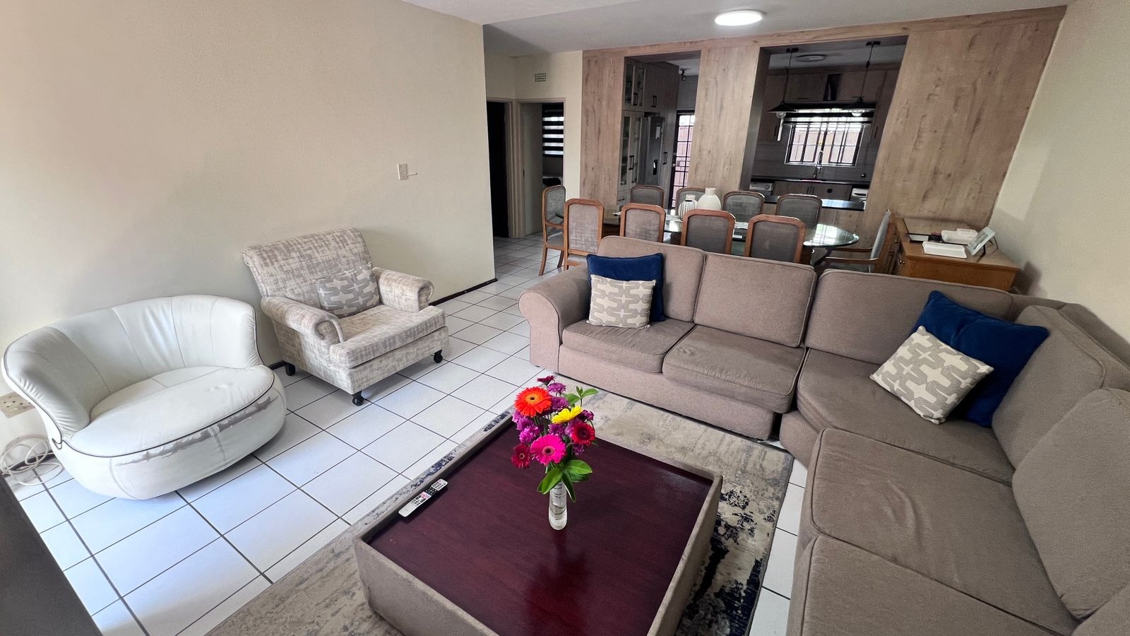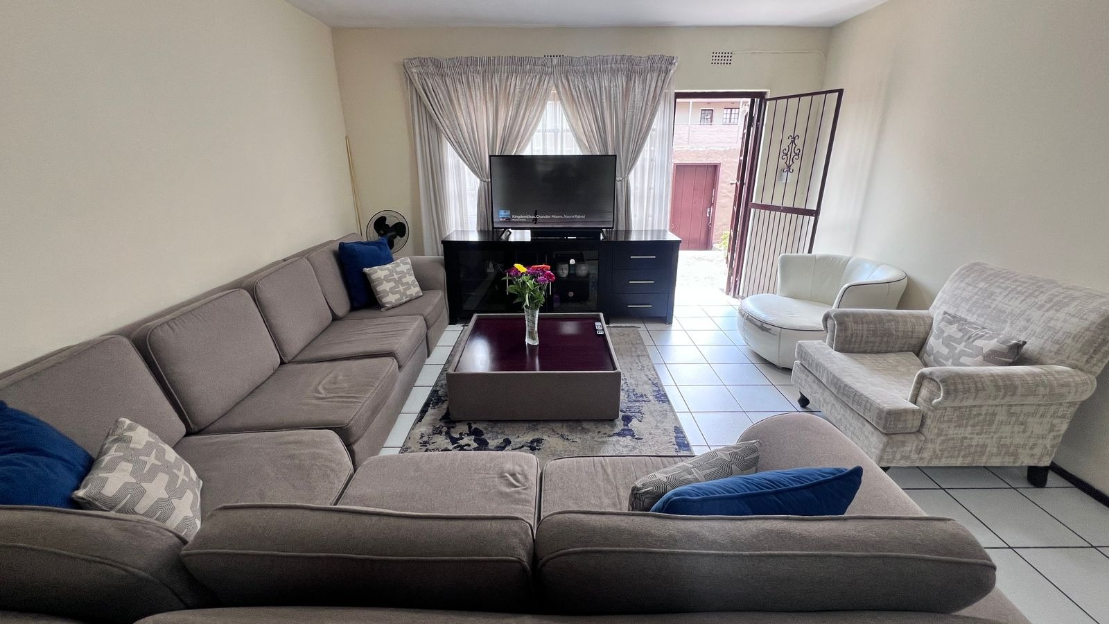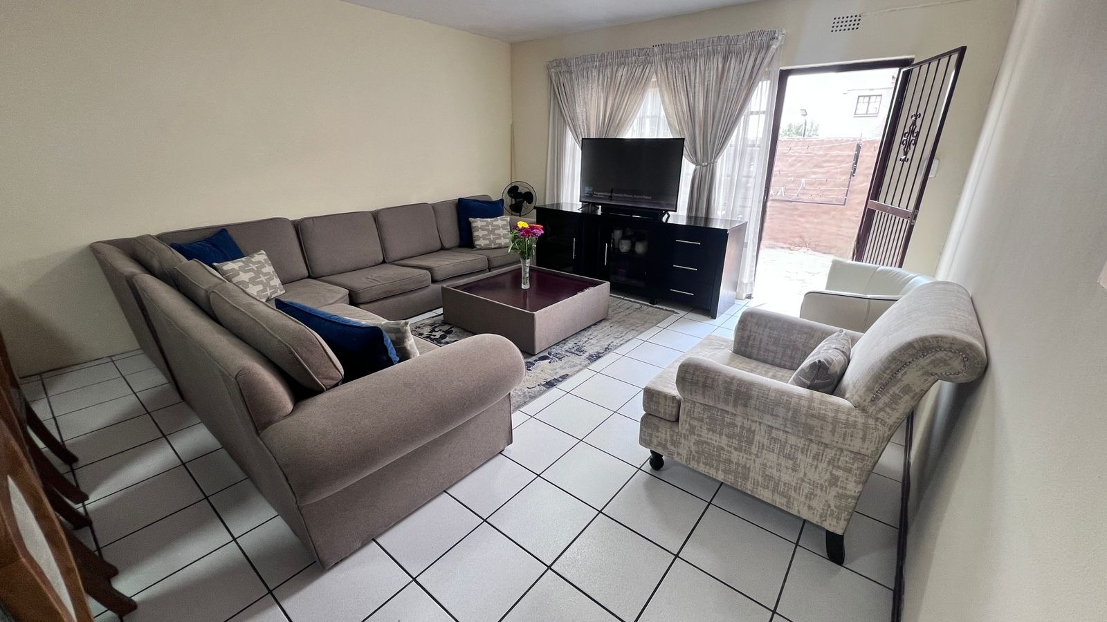 Upon entry from the main access, you are welcomed by a generously sized private patio, ideal for outdoor seating and braai/BBQ entertaining. The patio leads into the apartment’s main entrance, opening into a spacious open-plan lounge and dining area, designed for relaxed everyday living.