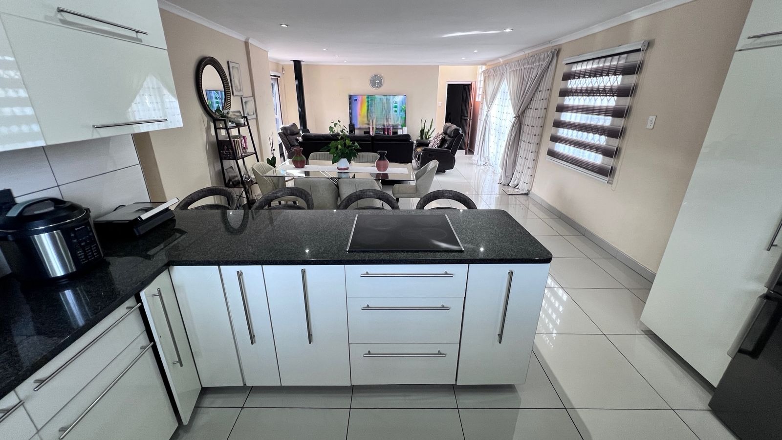 The lounge area is enhanced by a cozy fireplace, creating a warm and inviting atmosphere — perfect for relaxing evenings and winter days. Beautiful tiled flooring flows throughout the home, adding a stylish and low-maintenance finish. The kitchen is elegantly designed with modern finishes and ample space, making it both functional and visually appealing.