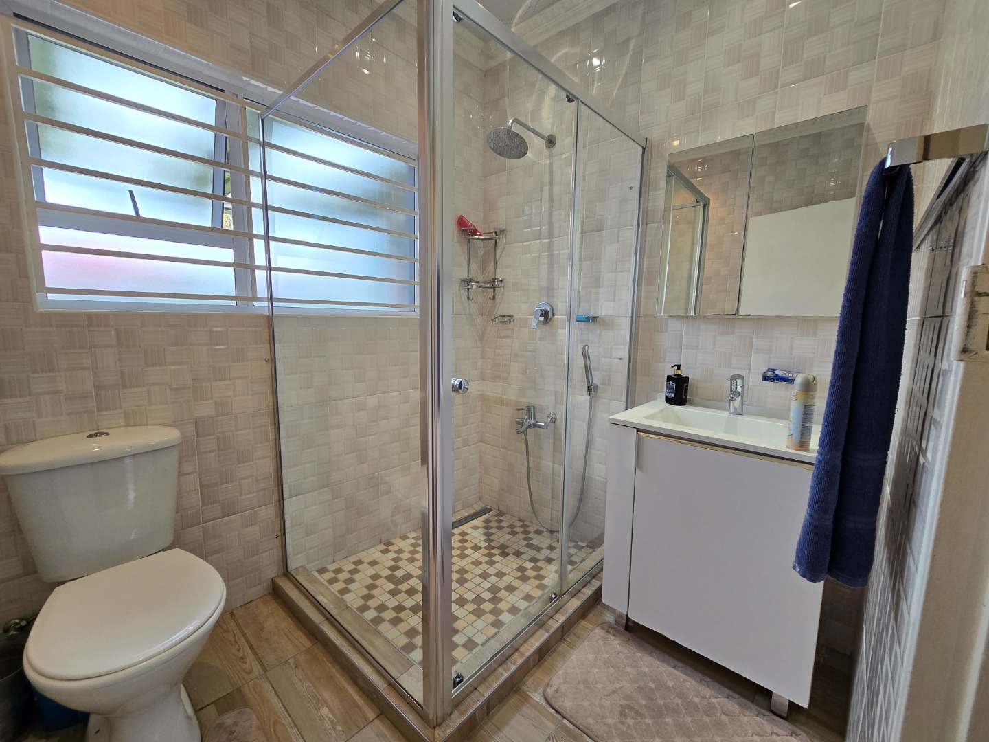 The three well-appointed bedrooms feature built-in cupboards that offer ample storage space. The home boasts two contemporary bathrooms, each with a shower, toilet, and basin, finished with sleek, modern touches for both family and guest convenience.