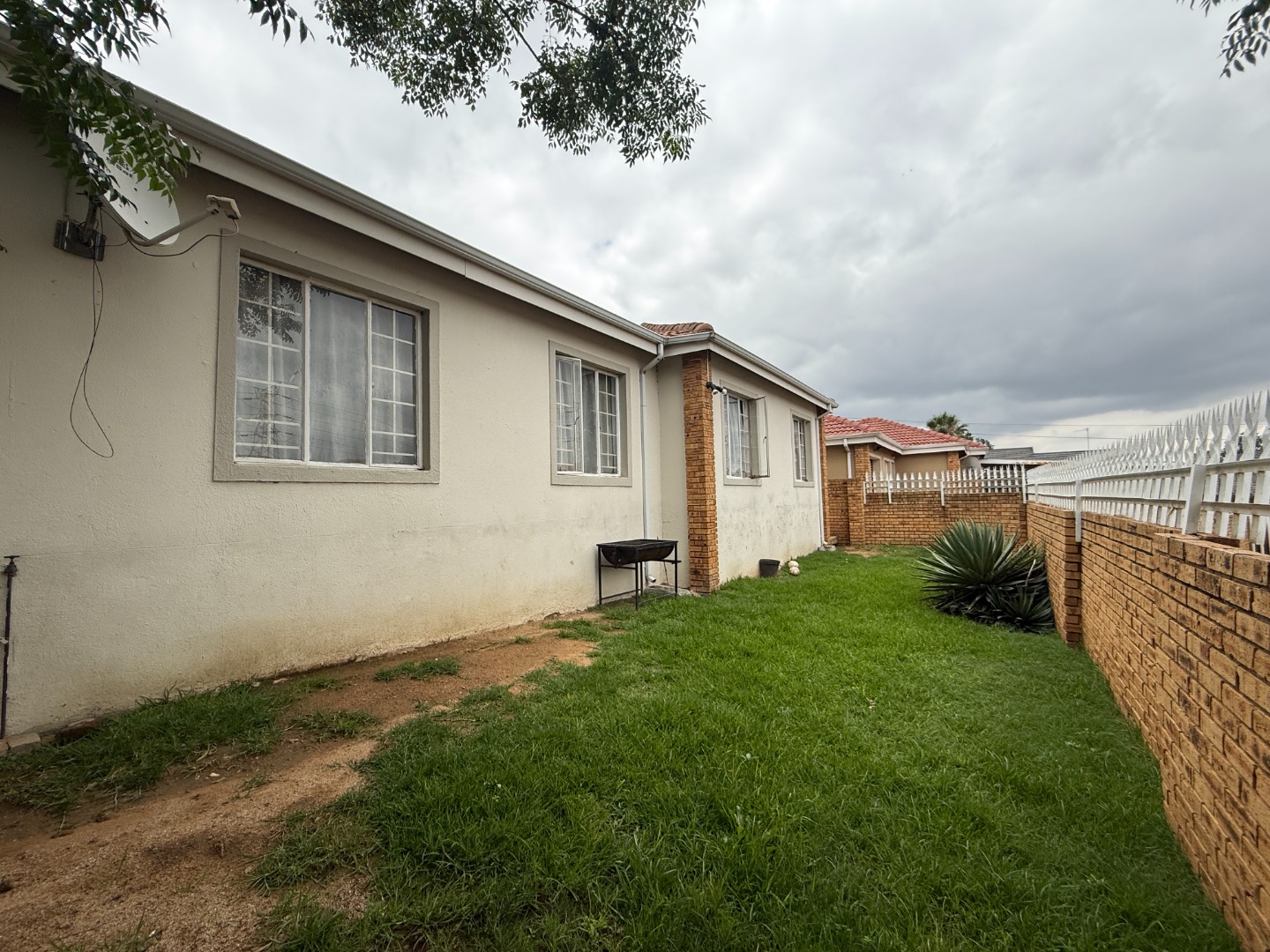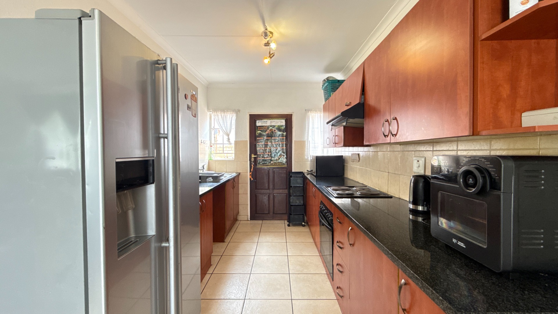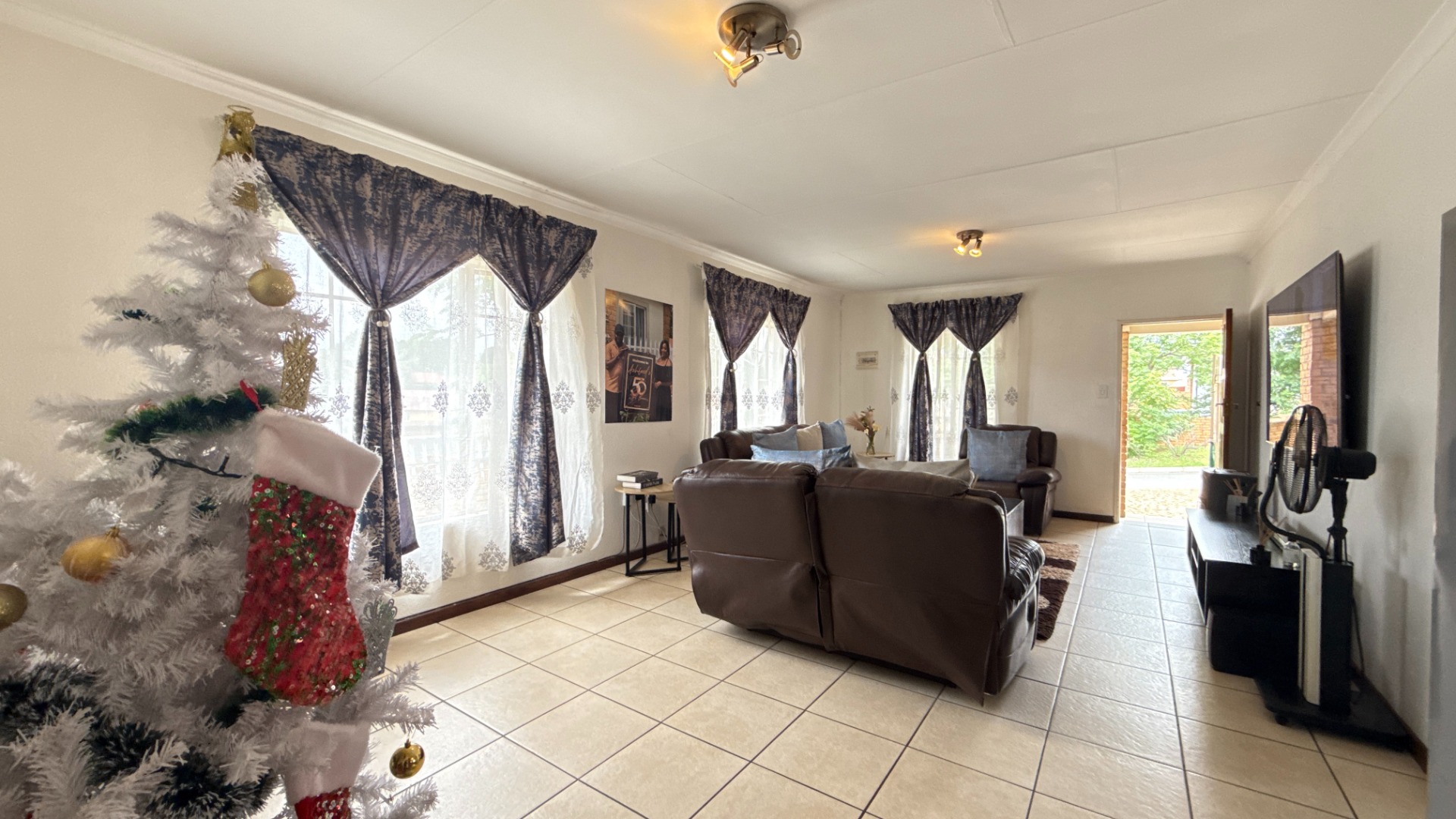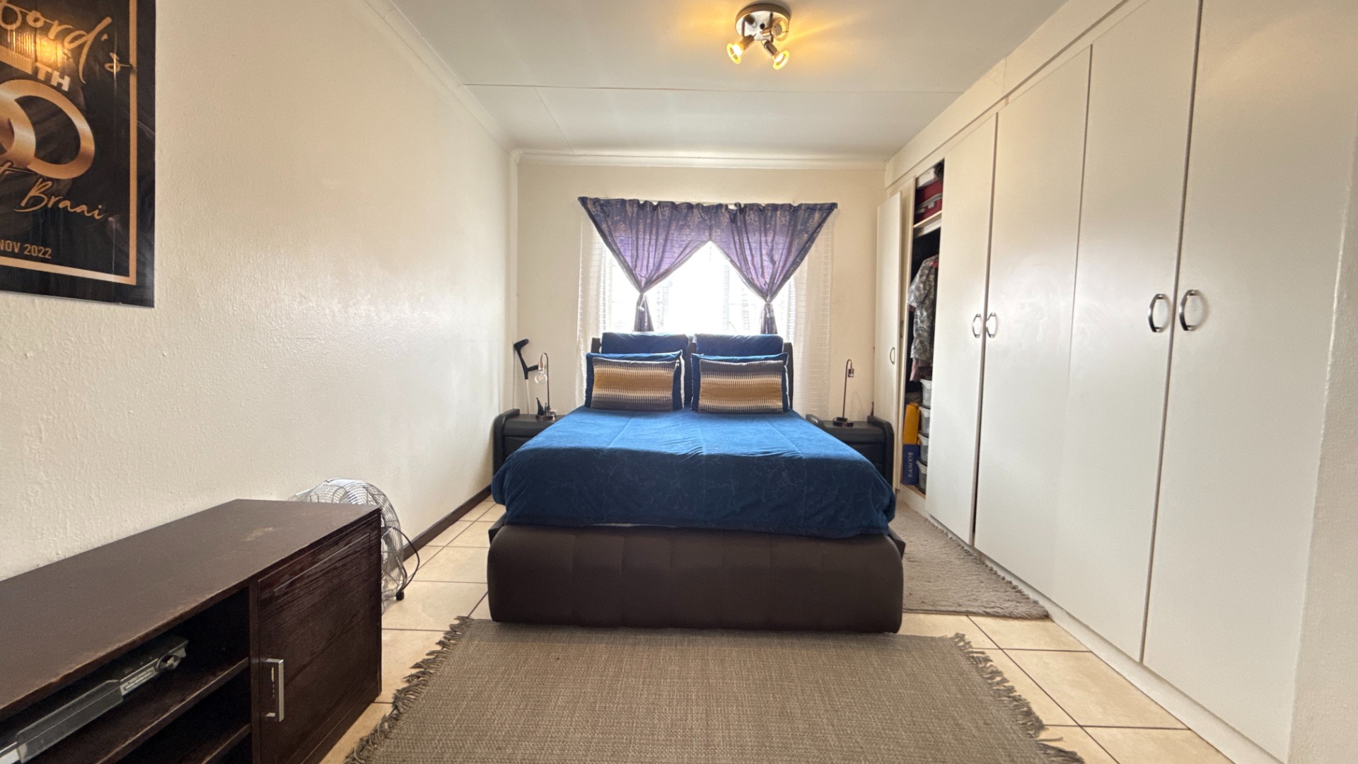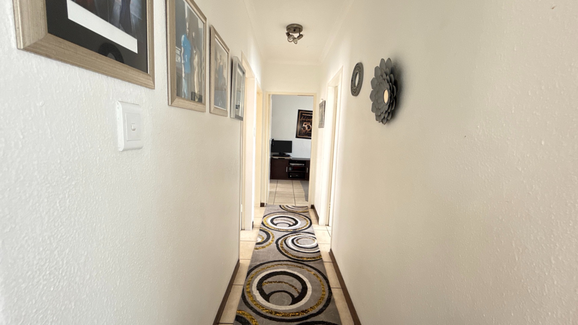All three bedrooms are bright and tiled, offering low-maintenance living. The main bedroom includes built-in cupboards, while the additional rooms are perfect for kids, guests or a home office. The home includes two bathrooms—one fitted with a bathtub and the other with a shower—providing practical flexibility for family living.