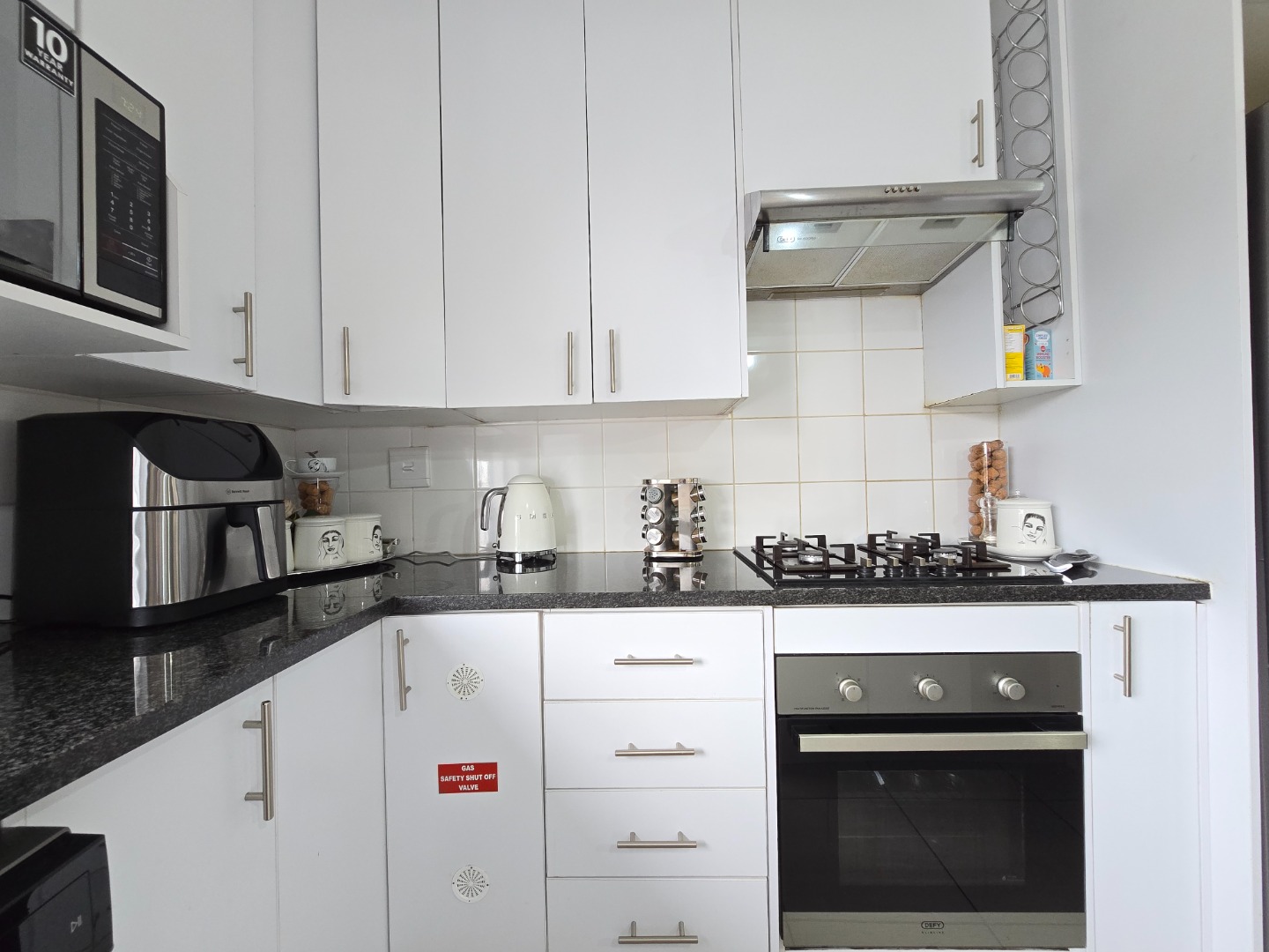 Upon entering, you are greeted by a beautifully designed kitchen, boasting ample cupboard space, sleek granite countertops, a 4-plate gas stove, oven, extractor unit, and dedicated spaces for both the microwave and fridge. At the centre of this functional kitchen is a stylish table illuminated by an elegant chandelier — perfect for casual dining or additional prep space.