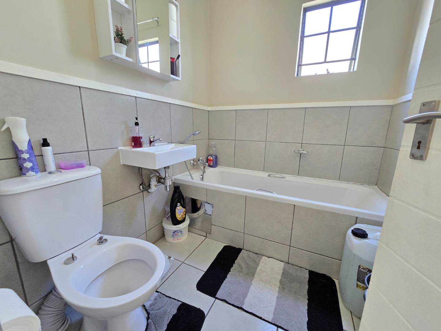 The home features two well-sized bedrooms—one with built-in cupboards, while the other offers a blank canvas for personalized storage solutions. A well-appointed bathroom, complete with a bathtub, toilet, and basin, serves both the bedrooms and guests.