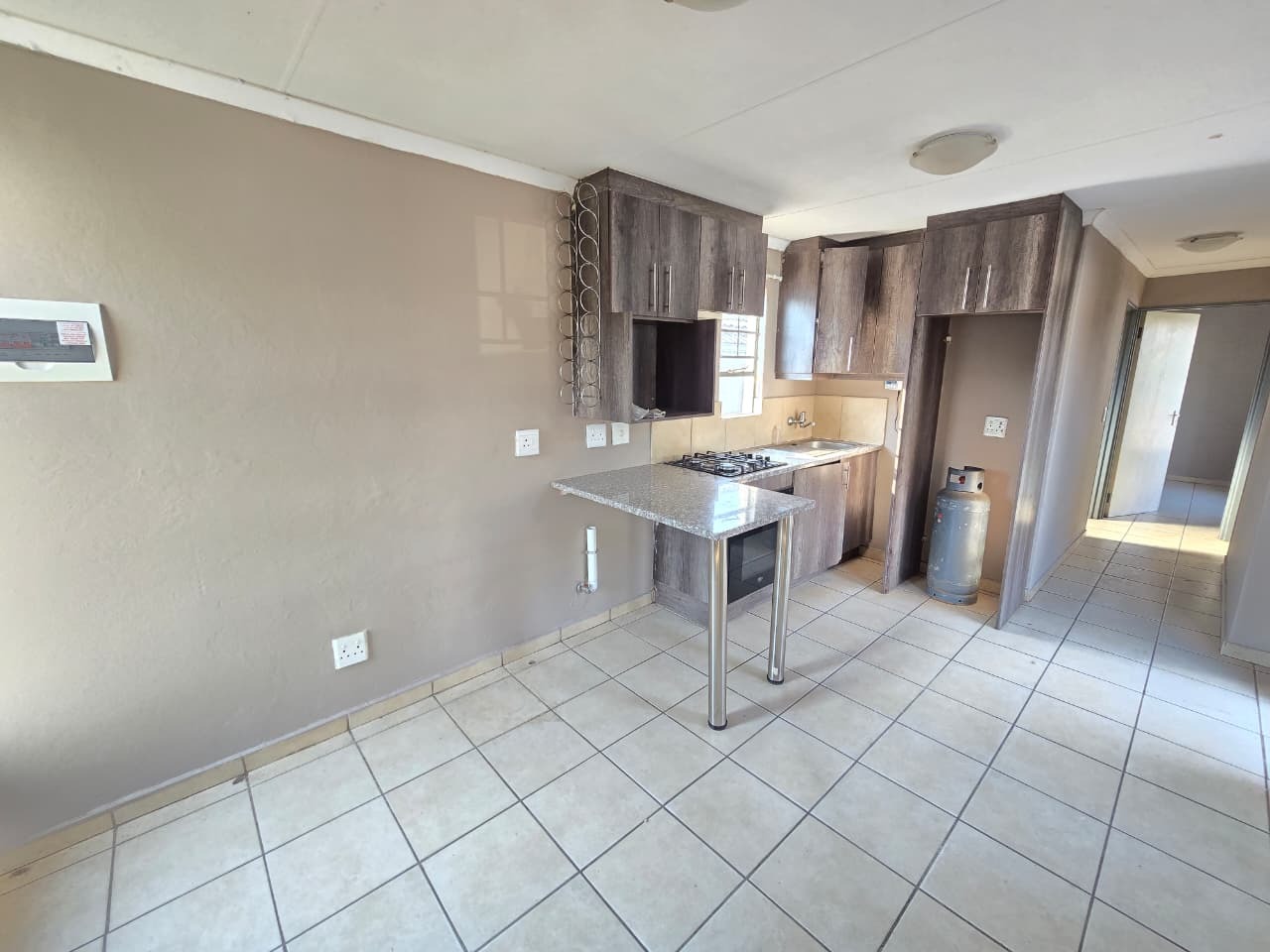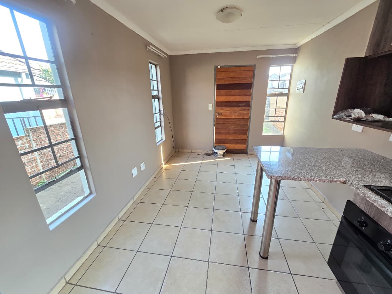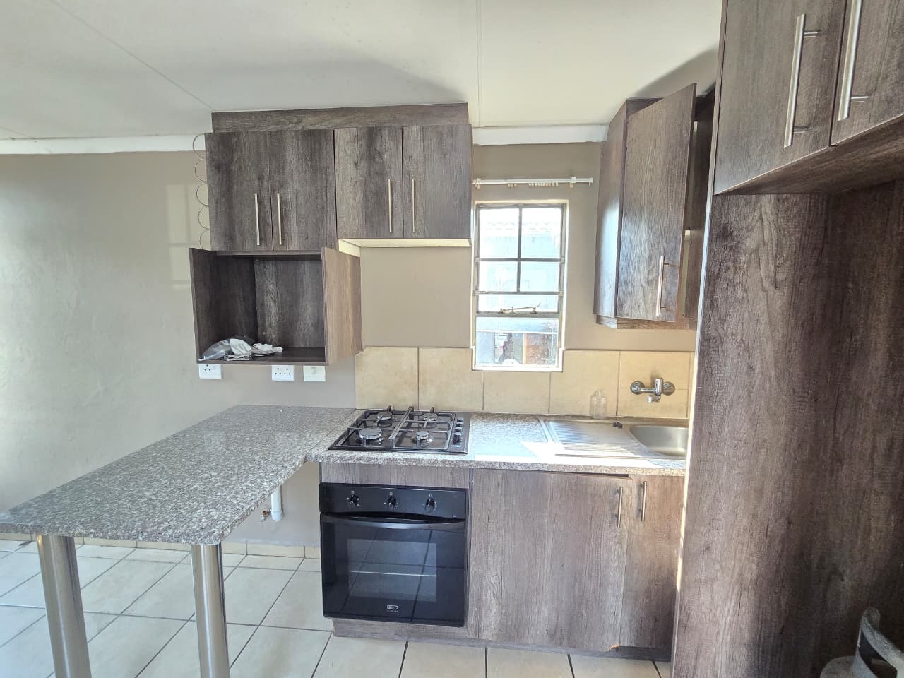 Upon entering the home, you are welcomed into a neat and functional living space that flows seamlessly into the modern kitchen. The kitchen is well designed with contemporary finishes, generous cupboard space, granite-style countertops, and a breakfast counter that doubles as a casual dining or work-from-home area. A fitted oven and hob complete this efficient, user-friendly space.