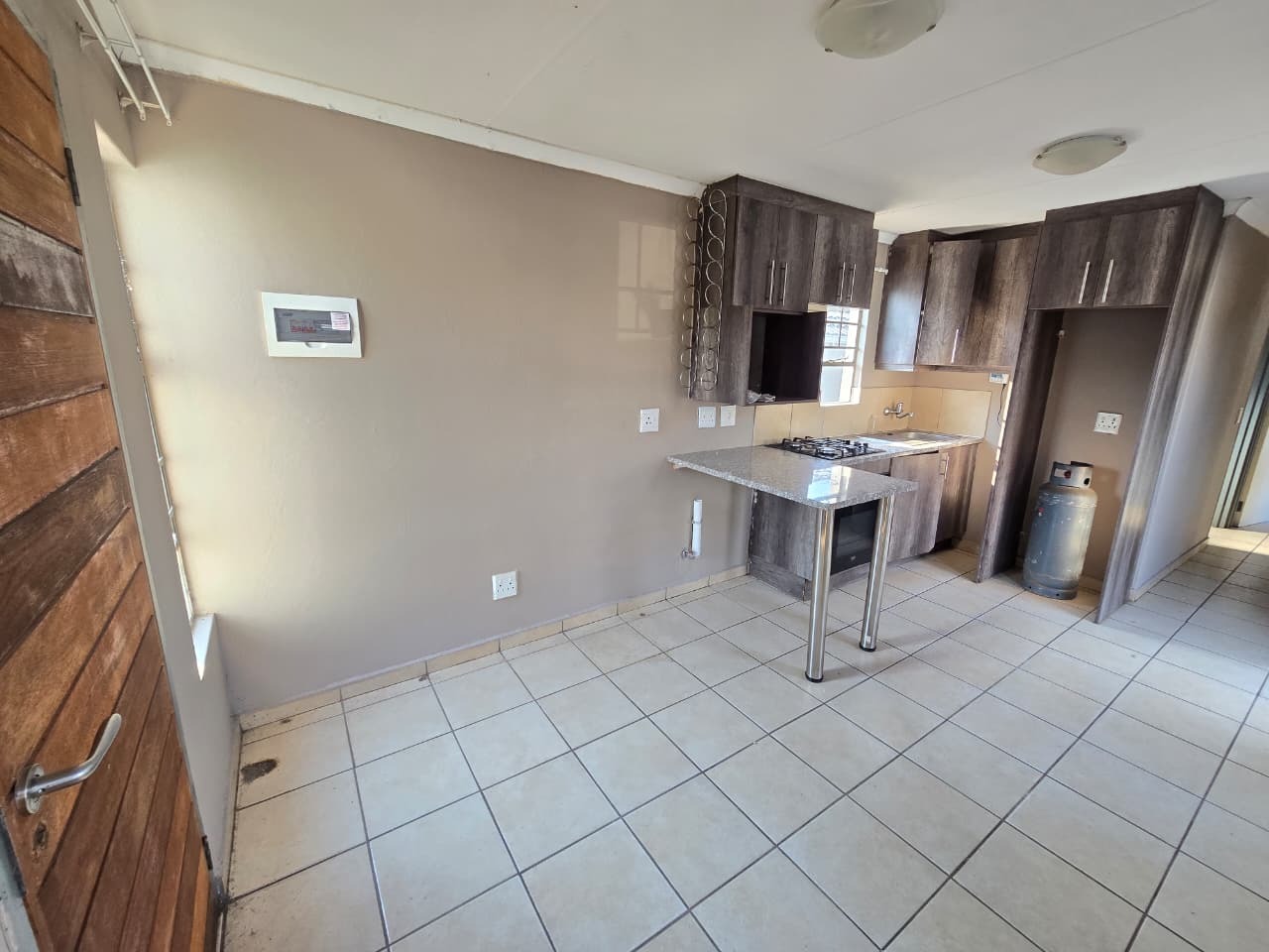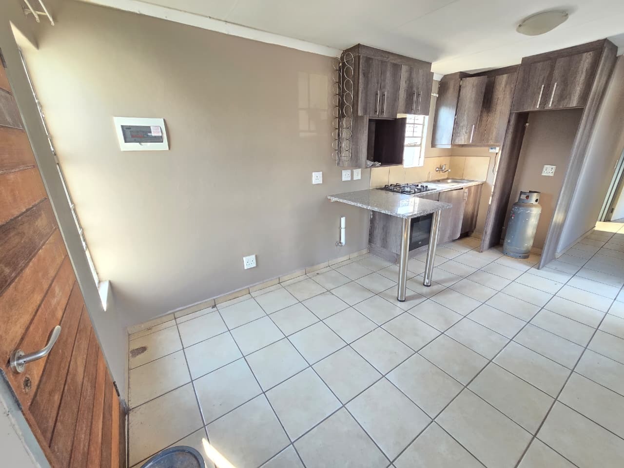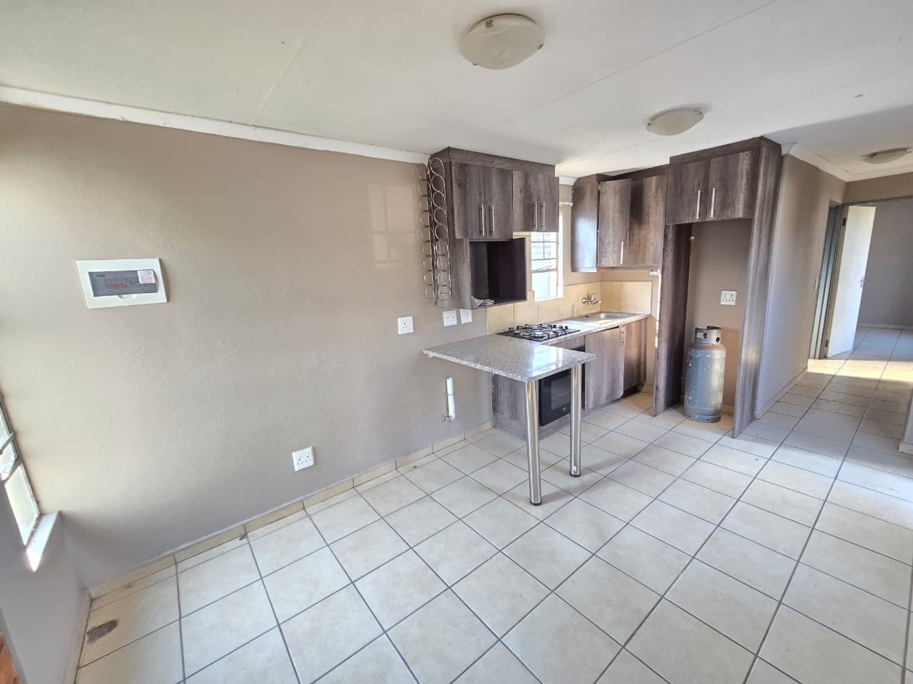 Upon entering the home, you are welcomed into a neat and functional living space that flows seamlessly into the modern kitchen. The kitchen is well designed with contemporary finishes, generous cupboard space, granite-style countertops, and a breakfast counter that doubles as a casual dining or work-from-home area. A fitted oven and hob complete this efficient, user-friendly space.
