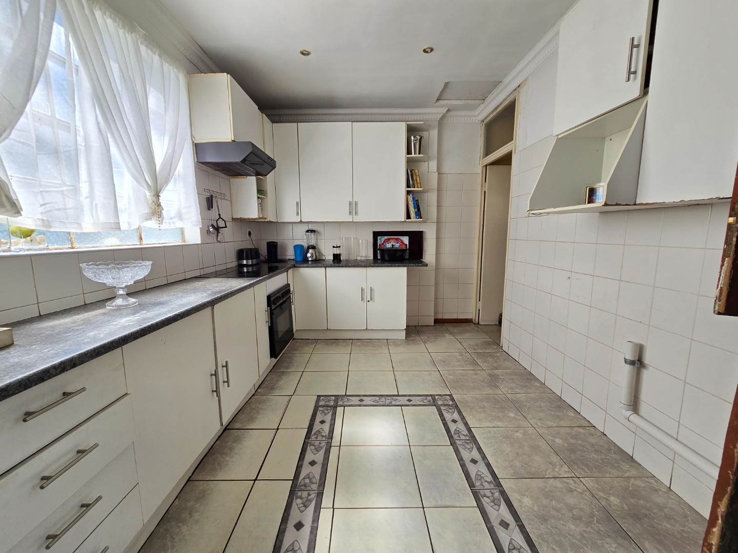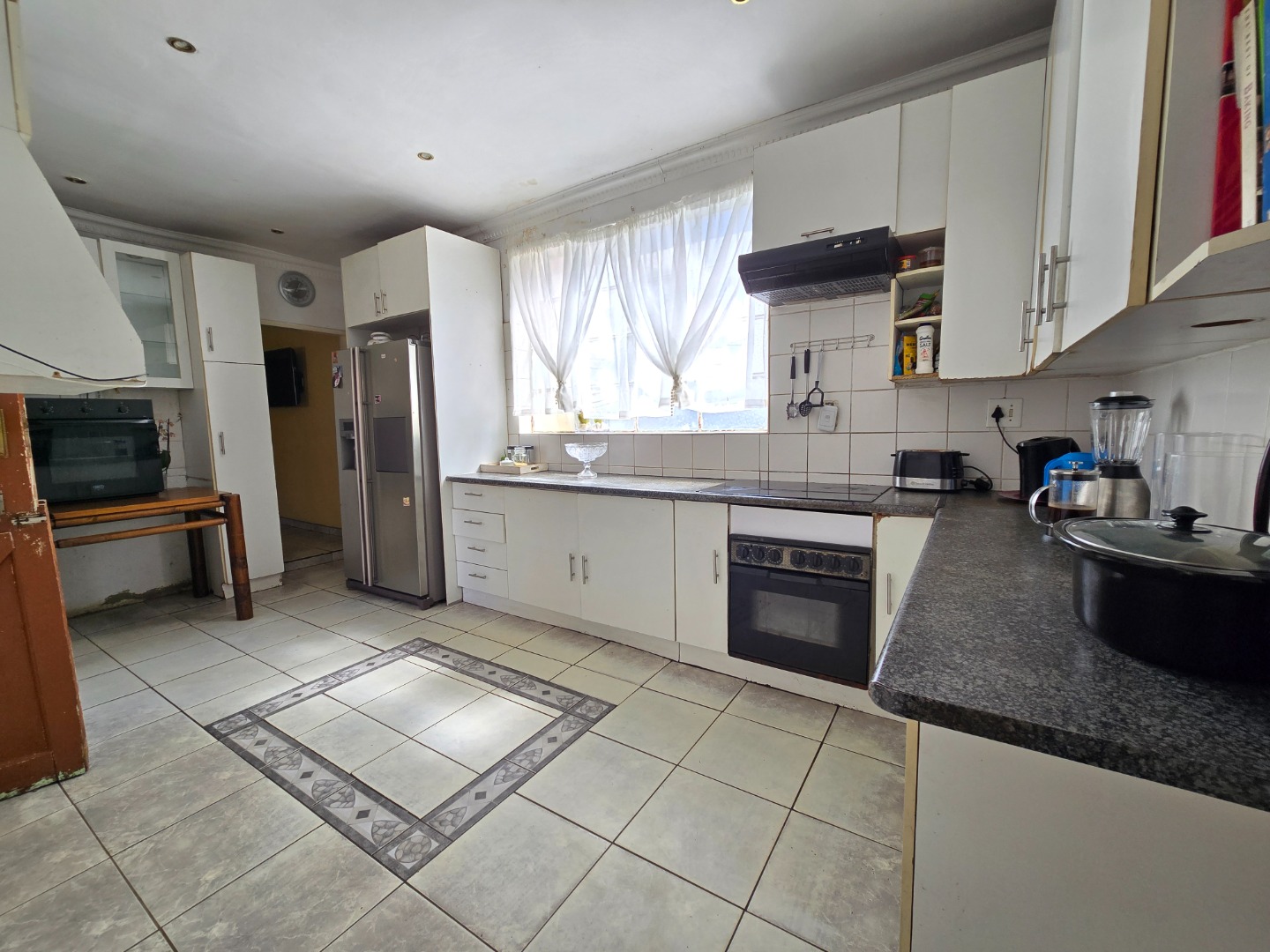 The kitchen is well equipped and functional, offering ample cupboard space, sleek counter tops, a 4-plate electric stove, oven, and extractor unit, along with a dedicated fridge cut-out space to ensure convenience and practicality.